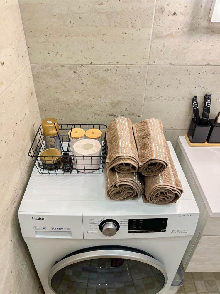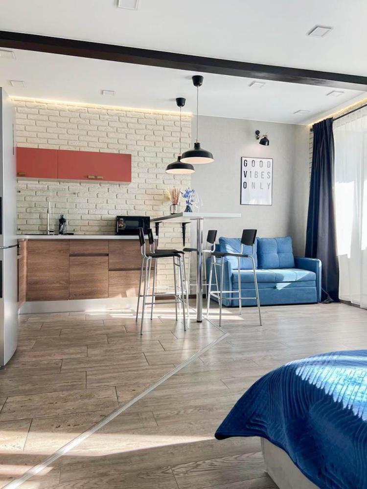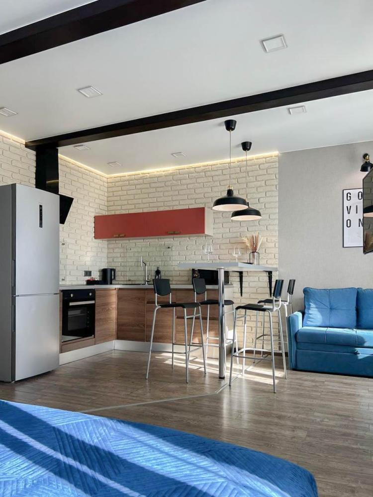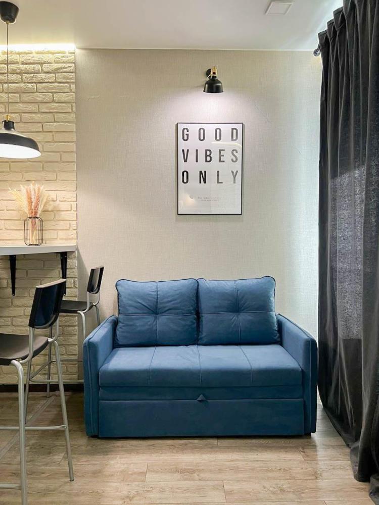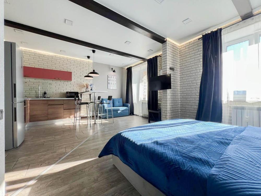 Уютные апартаменты студия, оборудованные всем необходимым для комфортного проживания. В апартаментах: удобная двуспальная кровать с ортопедическим матрасом, зона кухни со всей необходимой техникой и посудой, зона отдыха с диваном. В ванной все необходимые средствами личной гигиены, стиральная машина. Лоджия с видом с 15 этажа на весь город.