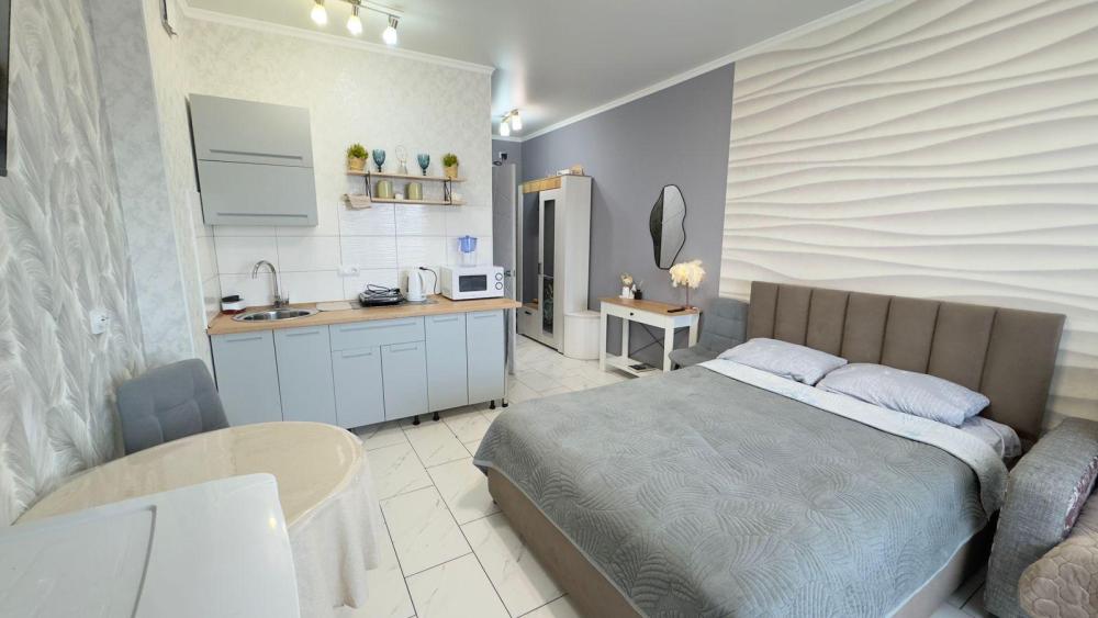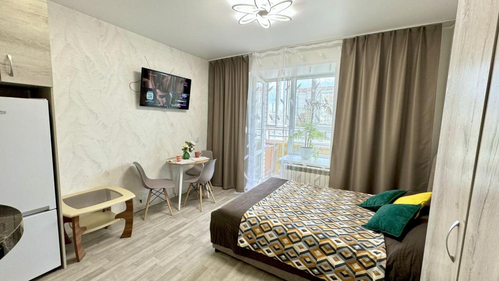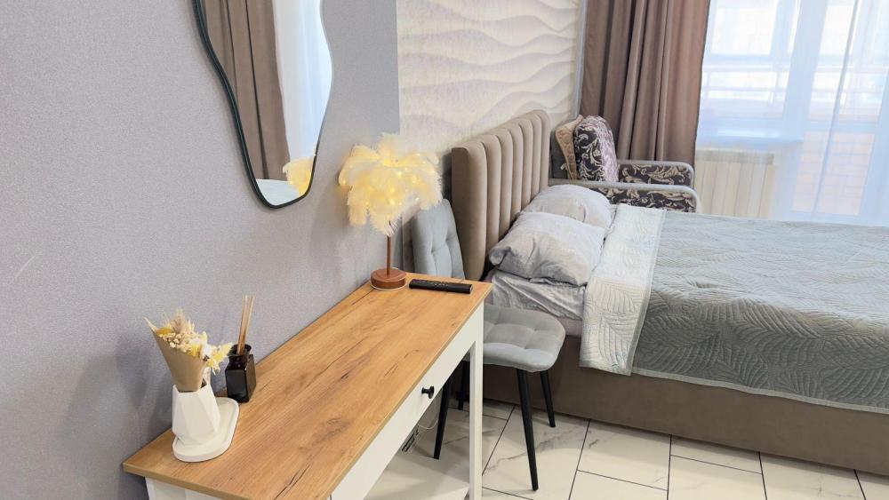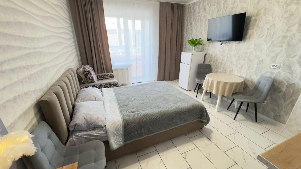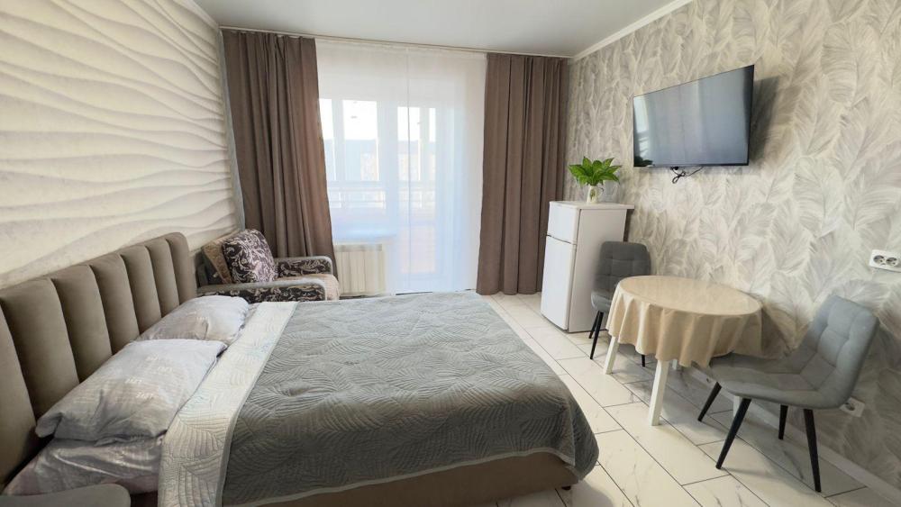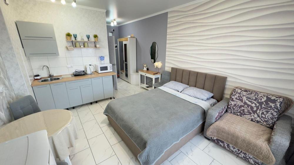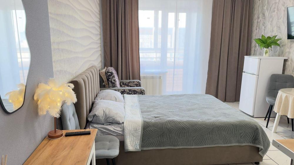 Уютные апартаменты оборудованные всем необходимым для комфортного проживания. Спальные места: двуспальная кровать, кресло-кровать. Оснащение: Телевизор 42 диагональ -андроид, холодильник, плита электрическая одноконфорочная индукция, стол и стулья, консольный столик, зеркала, в ванной с подсветкой, фильтр для питьевой воды Барьер, посуда, фен, постельные комплекты полусинтетика, имеется один хлопковый, элементы декора, стиральная машинка автомат.