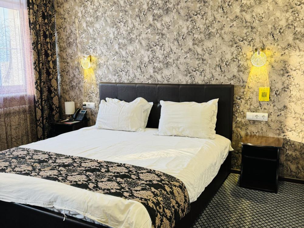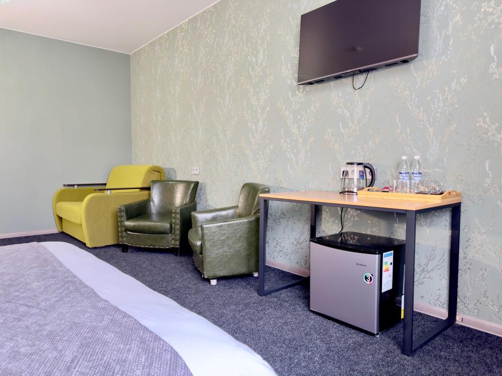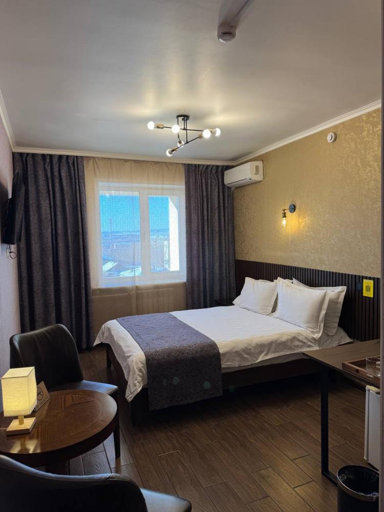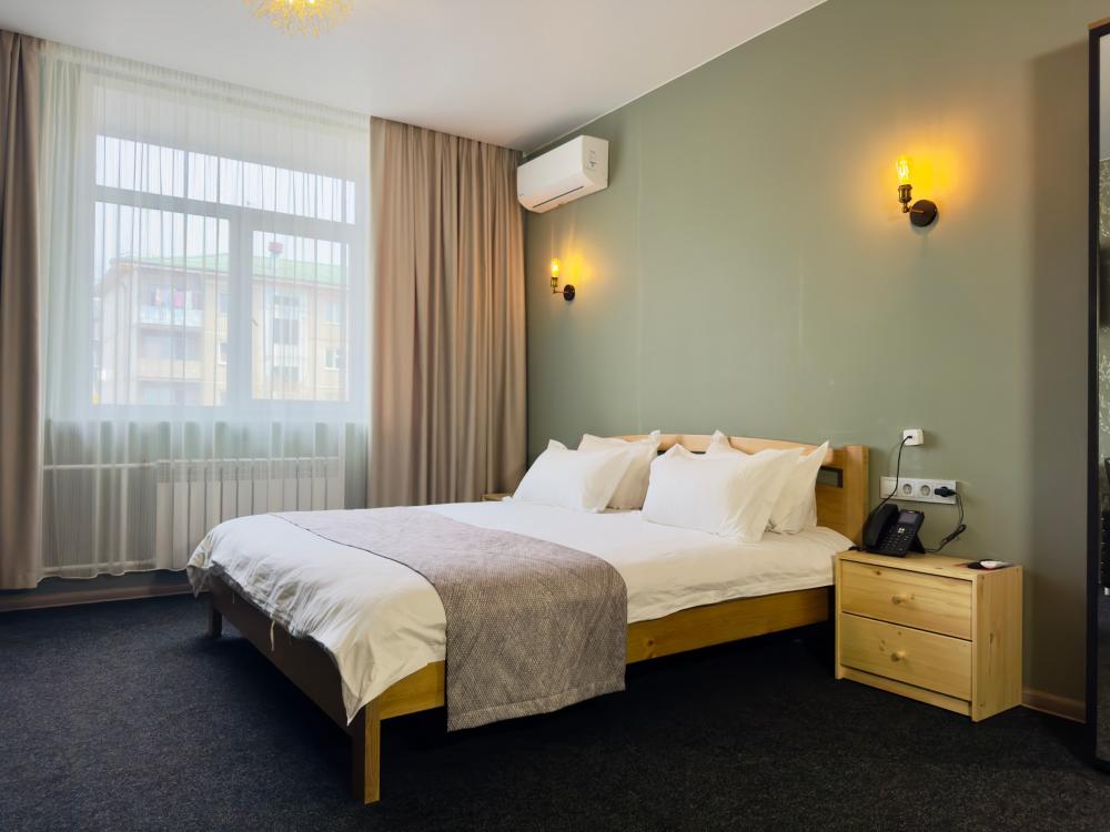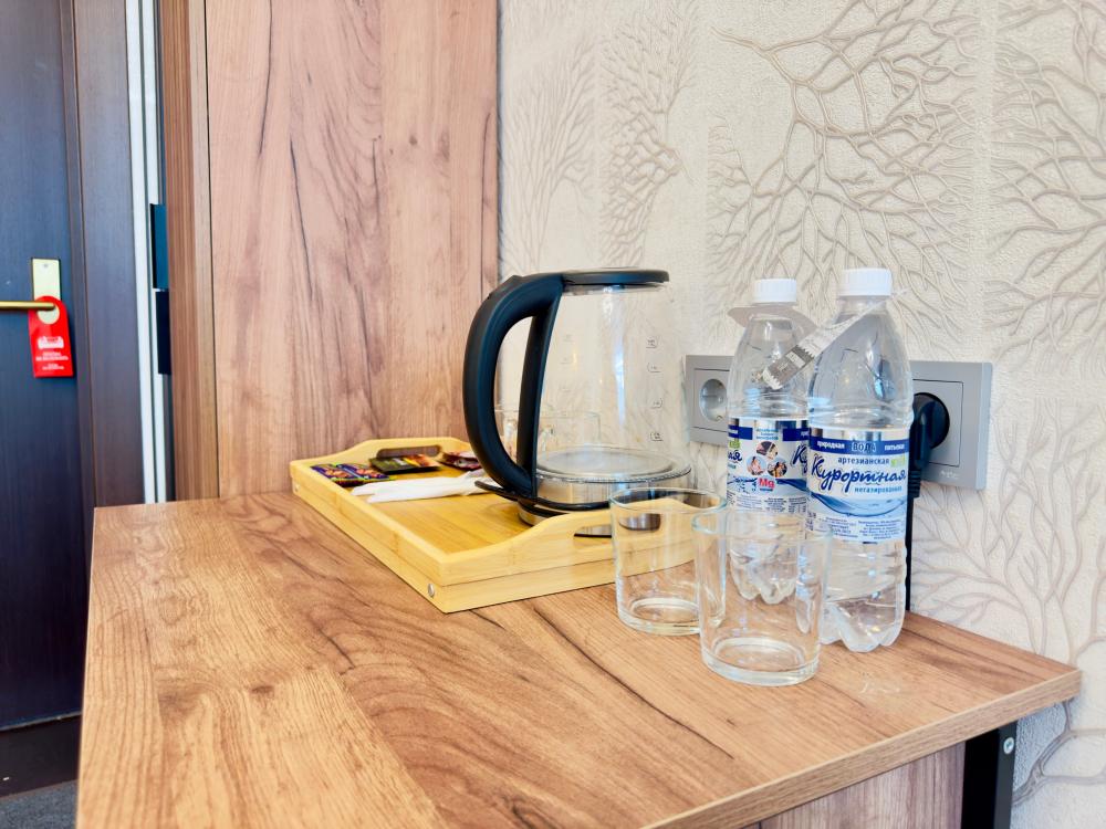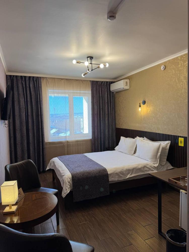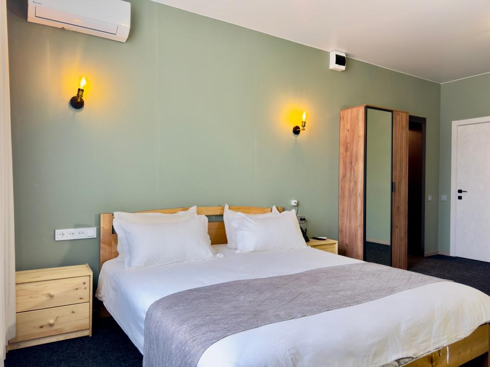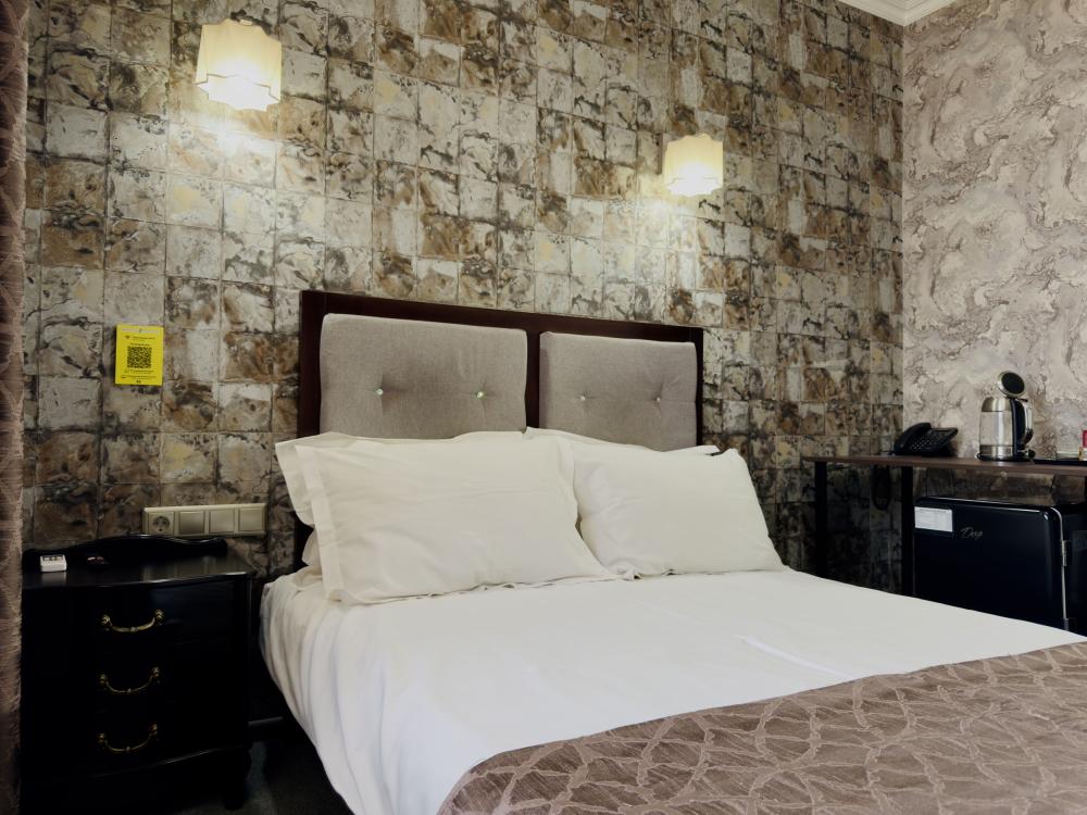 Улучшенный номер стандарт: двуспальная кровать гигиенические принадлежности, вода в бутылках в подарок, одноразовые тапочки, мини-бар, чайник, Wi-Fi махровые халаты кондиционер чайный и кофейный наборы