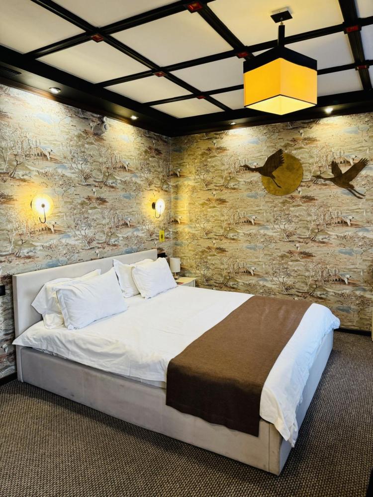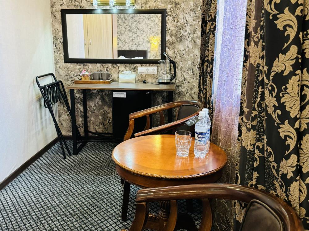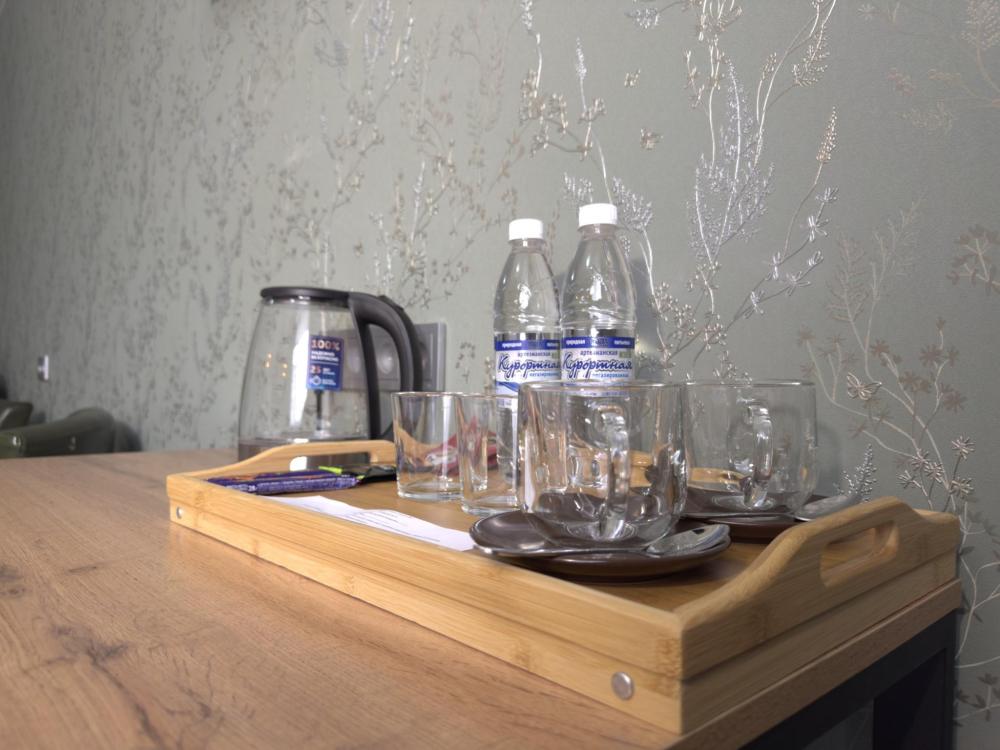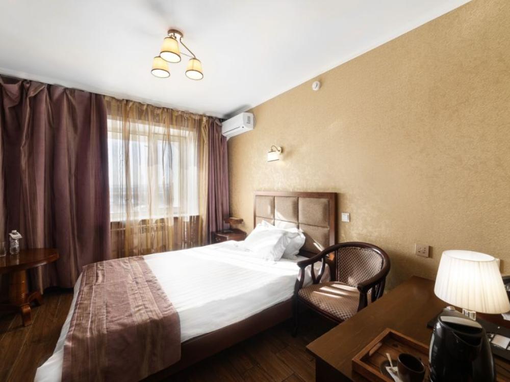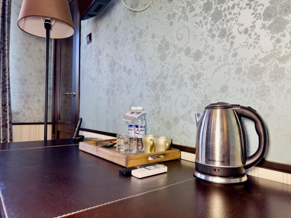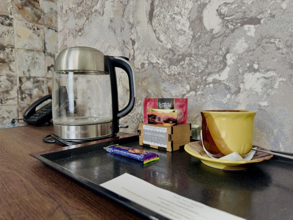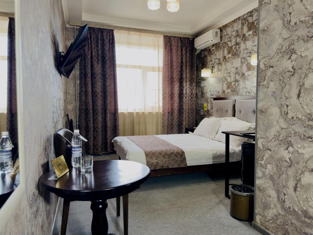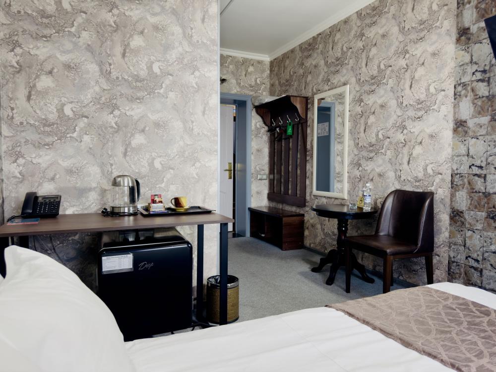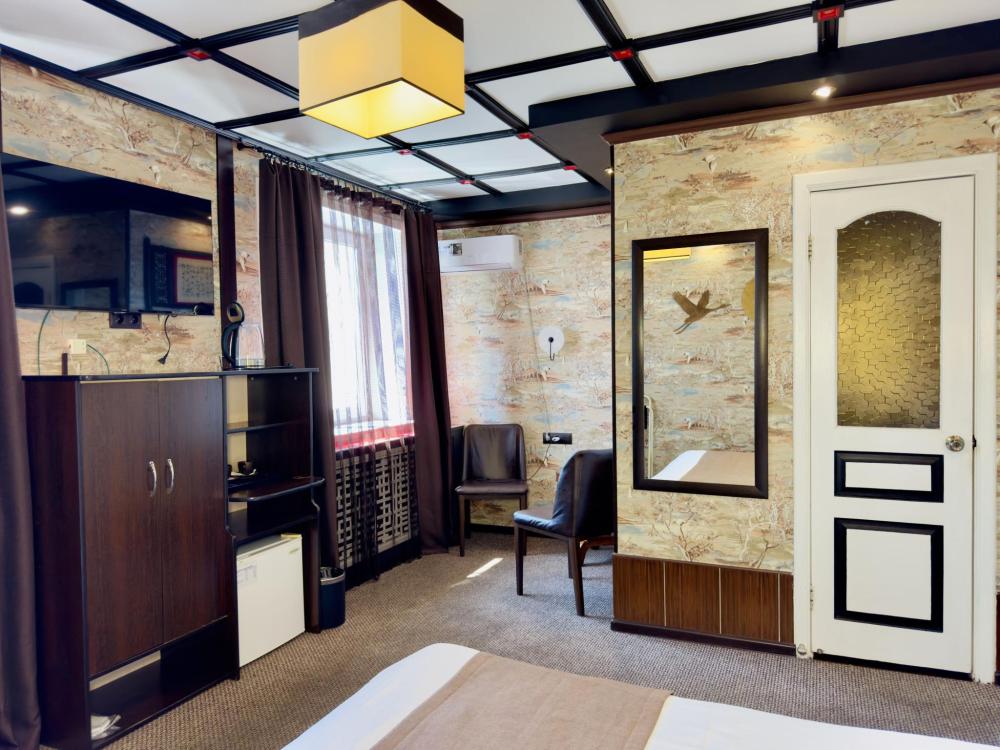 Улучшенный номер стандарт: двуспальная кровать гигиенические принадлежности, вода в бутылках в подарок, одноразовые тапочки, мини-бар, чайник, Wi-Fi махровые халаты кондиционер чайный и кофейный наборы