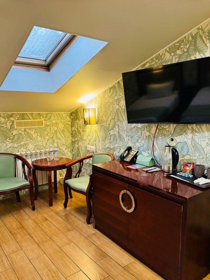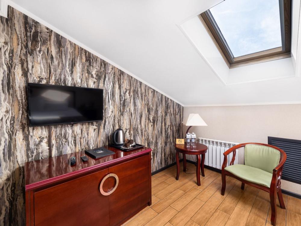 Мансардный номер: — гигиенические принадлежности — вода в бутылках в подарок — индивидуальный сейф — одноразовые тапочки — кабельное TV — кондиционер — мини-бар — чайник — душ — фен — Wi-Fi — чайные и кофейные наборы