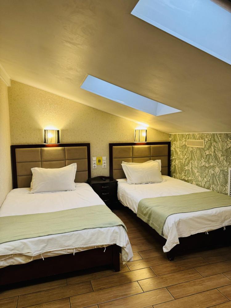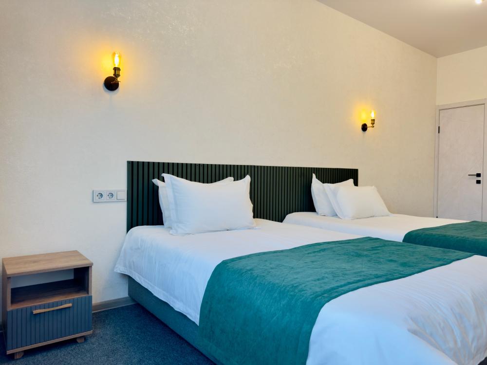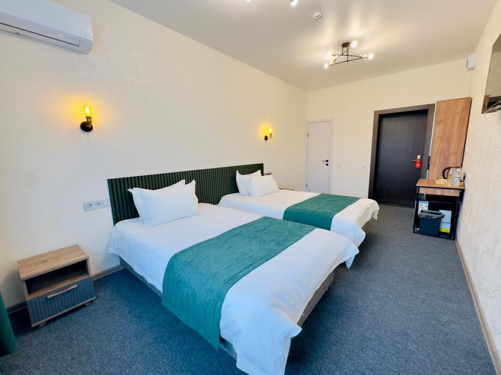 Эконом номер с 2-мя односпальными кроватями. — гигиенические принадлежности — мини-бар — чайник — Wi-Fi — Телевизор с кабельным TV — Махровые халаты —Чайный и кофейный наборы — Бутилированая вода