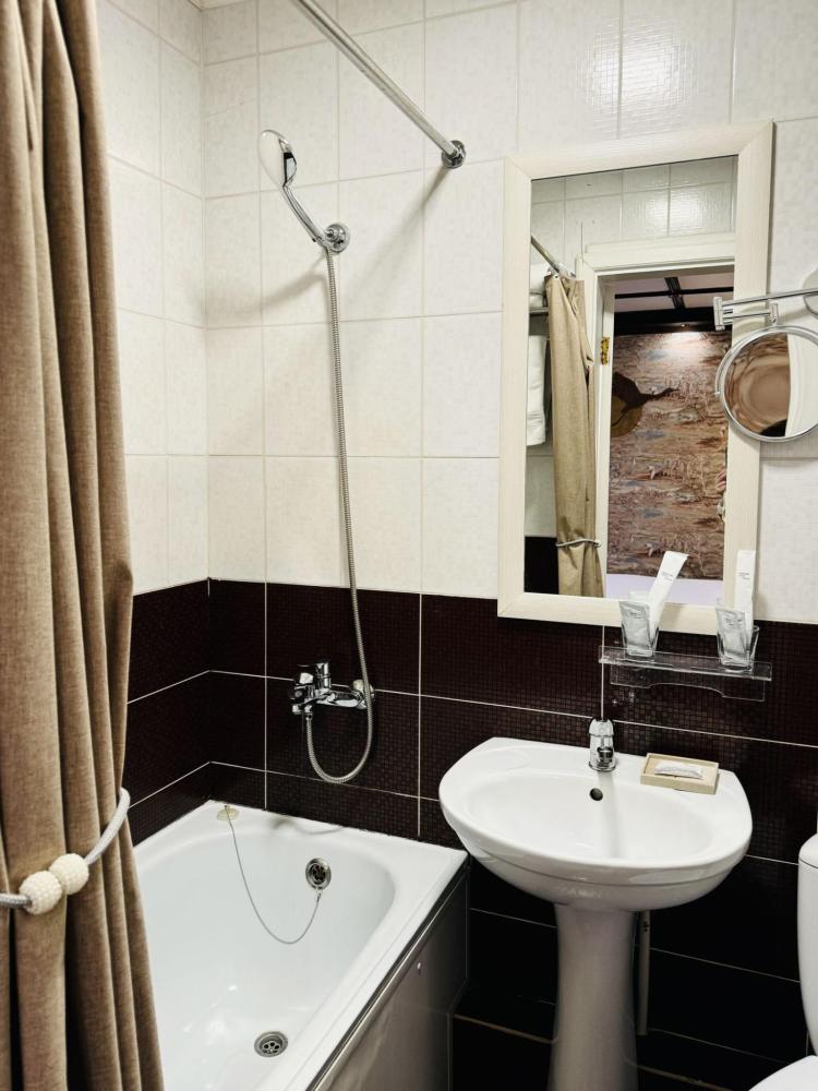 НОМЕР с двуспальной кроватью: — гигиенические принадлежности — вода в бутылках в подарок — одноразовые тапочки — мини-бар — чайник — душ — фен — Wi-Fi __Халат —кондиционер — Чайный и кофейный наборы