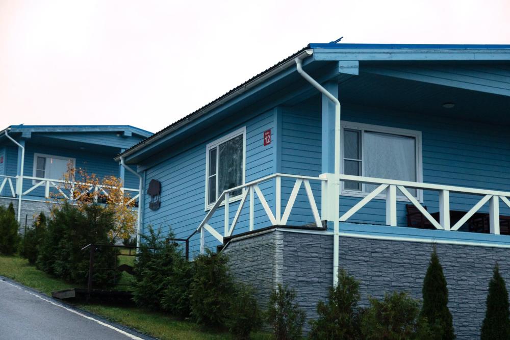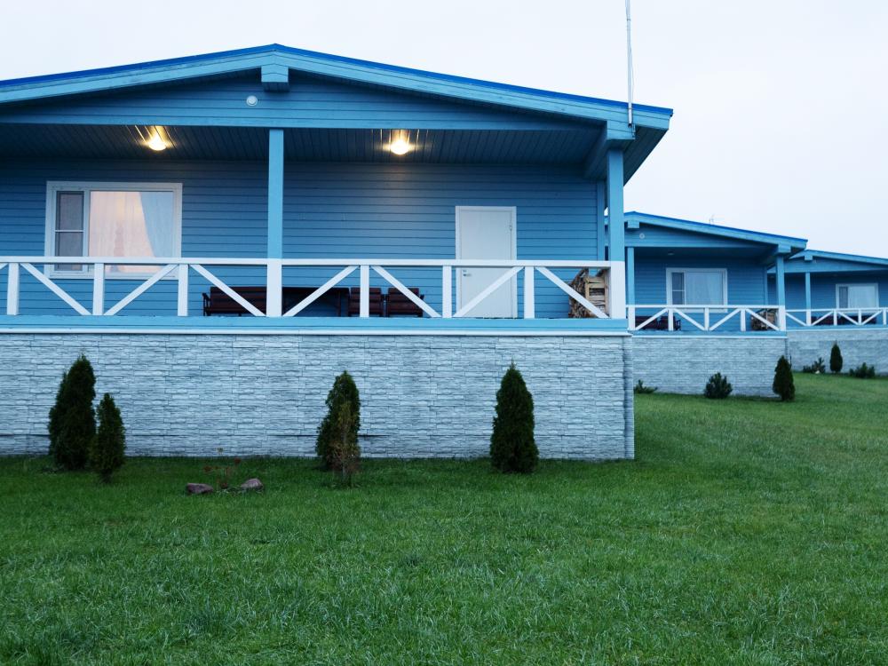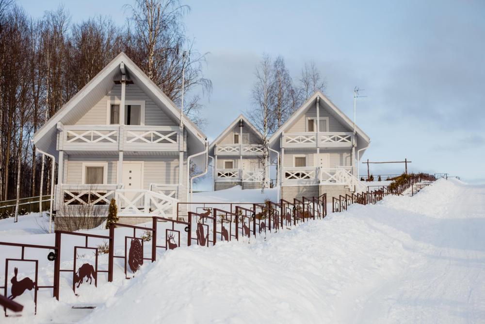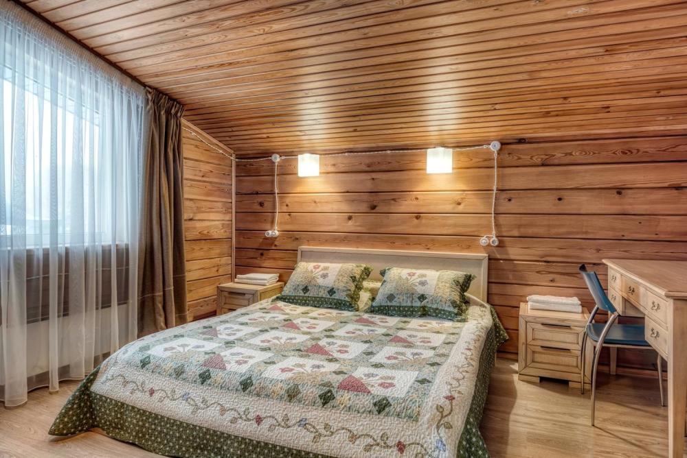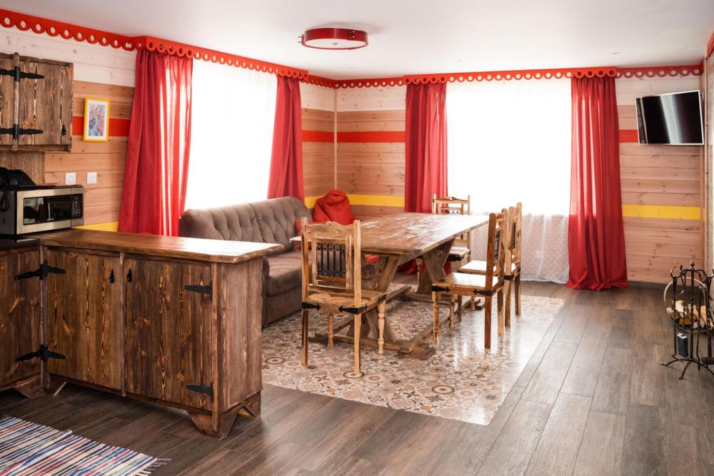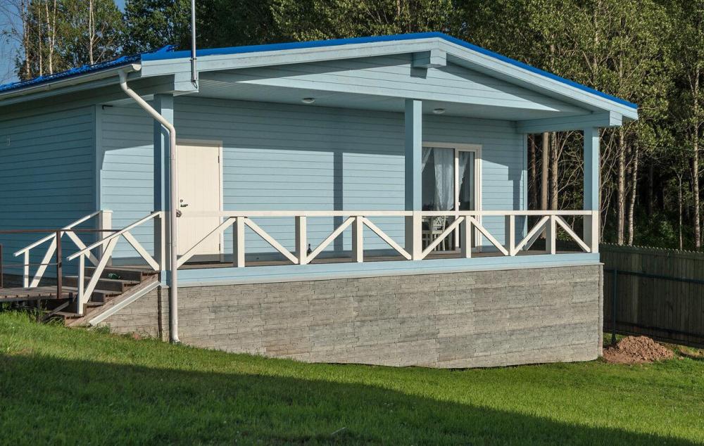 Уютный двухэтажный дом, площадью 45 м2 с отделкой из натуральной древесины. На первом этаже: гостиная с мягким диваном и ЖК-телевизором, мини-бар, кухня, оснащенная микроволновой печью, холодильником, электрочайником, капсульной кофемашиной и сервировочной посудой. также на первом этаже находится санузел. На втором этаже - спальня с тремя односпальными кроватями. В этом доме есть небольшая терраса, а из спальни можно выйти на просторный балкон.