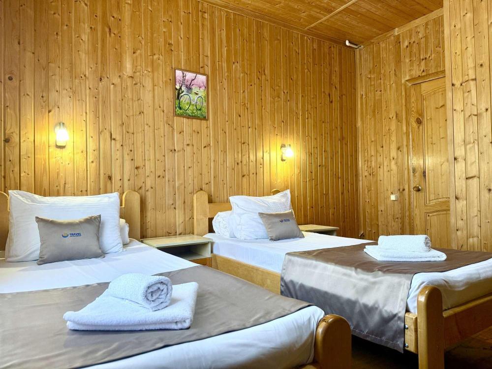 Уютный однокомнатный номер на 4х (возможно дополнительное место - еврораскладушка) , оборудованный всем необходимым для комфортного проживания. Из окна открывается потрясающий вид на горы. В распоряжении Гостей: ᅳ ванная комната (душ/туалет/раковина) ᅳ 4 односпальные кровати ᅳ необходимые косметические и гигиенические средства (шампунь, мыло, гель) ᅳ необходимый комплект домашнего текстиля ᅳ телевизор ᅳ холодильник ᅳ фен (на рецепшне)
