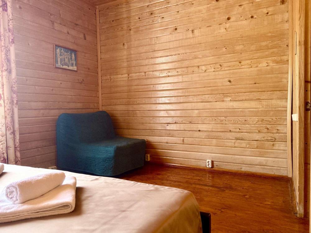 Уютная комната на 3-х гостей, оборудована всем необходимым для комфортного проживания. В распоряжении Гостей: ᅳ ванная комната (душ/туалет/раковина), ᅳ одна 2-спальная кровать и тахта, ᅳ необходимые косметические и гигиенические средства (шампунь, мыло, гель), ᅳ необходимый комплект домашнего текстиля, ᅳ телевизор, ᅳ холодильник, ᅳ фен (на ресепшене). Дополнительные услуги: - русская баня/чан под открытым небом— 2000 руб/час, не менее 2-х часов - беседки на территории — бесплатно - мангал — бесплатно - дрова — 1 вязанка 250 руб - рыбалка — аренда удочки - 500 руб в день, выловленная рыба — 250 руб за кг (при ловле на свою удочку оплата выловленной рыбы также 250 руб за кг) - аренда ракеток для настольного тенниса - 500 руб/час - утюг — бесплатно в общем доступе - экскурсии - по прайсу