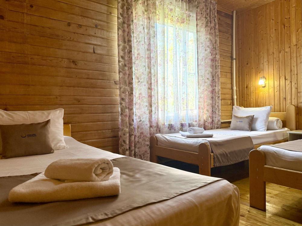 Уютная комната на 3-х гостей, оборудована всем необходимым для комфортного проживания. Окно выходит на общий балкон. В распоряжении Гостей: ᅳ ванная комната (душ/туалет/раковина) ᅳ одна 2-спальная кровать и 1 односпальная кровать ᅳ необходимые косметические и гигиенические средства (шампунь, мыло, гель) ᅳ необходимый комплект домашнего текстиля ᅳ телевизор ᅳ холодильник ᅳ фен (на ресепшене). Дополнительные услуги: - русская баня/чан под открытым небом— 2000 руб/час, не менее 2-х часов - беседки на территории — бесплатно - мангал — бесплатно - дрова — 1 вязанка 250 руб - рыбалка — аренда удочки - 500 руб в день, выловленная рыба — 250 руб за кг (при ловле на свою удочку оплата выловленной рыбы также 250 руб за кг) - аренда ракеток для настольного тенниса - 500 руб/час - утюг — бесплатно в общем доступе - экскурсии - по прайсу