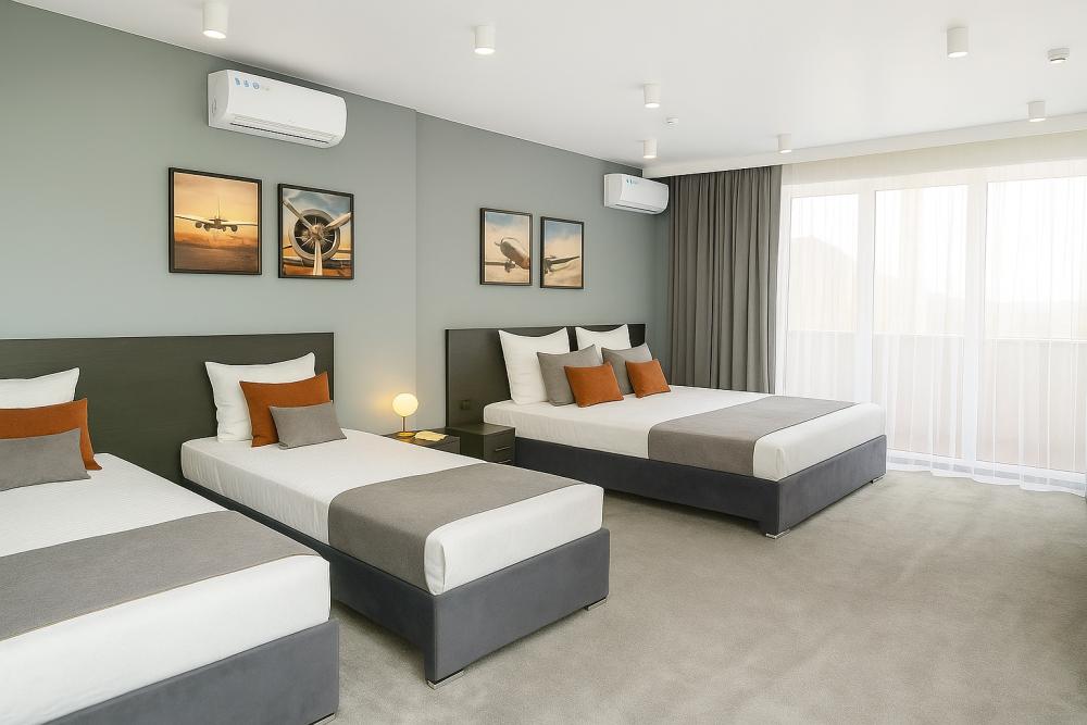 Номер стандарт трехместный общей площадью 22 кв.м. В номере: три односпальные кровати, прикроватные тумбочки, шкаф, телевизор, кондиционер, холодильник, чайник, ванная комната с душем, набор полотенец, туалетно-гигиенические принадлежности.