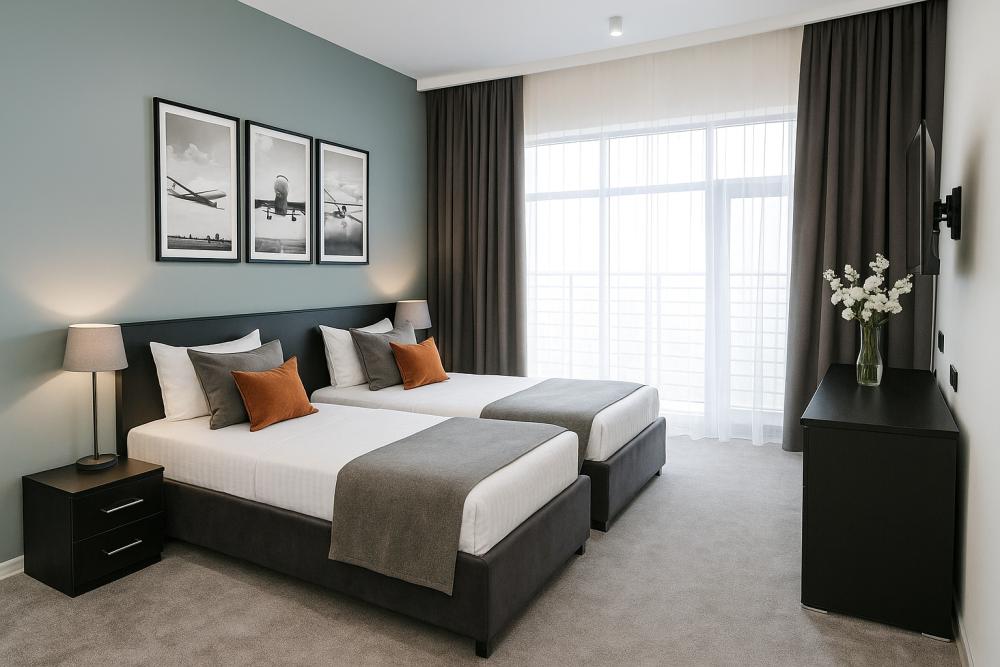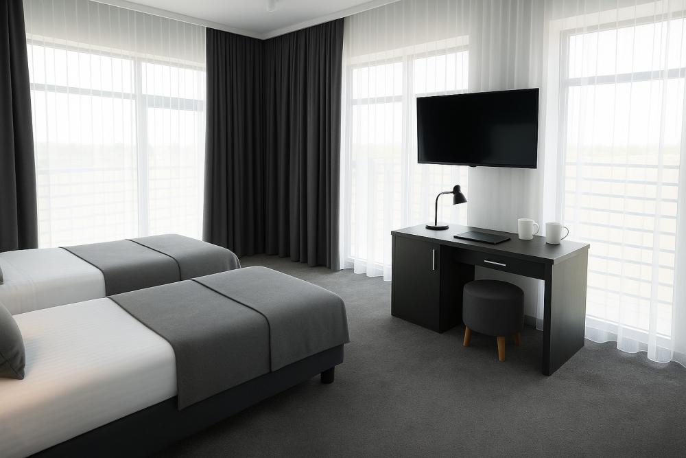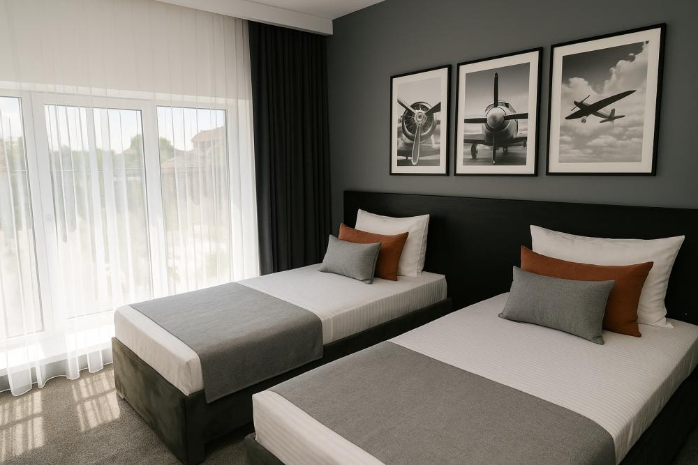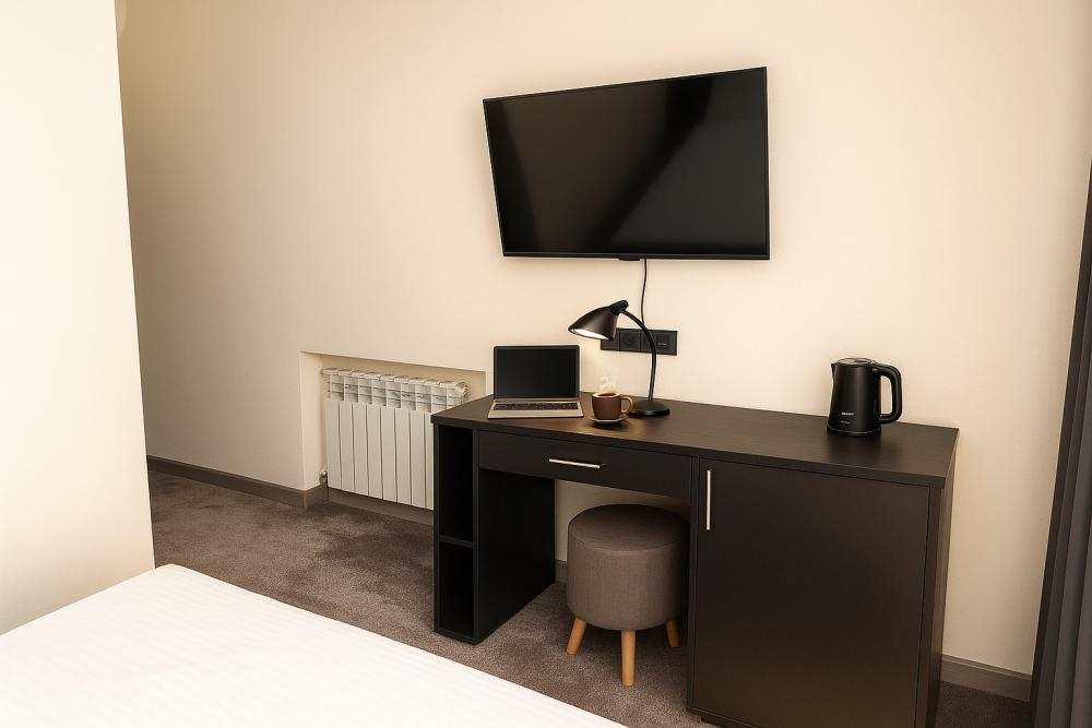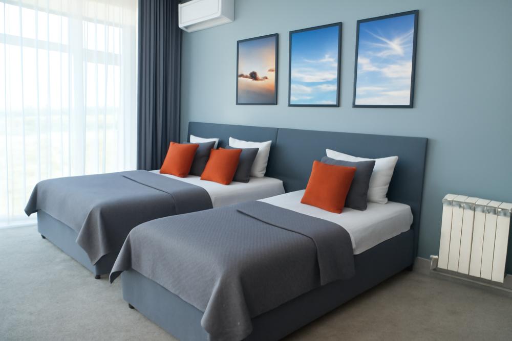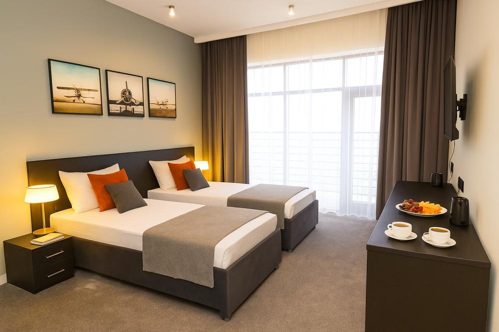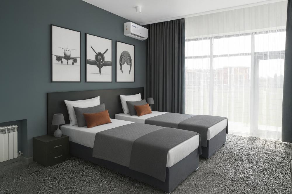 Номер стандарт с двумя односпальными кроватями общей площадью 18 кв.м. для размещения до 2-х гостей. В номере: две односпальные кровати, прикроватные тумбочки, шкаф, телевизор, кондиционер, холодильник, чайник, ванная комната с душем, набор полотенец, туалетно-гигиенические принадлежности.