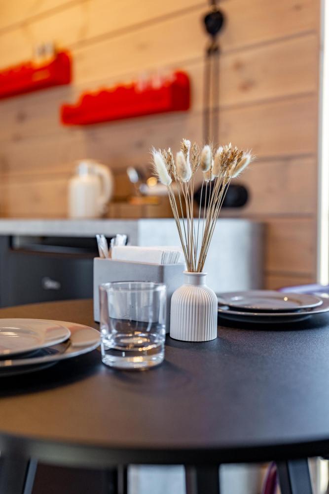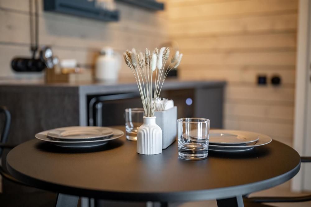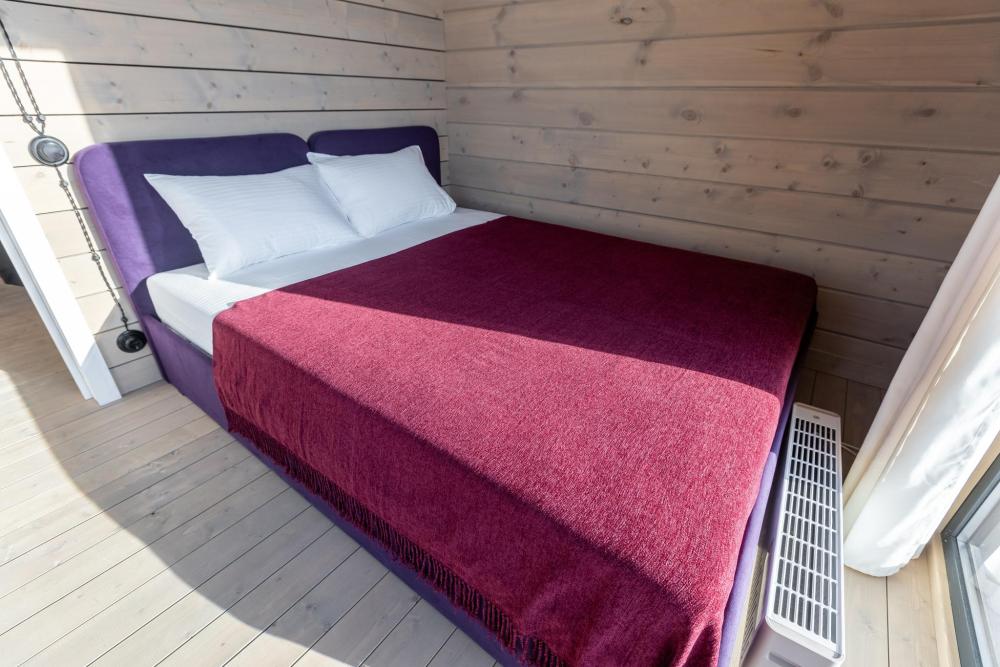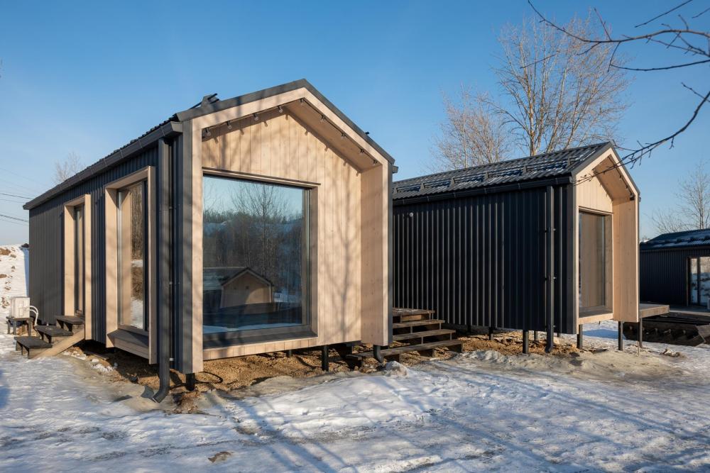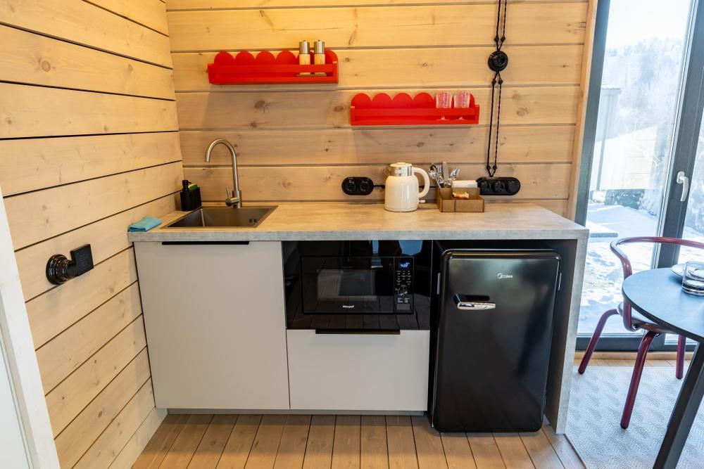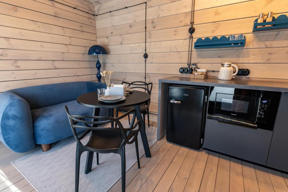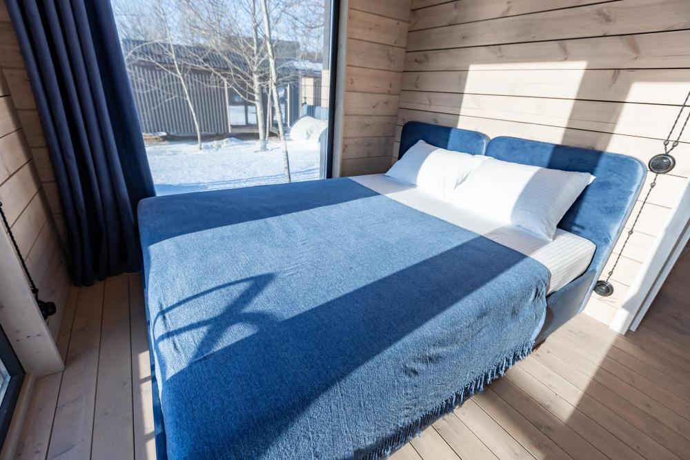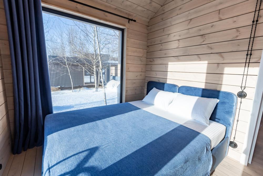 Внутри домиков просторные помещения с деревянной отделкой, хорошим освещением и всем необходимым для комфортного проживания. В каждом домике: две спальни, кухня-гостиная и терраса с видом на озеро. Двуспальная кровать 160×190, две односпальные кровати 80×190. Мини-кухня с индукционной плитой, микроволновой печью, компактным холодильником. Также чайная станция с набором посуды, тостер. Кондиционер, смарт-ТВ, умная колонка с голосовым помощником Алисой, фен, отпариватель для одежды. Каждый домик оснащён панорамным остеклением в пол, с потрясающим видом на озеро. Каминной печью для атмосферных и уютных вечеров. Удобной, стильной мебелью. Постельным бельем и полотенцами. Идеально подходит для отдыха семьёй или небольшой компанией (4-6 человек).