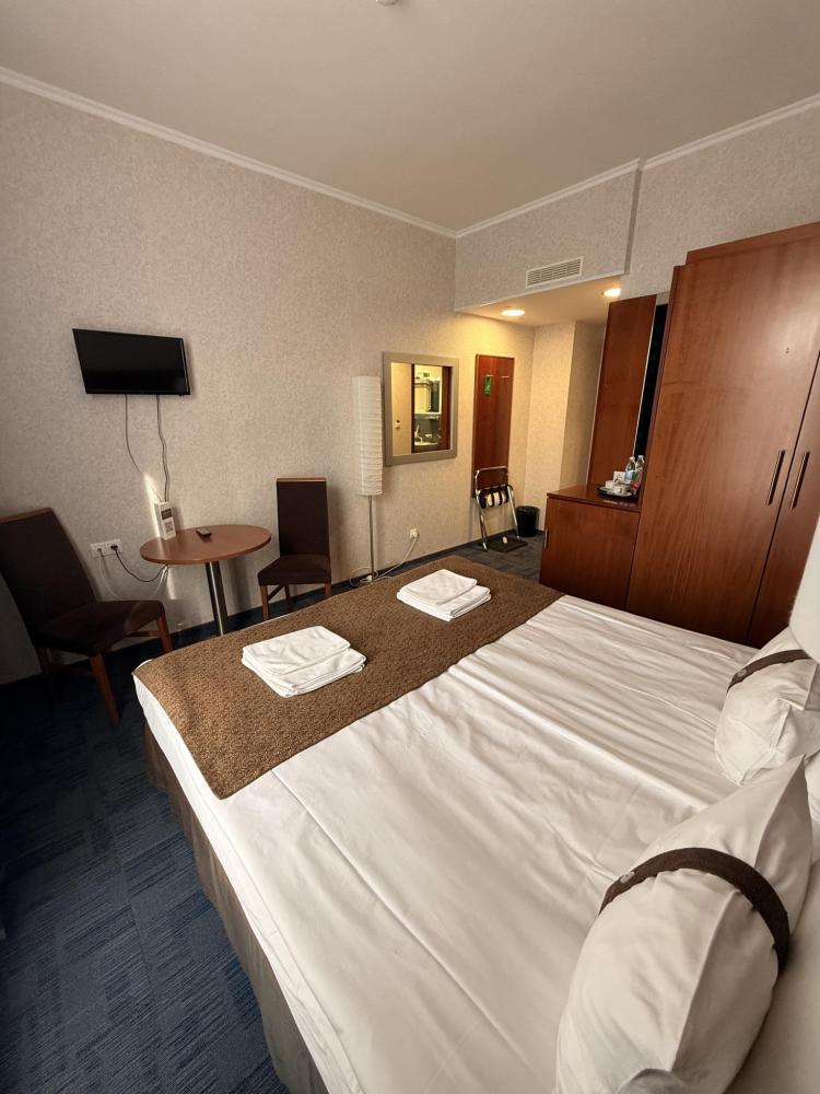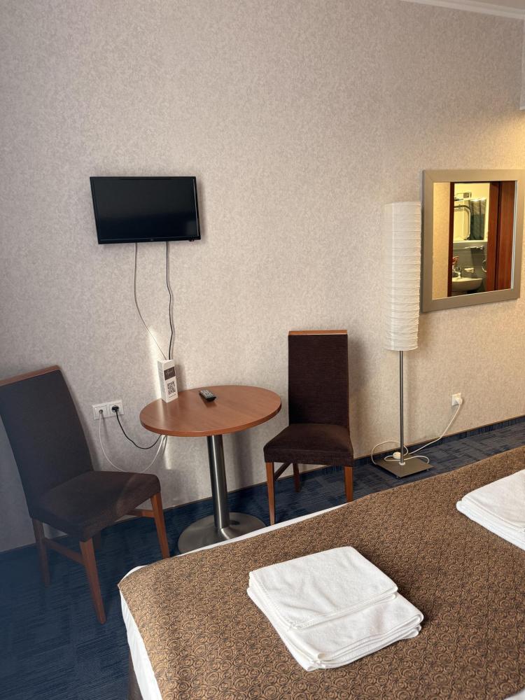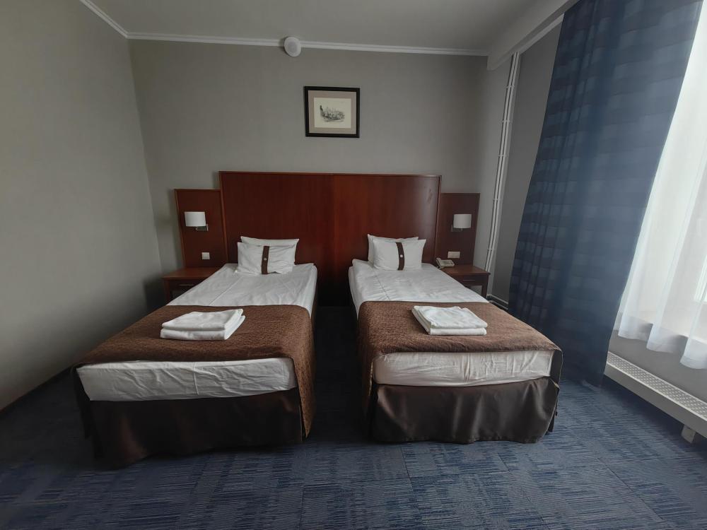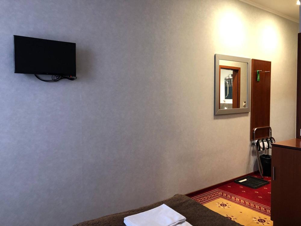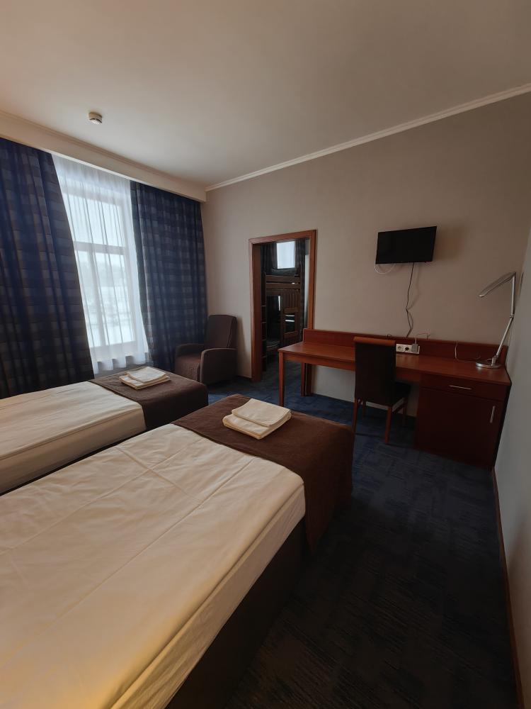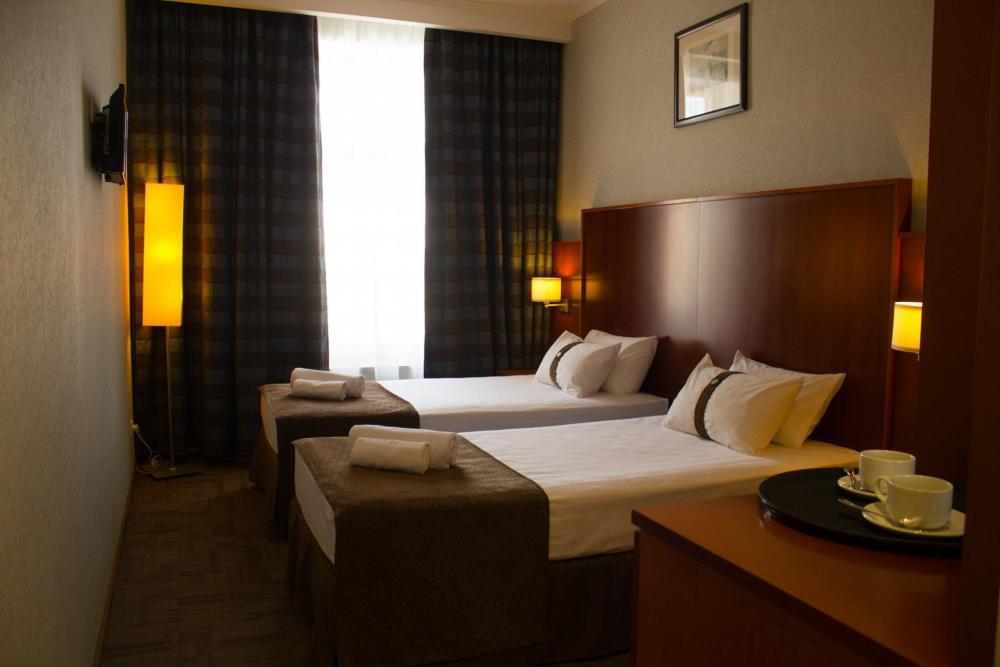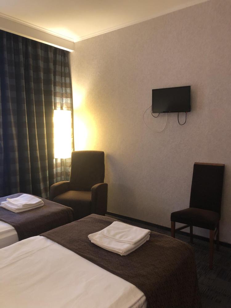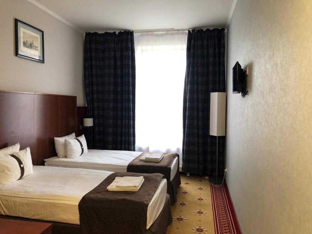 Номер стандарт вместимостью до 2 человек. В распоряжении гостей: две односпальные кровати, постельное белье и полотенца, светонепроницаемые шторы, телевизор, сейф, холодильник, чайник, посуда, шкаф с полками и плечиками, гигиенические принадлежности, фен.
