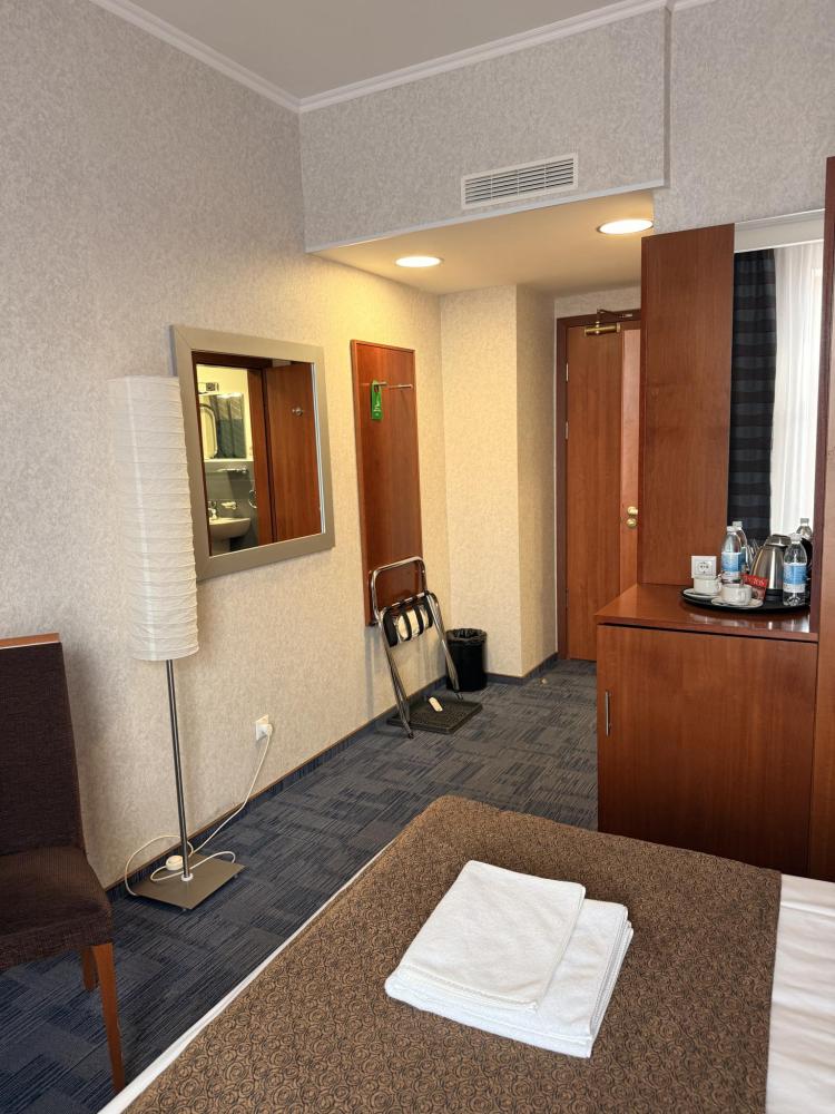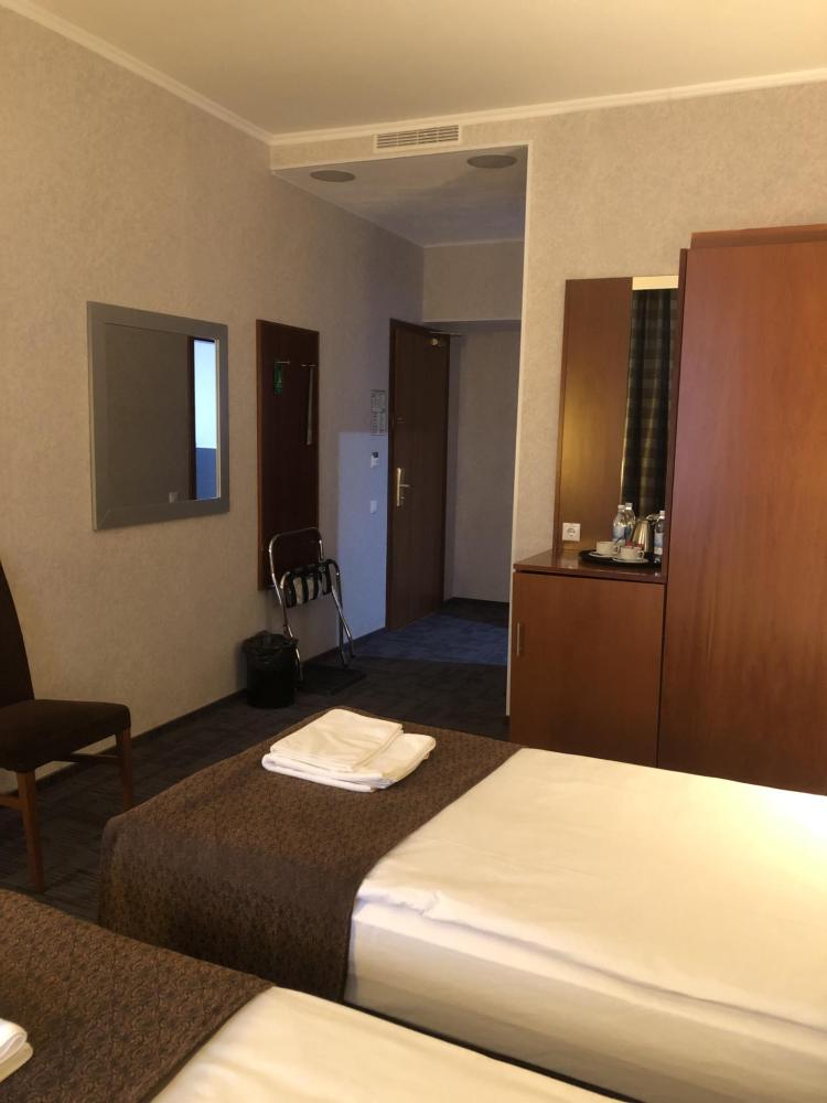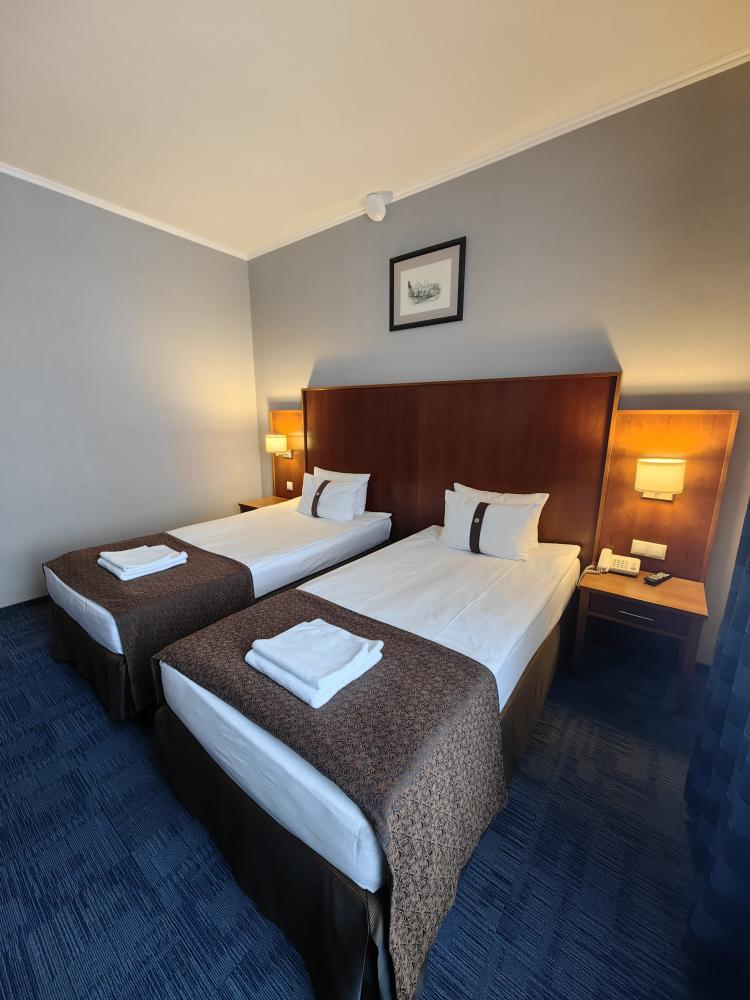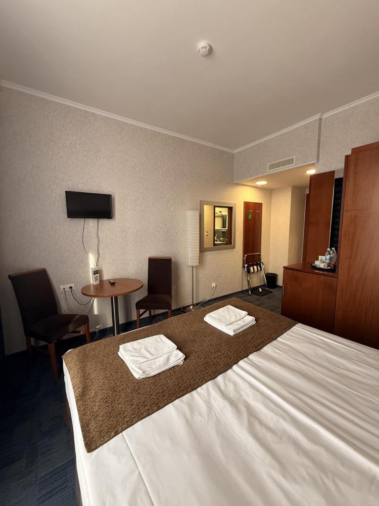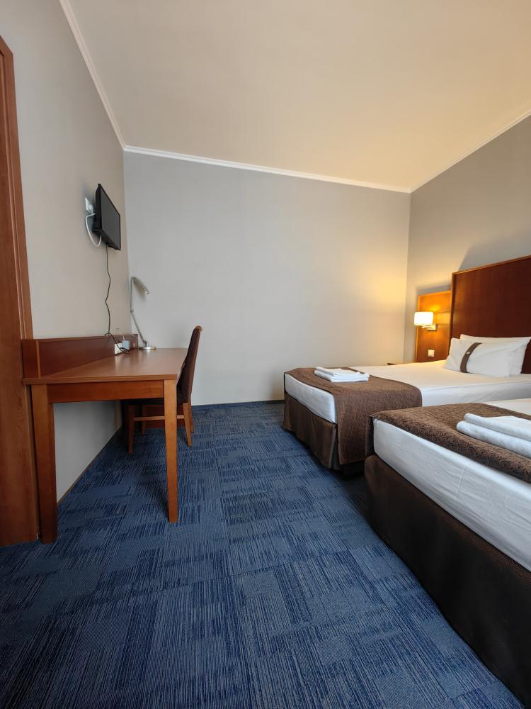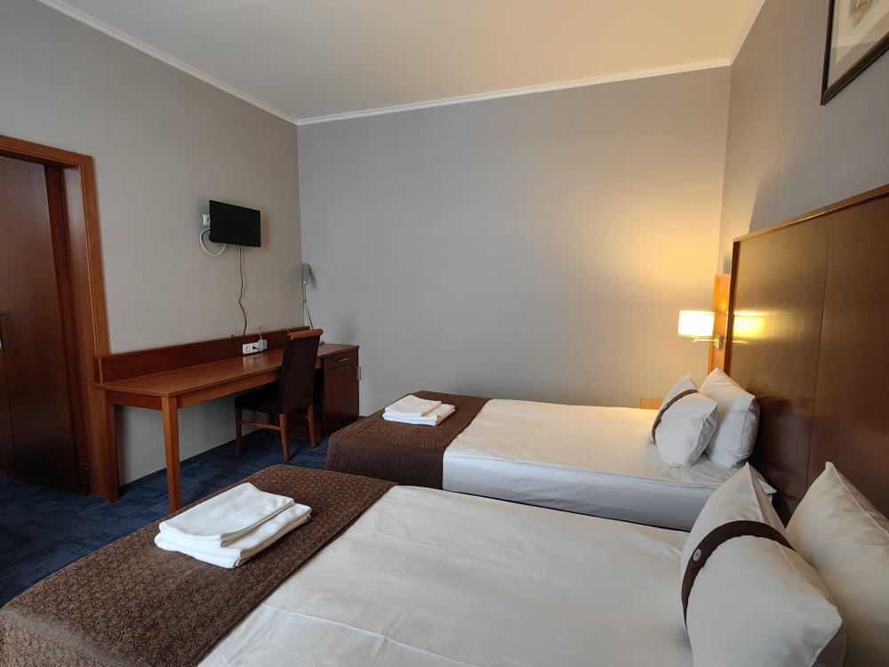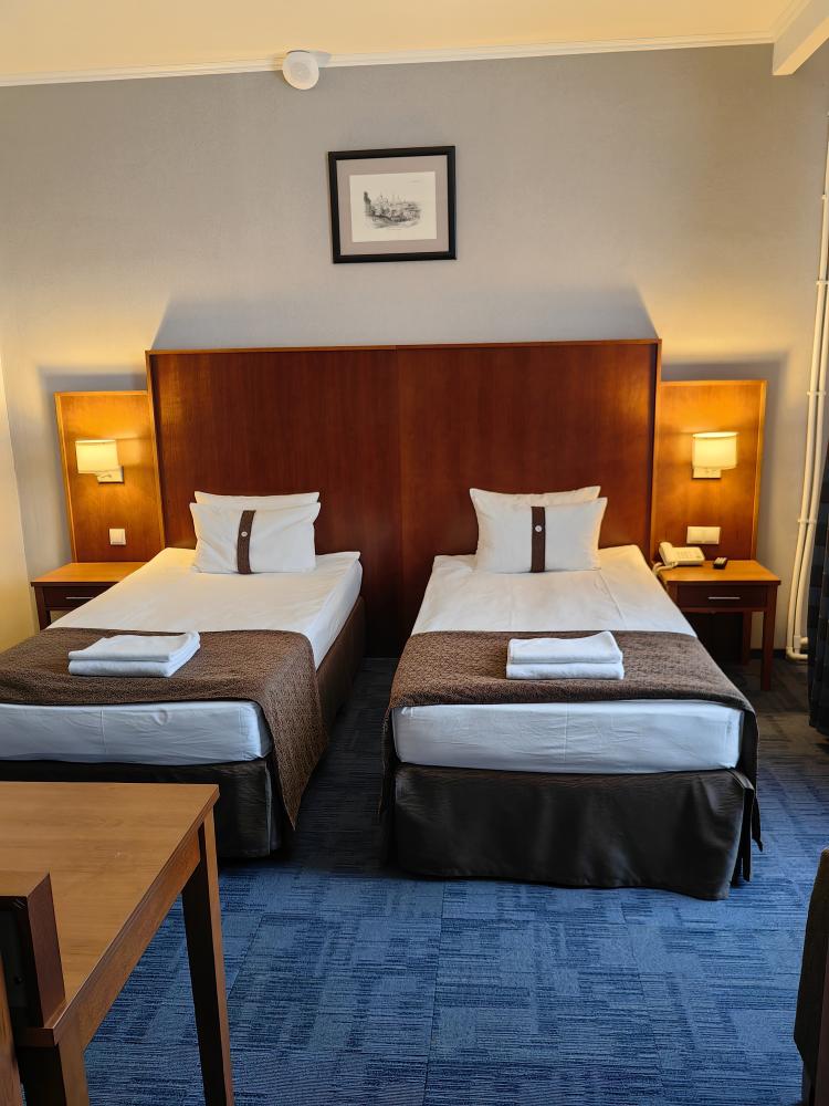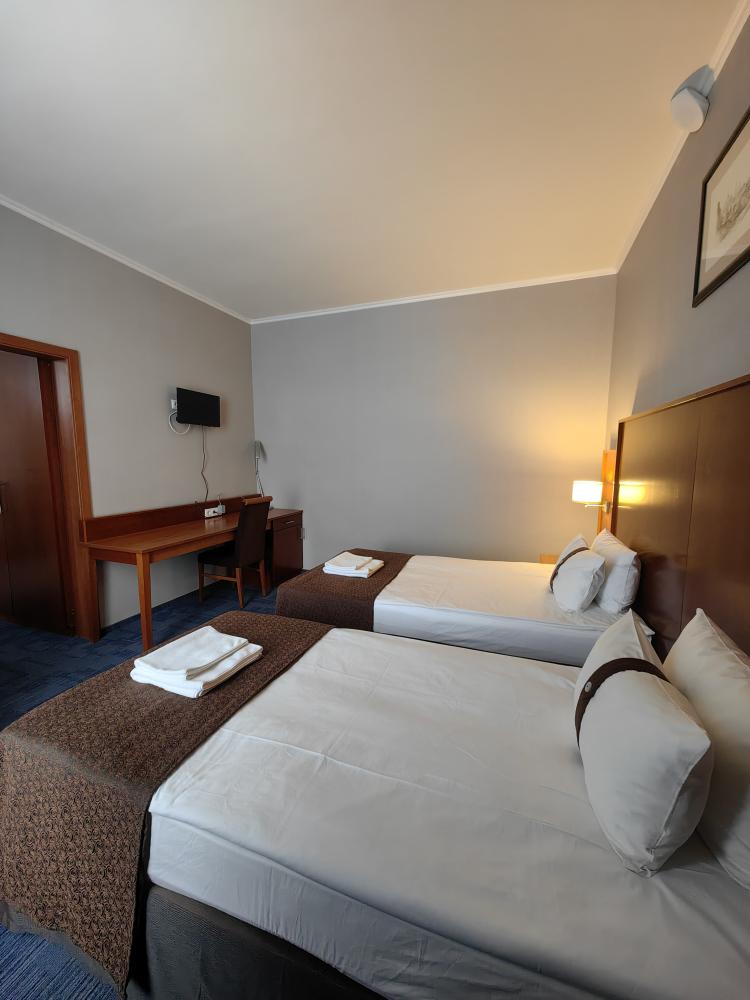 Номер стандарт вместимостью до 2 человек. В распоряжении гостей: две односпальные кровати, постельное белье и полотенца, светонепроницаемые шторы, телевизор, сейф, холодильник, чайник, посуда, шкаф с полками и плечиками, гигиенические принадлежности, фен.