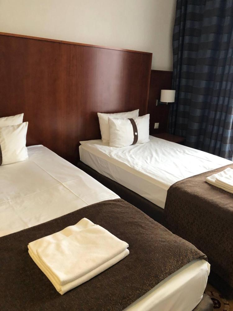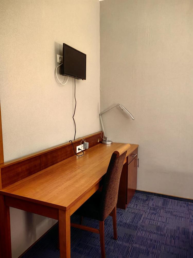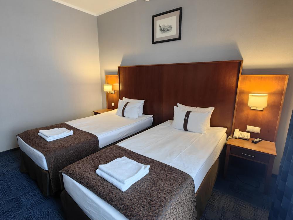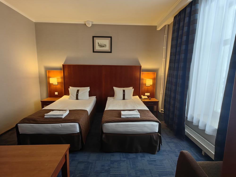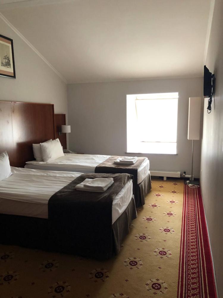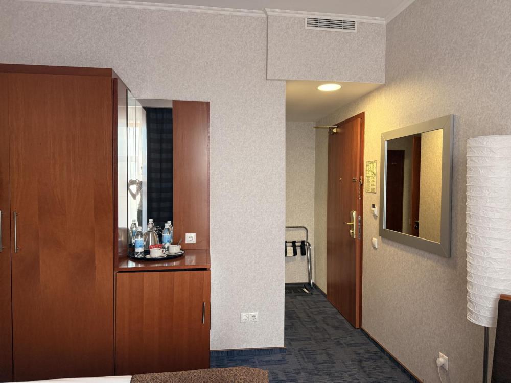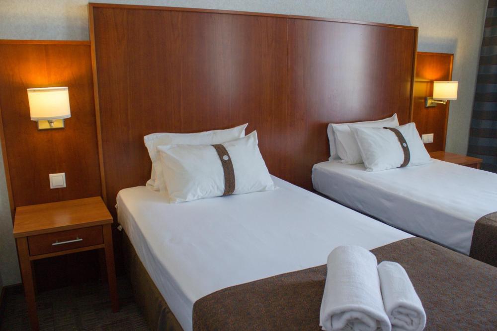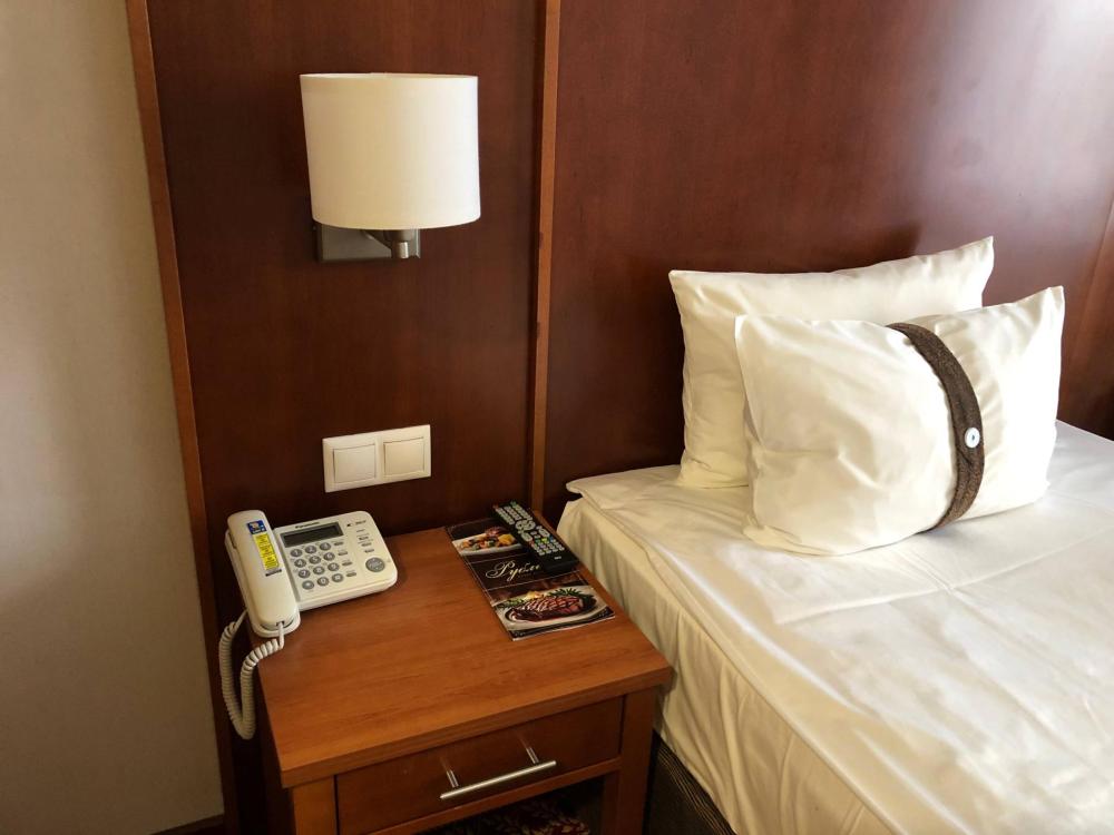 Номер стандарт вместимостью до 2 человек. В распоряжении гостей: две односпальные кровати, постельное белье и полотенца, светонепроницаемые шторы, телевизор, сейф, холодильник, чайник, посуда, шкаф с полками и плечиками, гигиенические принадлежности, фен.