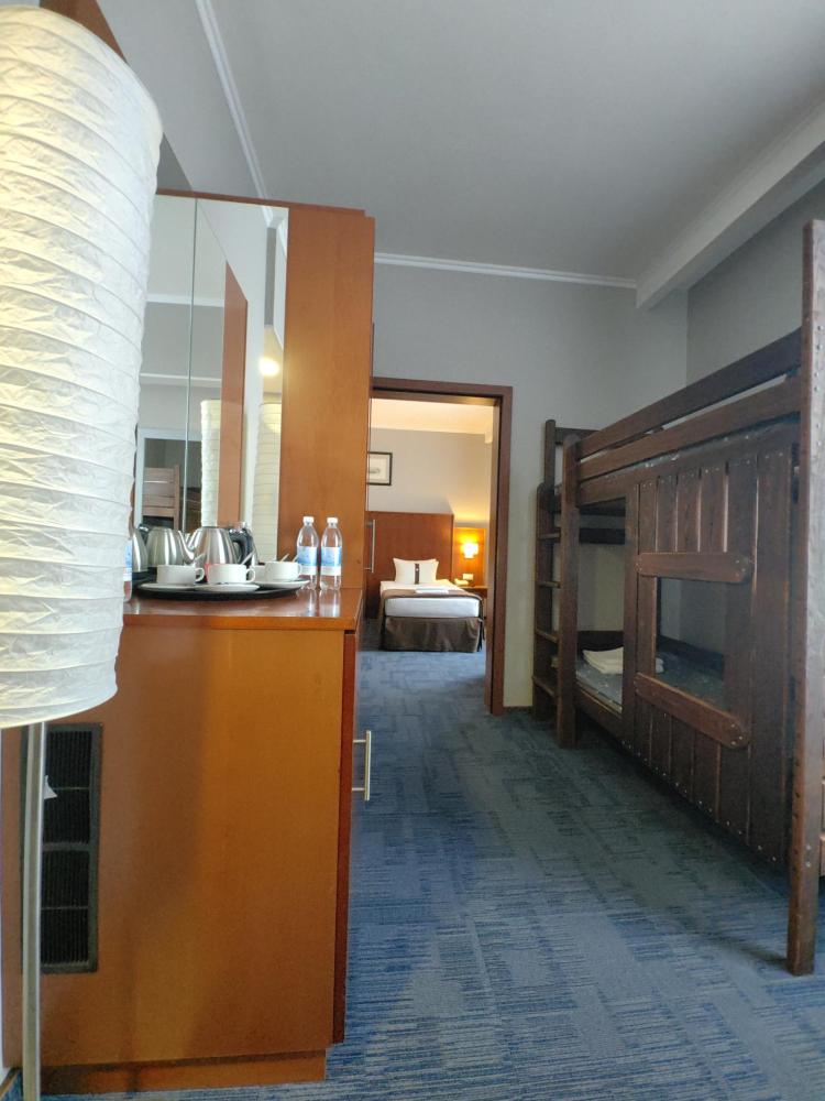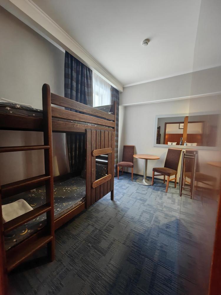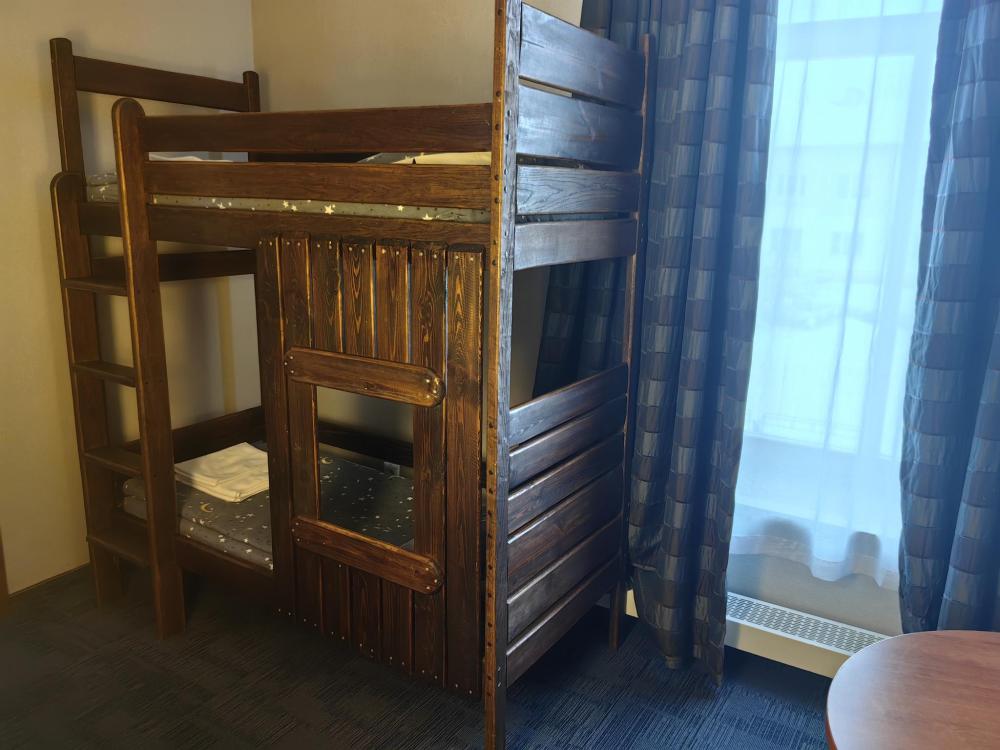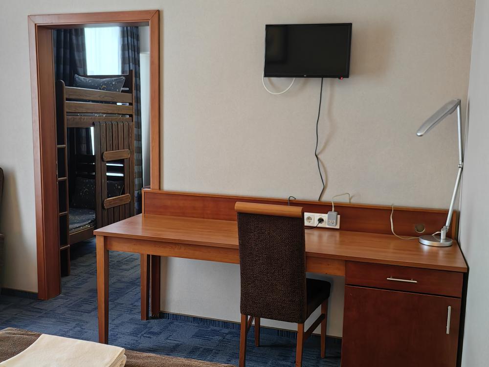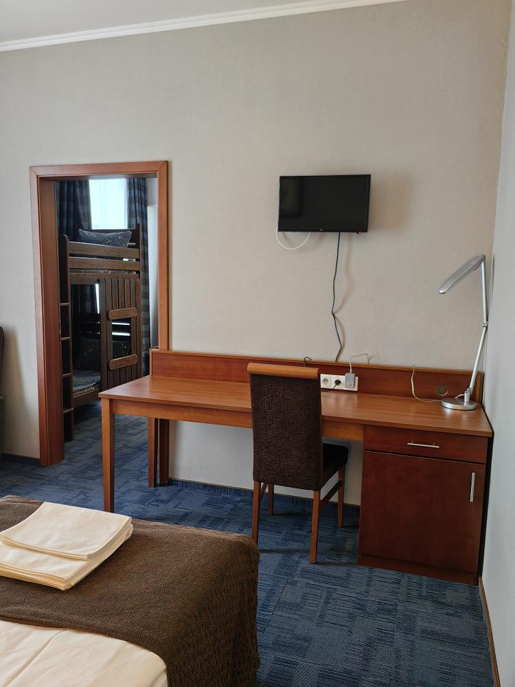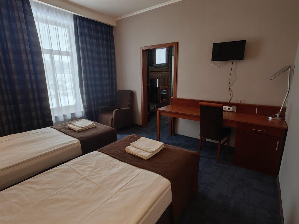 Номер семейный вместимостью до 4 человек. В распоряжении гостей: две односпальные кровати, постельное белье и полотенца, кресло, светонепроницаемые шторы, телевизор, сейф, холодильник, чайник, посуда, шкаф с полками и плечиками, гигиенические принадлежности, фен. Дополнительное место - детская двухъярусная кровать (длина 1,55 м)