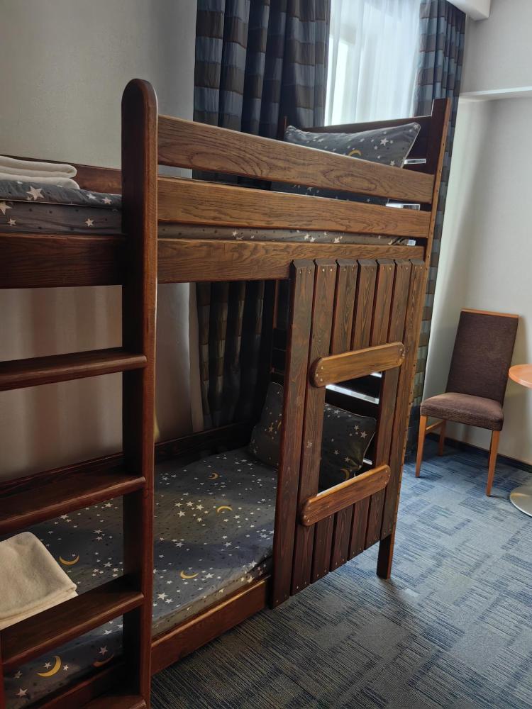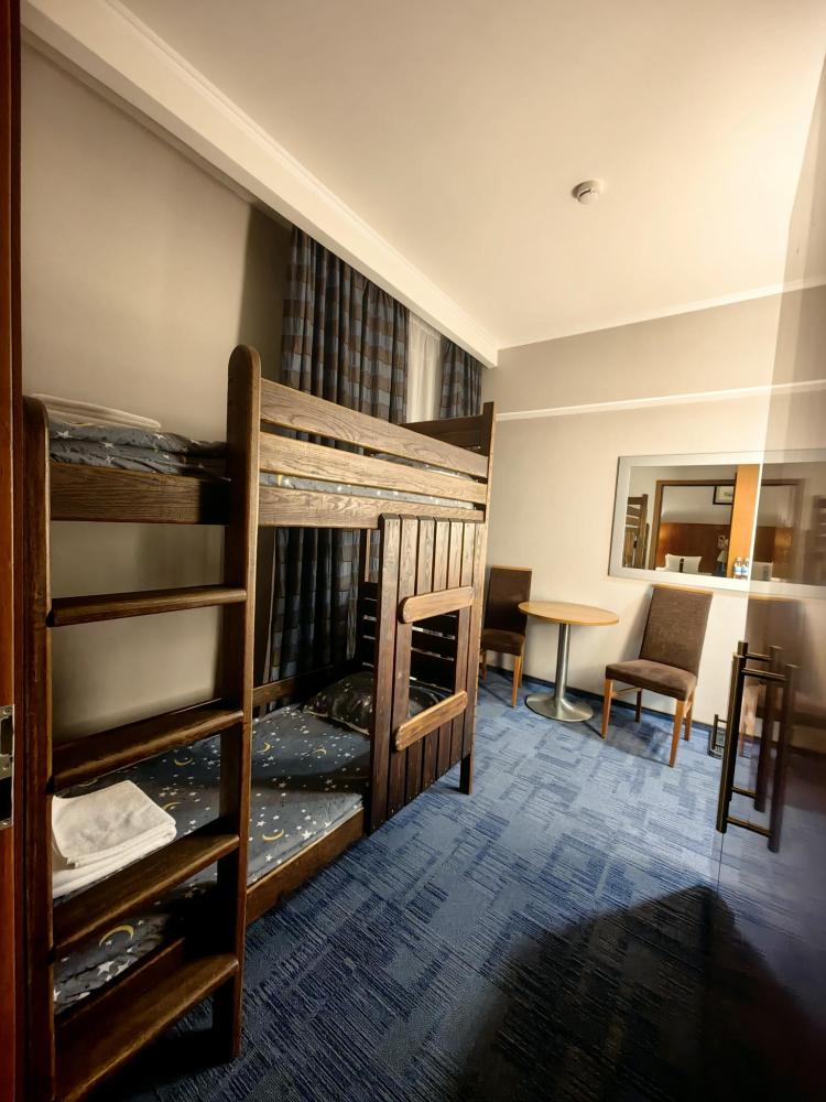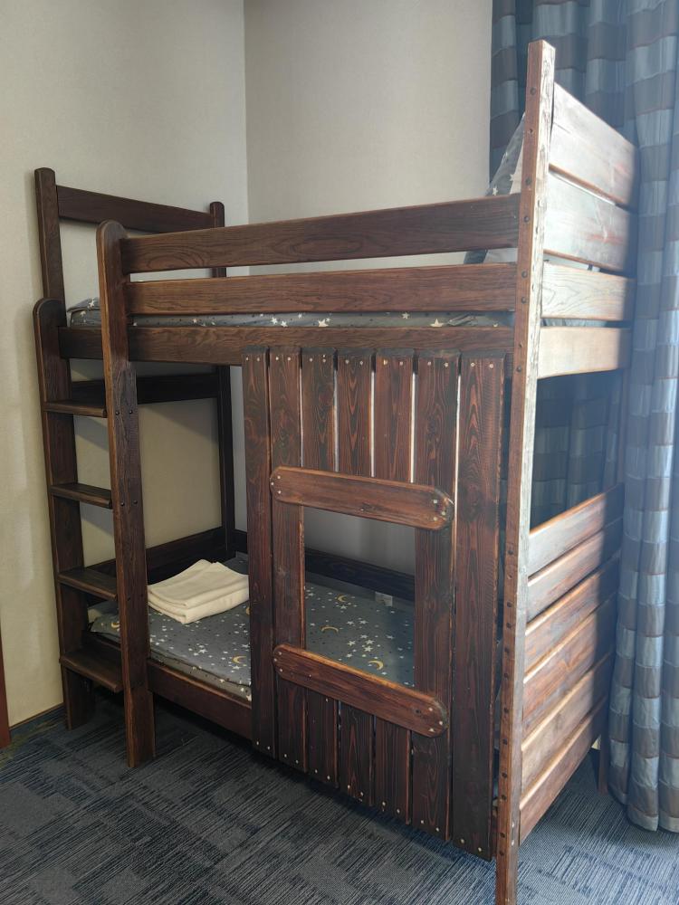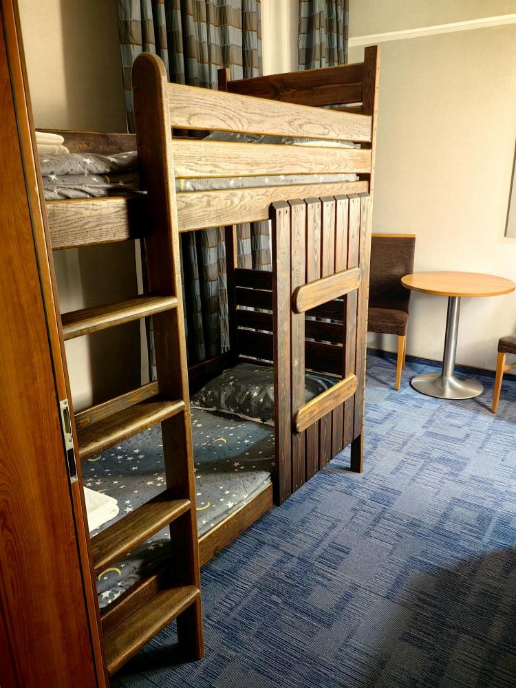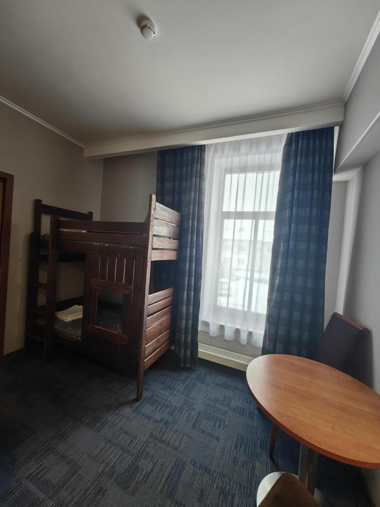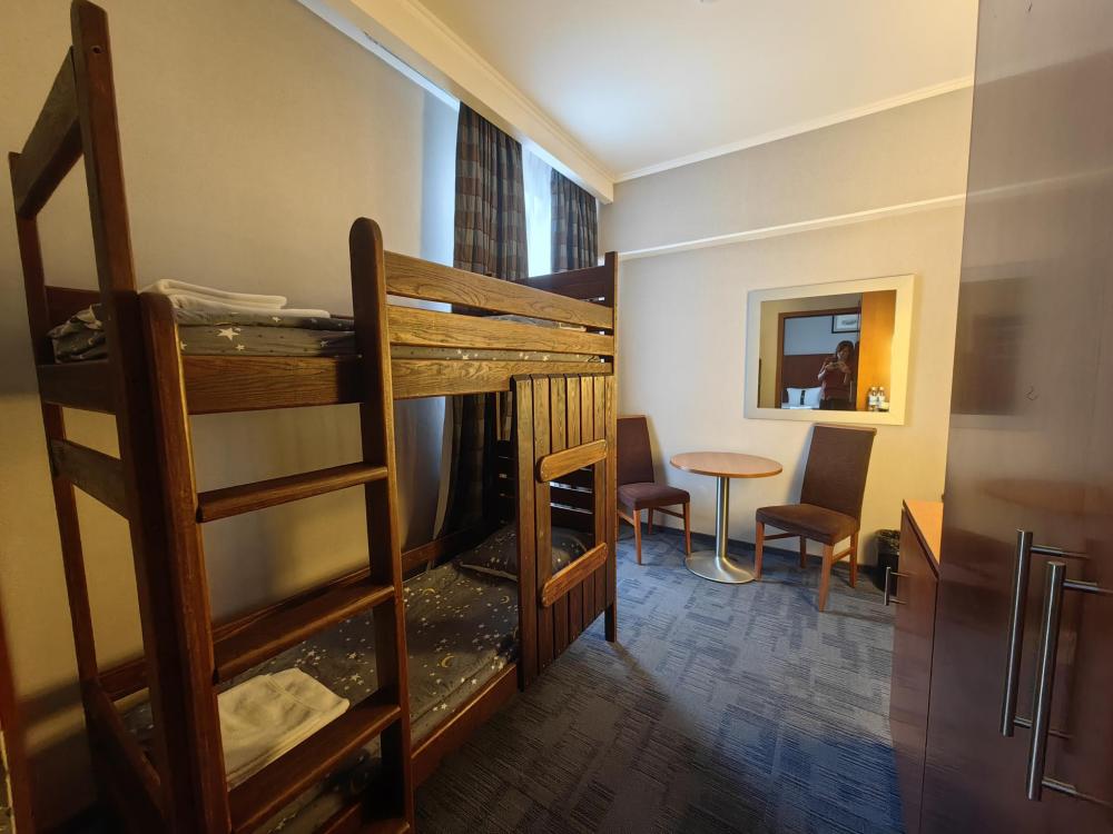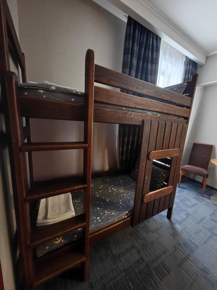 Номер семейный вместимостью до 4 человек. В распоряжении гостей: две односпальные кровати, постельное белье и полотенца, кресло, светонепроницаемые шторы, телевизор, сейф, холодильник, чайник, посуда, шкаф с полками и плечиками, гигиенические принадлежности, фен. Дополнительное место - детская двухъярусная кровать (длина 1,55 м)