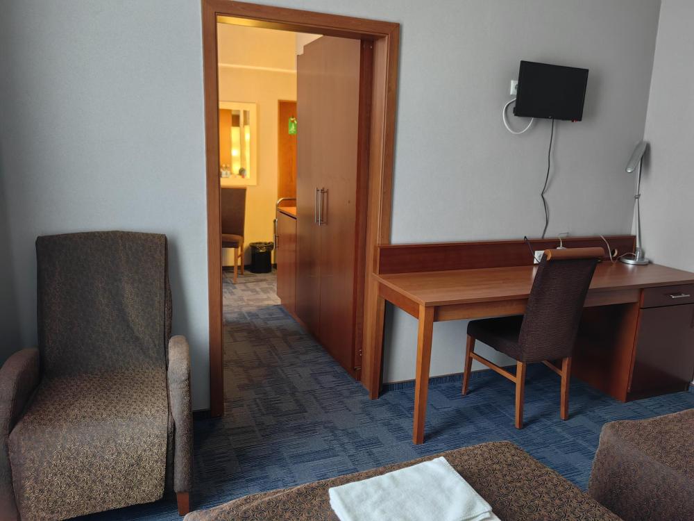 Номер Люкс вместимостью до 3 человек. В распоряжении гостей: две односпальные кровати, постельное белье и полотенца, кресло, светонепроницаемые шторы, телевизор, сейф, холодильник, чайник, посуда, шкаф с полками и плечиками, гигиенические принадлежности, фен. Дополнительное место предоставляется по запросу.
