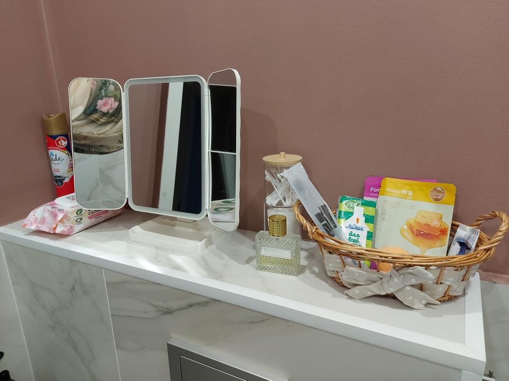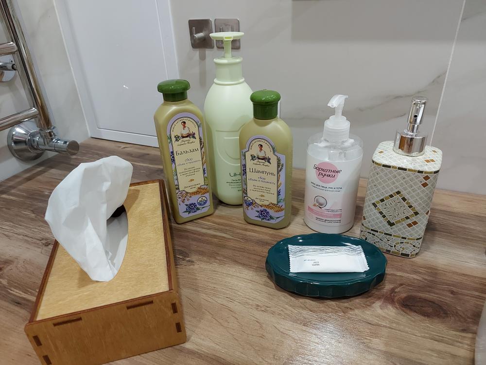 Ванная: стиральная машина, фен, порционное мыло, гель для душа, шампунь, маски для лица, одноразовый бритвенный станок, зубные наборы (щетки и паста), жидкое мыло и крем для рук, бомбочки для ванны, ватные диски и палочки, салфетки сухие и влажные, туалетная бумага и носовые платки, стиральный порошок и аптечка.