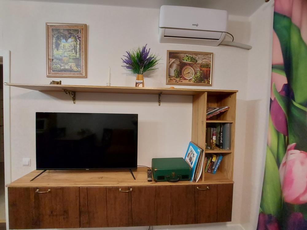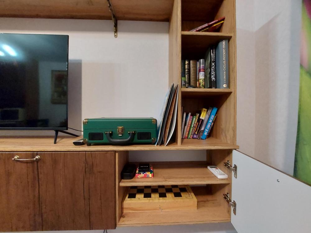 Большой телевизор с подпиской на каналы, ретро-проигрыватель и виниловые диски, а также книги для детей и взрослых, настольные игры, шахматы, шашки, пазлы, альбомы, раскраски и карандаши, роутер и wi-fi с быстрым интернетом.