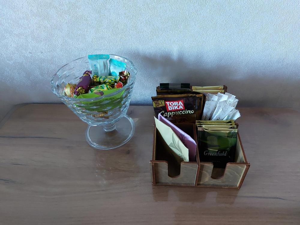 Комплимент при заезде - минеральная вода, кофе, чай, сахар, конфетки.