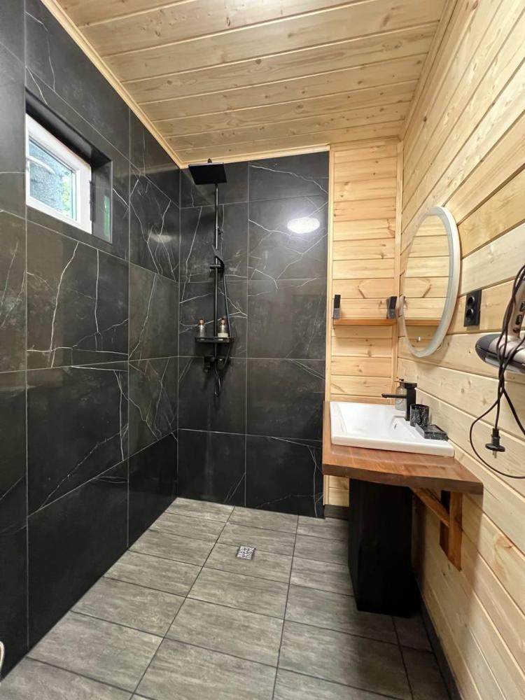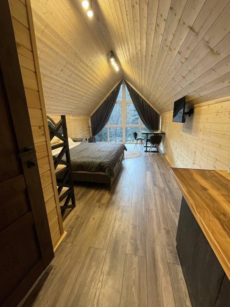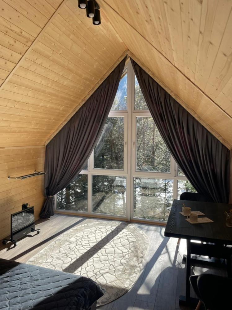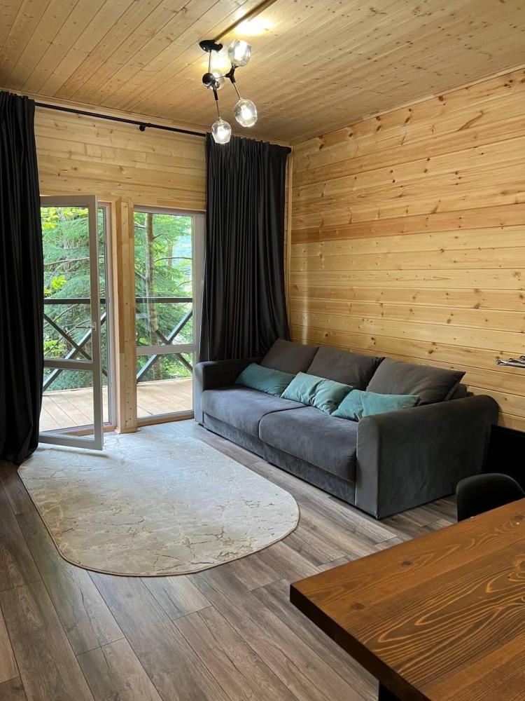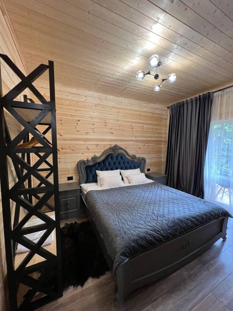 Трехместный 1-комнатный номер 30 м². Санузел — душ в номере. Мебель: двуспальная кровать и диван, шкаф, прикроватные тумбочки, журнальный столик, прихожая, вешалка, телевизор, сплит-система. Удобные ортопедические матрасы, тёплая и уютная атмосфера, запах дерева, высокие потолки. Постельное бельё и полотенца предоставляются.