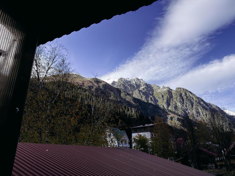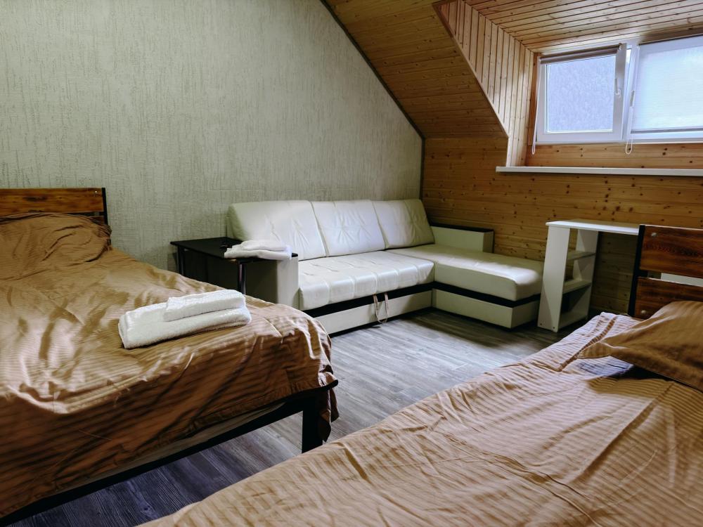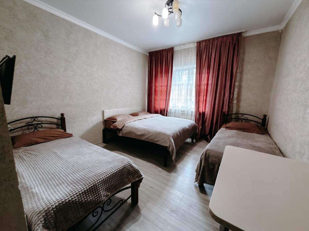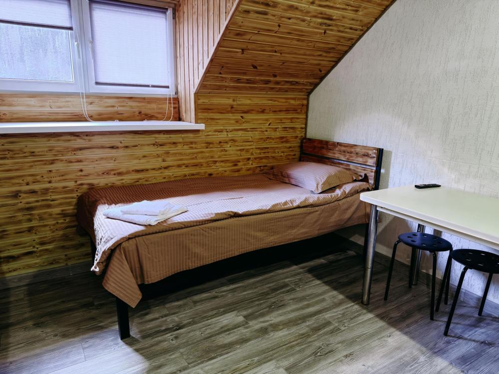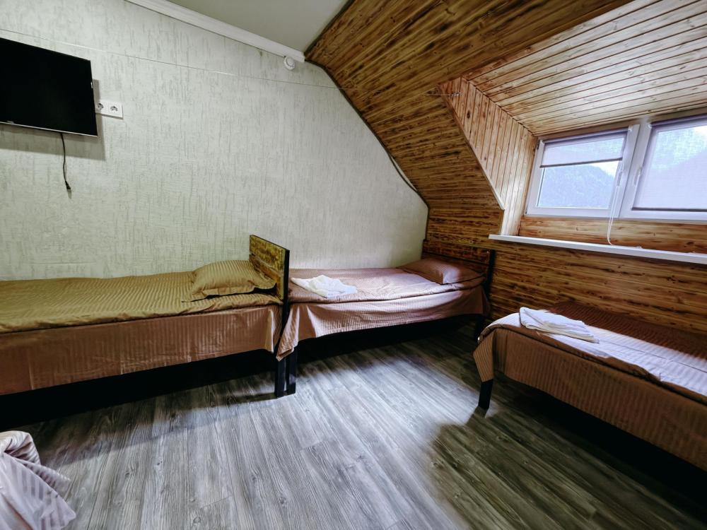 Стандартный 3х- местный номер, с 2х спальной кроватью и односпальной кроватью. Ванная комната в номере. Из окна открывается вид на горы.