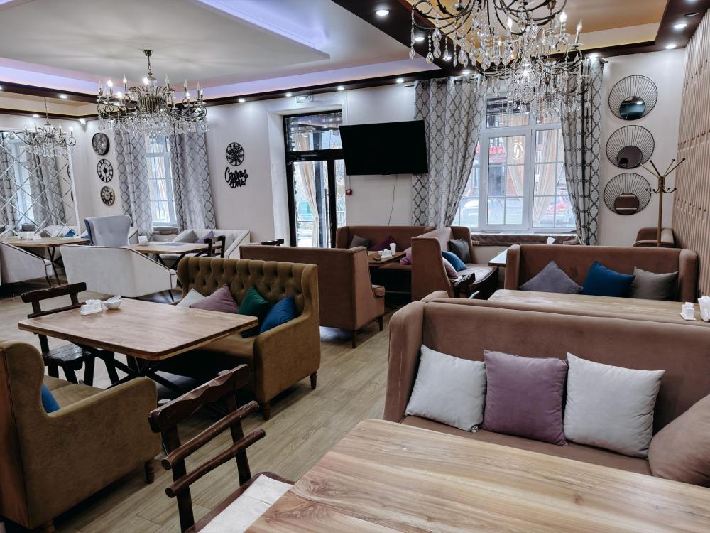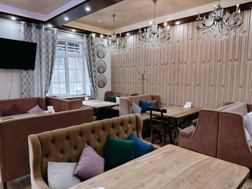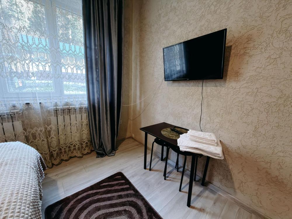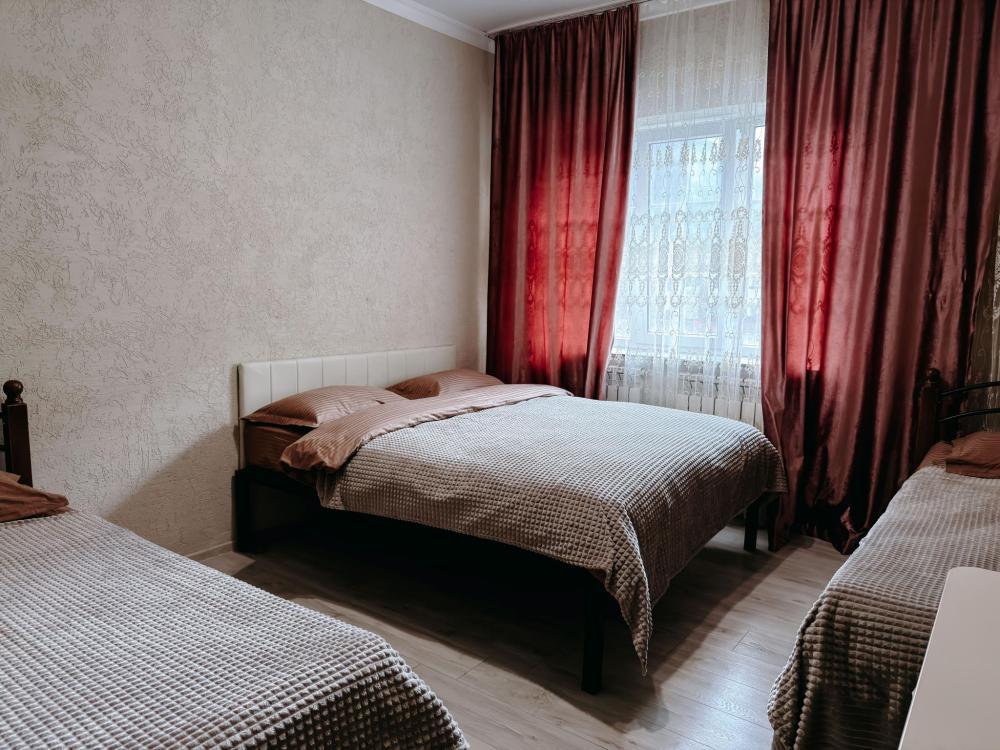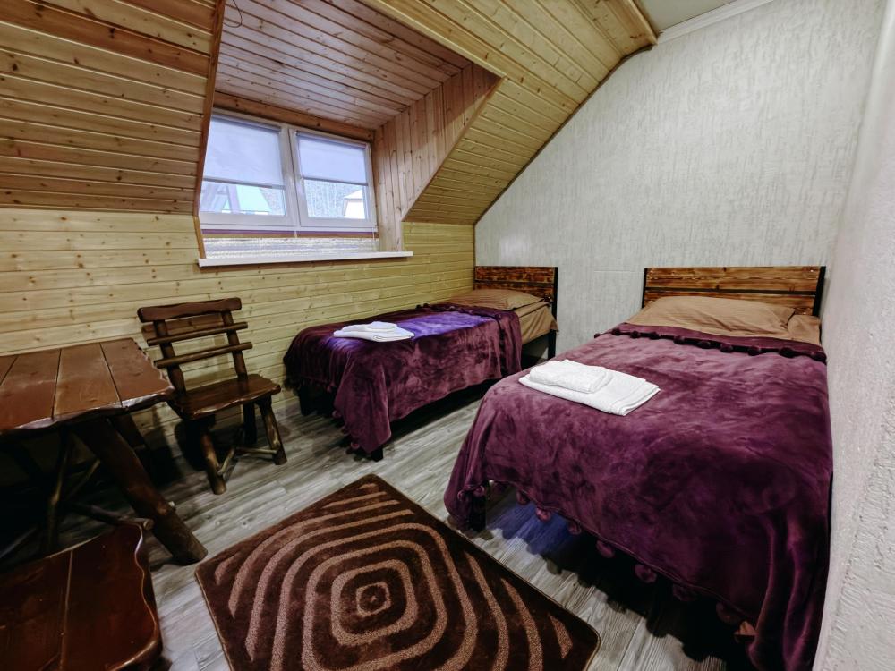 Стандартный 3х- местный номер, с 2х спальной кроватью и односпальной кроватью. Ванная комната в номере. Из окна открывается вид на горы.