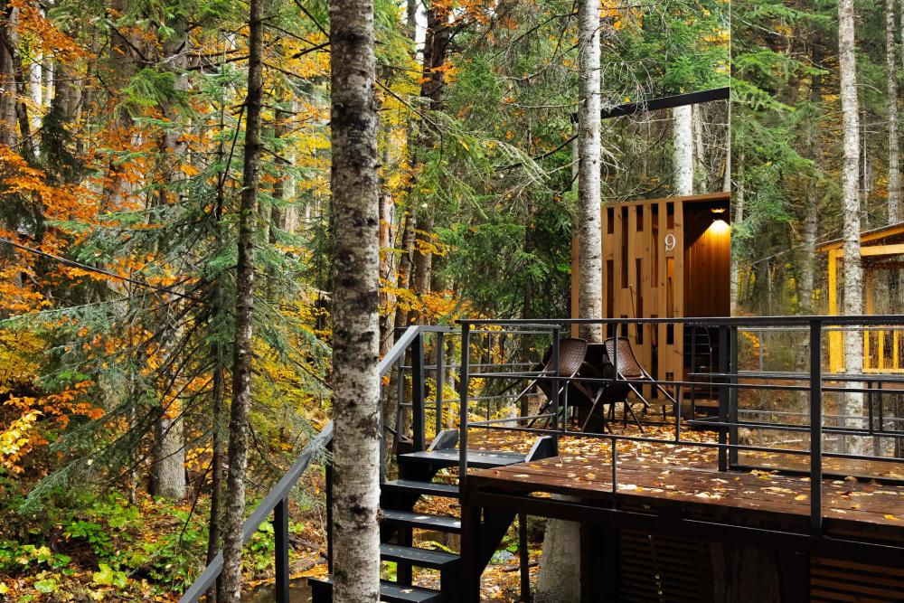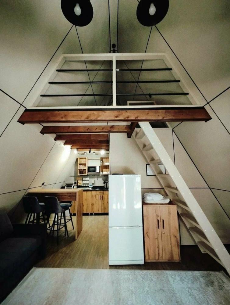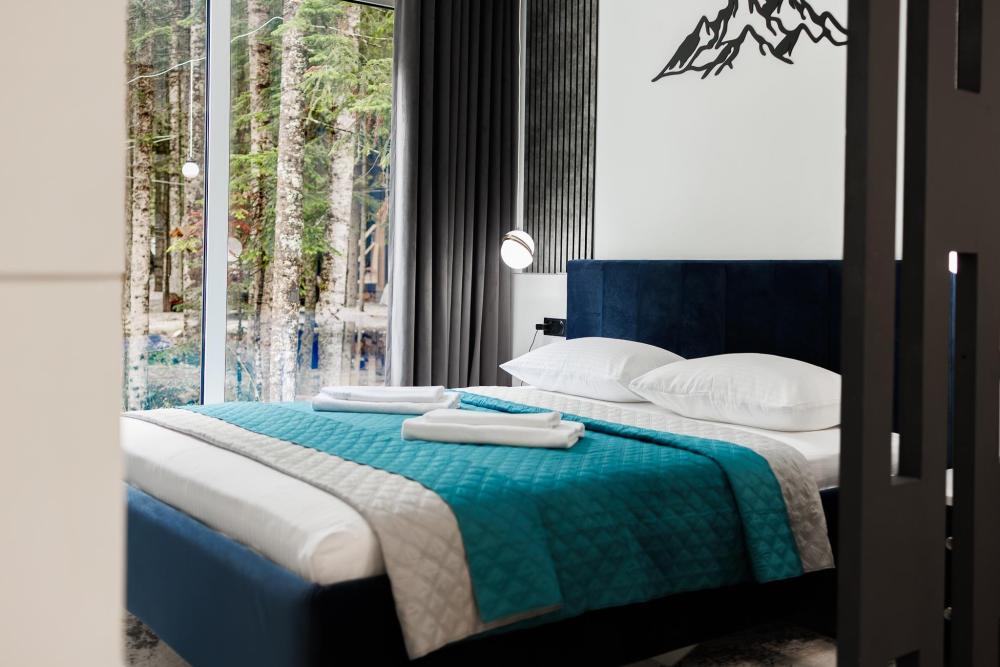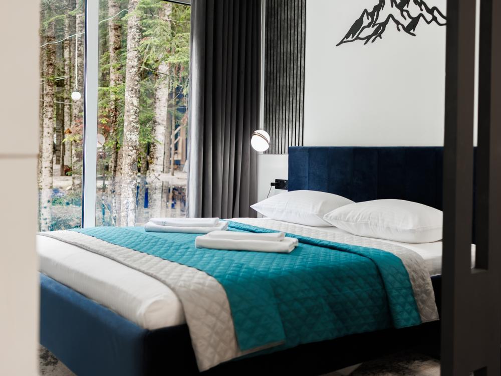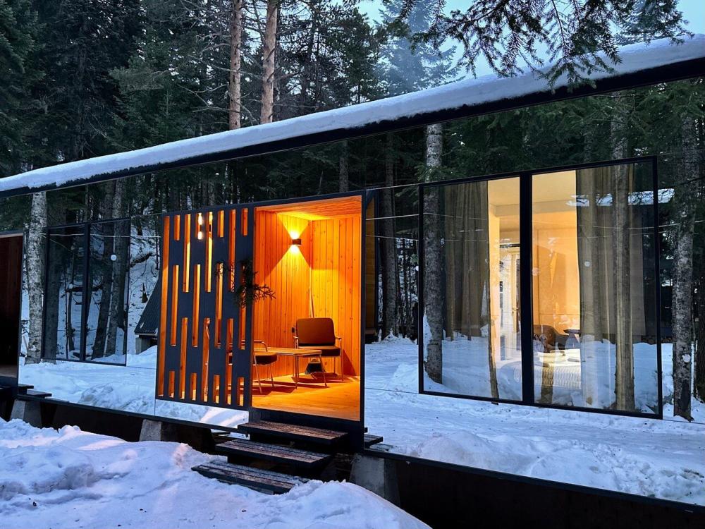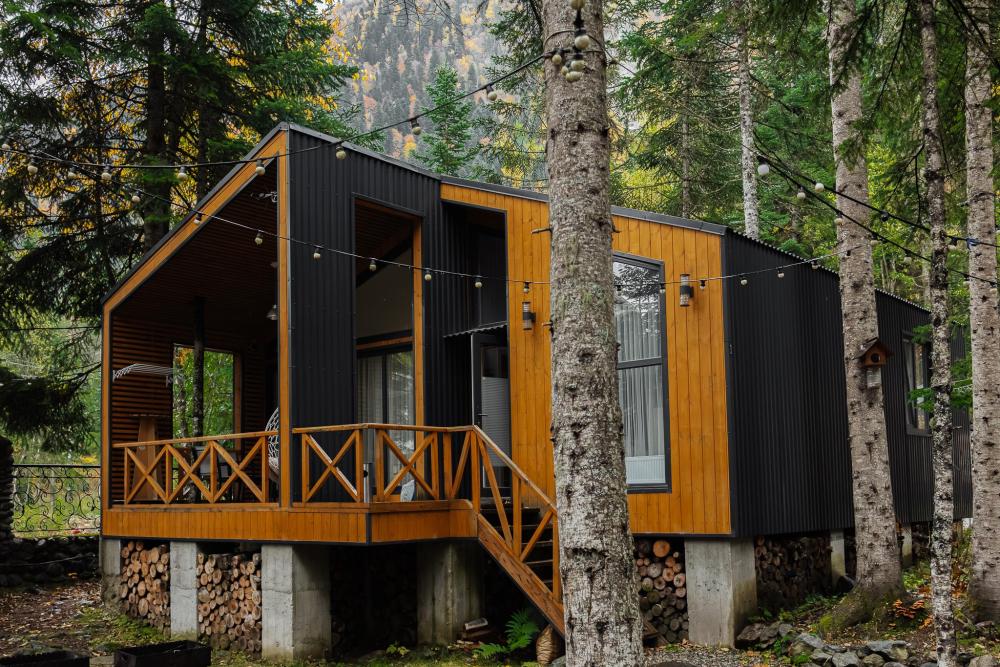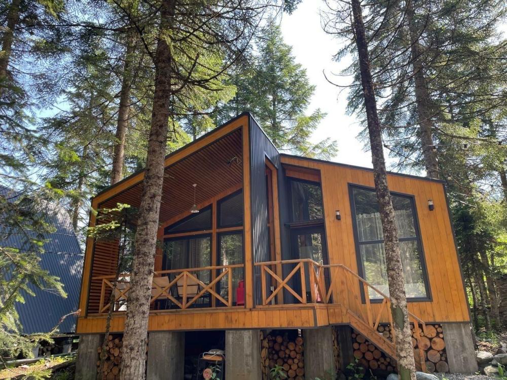 Таунхаус выполнен в современном стиле с панорамными окнами, которые отражают величественную природу, наполняя дом светом и теплом. Внутри есть всё необходимое для комфортного проживания: удобную двуспальную кровать, мини-кухню, собственную ванную комнату, зону отдыха и обеденную зону. Тёплый интерьер с элементами дерева создаёт ощущение домашнего уюта, а продуманная планировка делает пребывание по-настоящему приятным.