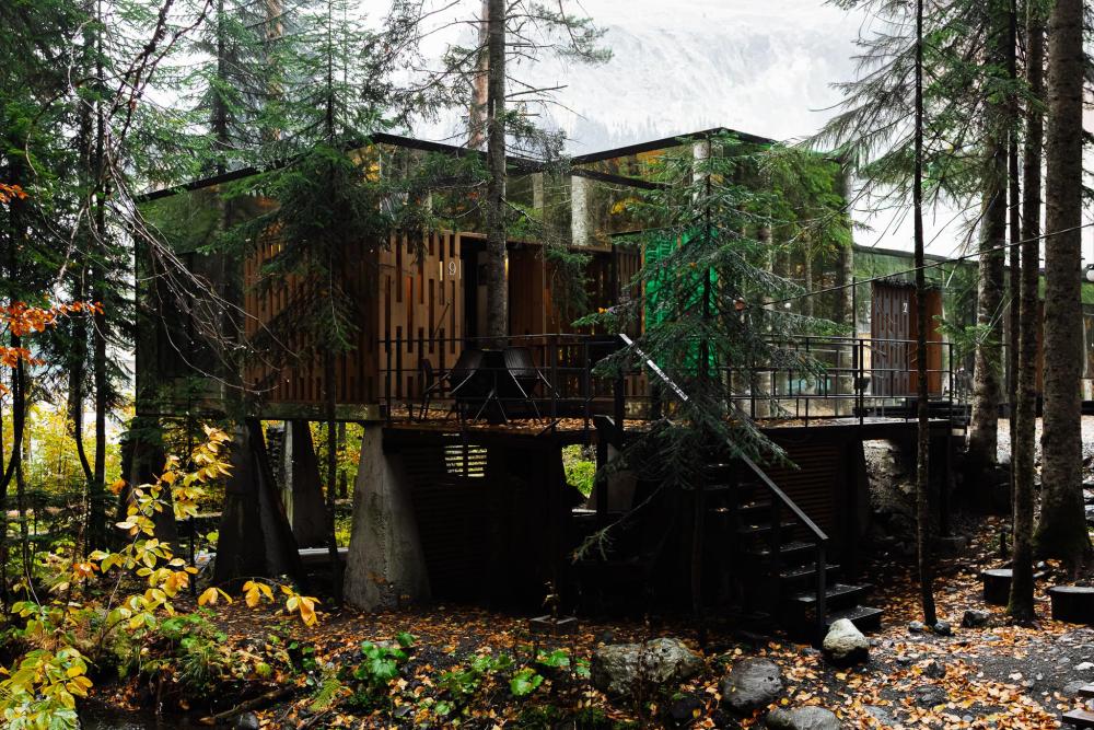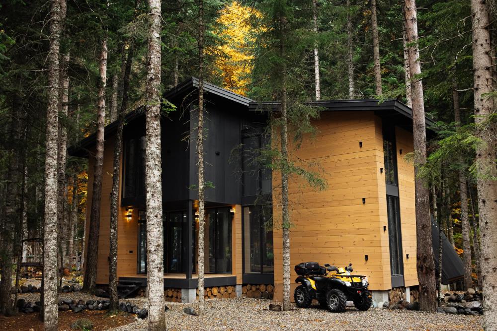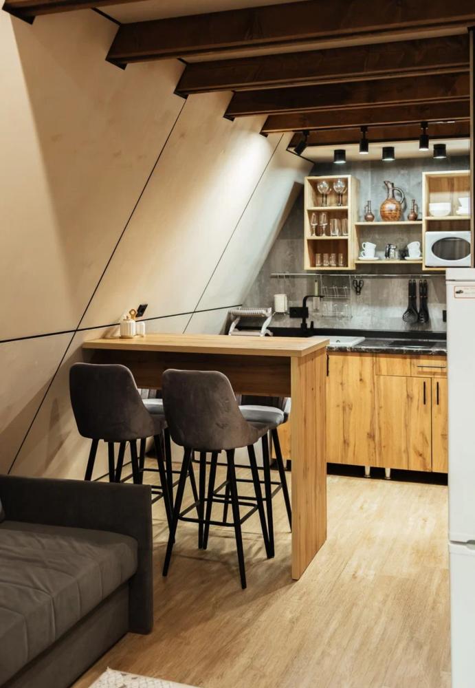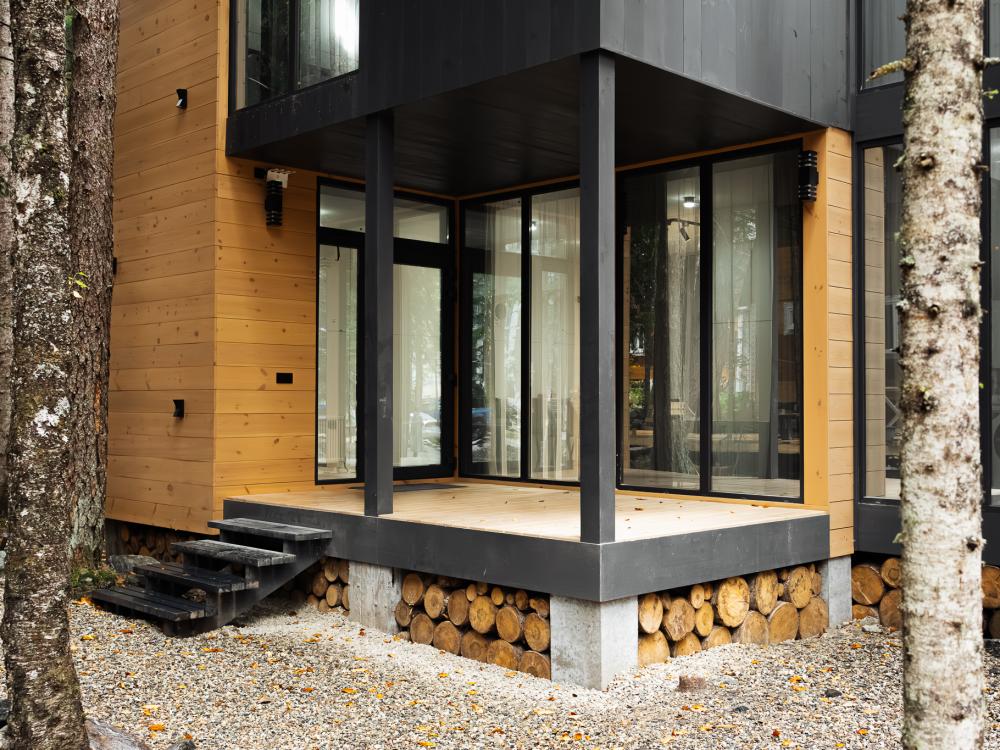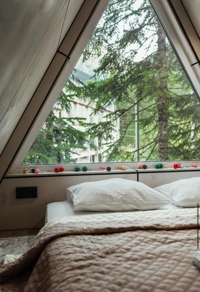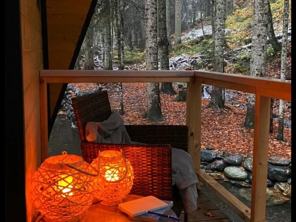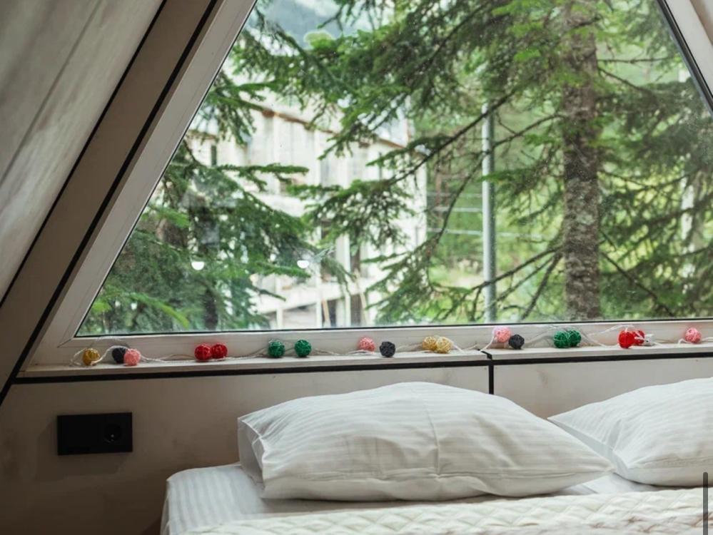 Таунхаус выполнен в современном стиле с панорамными окнами, которые отражают величественную природу, наполняя дом светом и теплом. Внутри есть всё необходимое для комфортного проживания: удобную двуспальную кровать, мини-кухню, собственную ванную комнату, зону отдыха и обеденную зону. Тёплый интерьер с элементами дерева создаёт ощущение домашнего уюта, а продуманная планировка делает пребывание по-настоящему приятным.