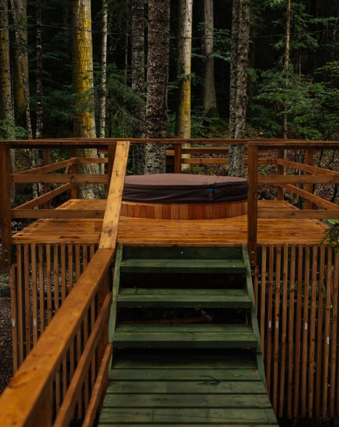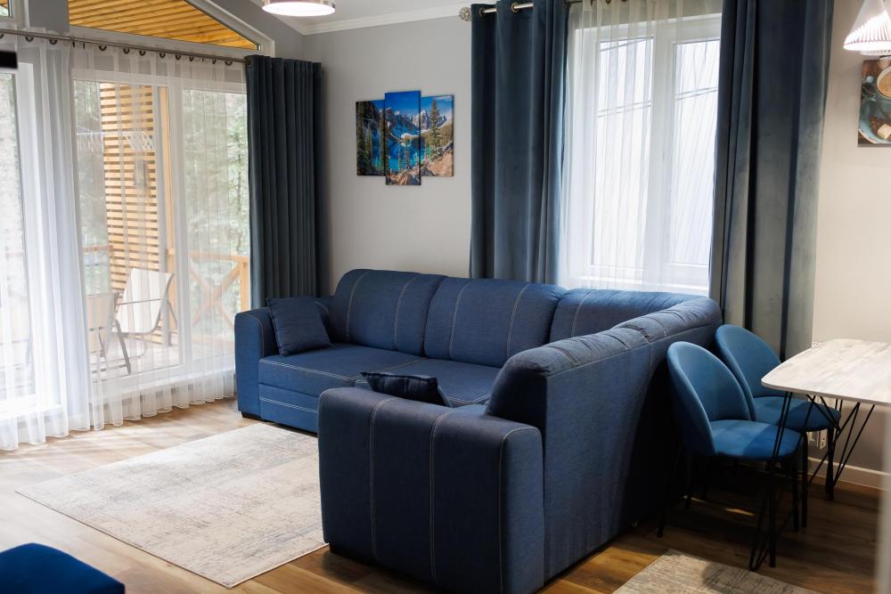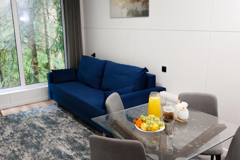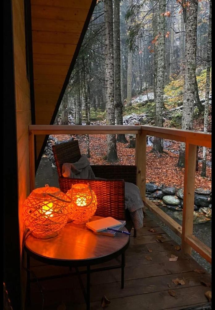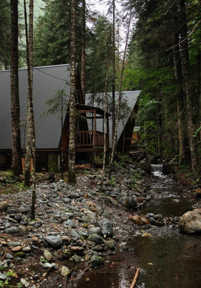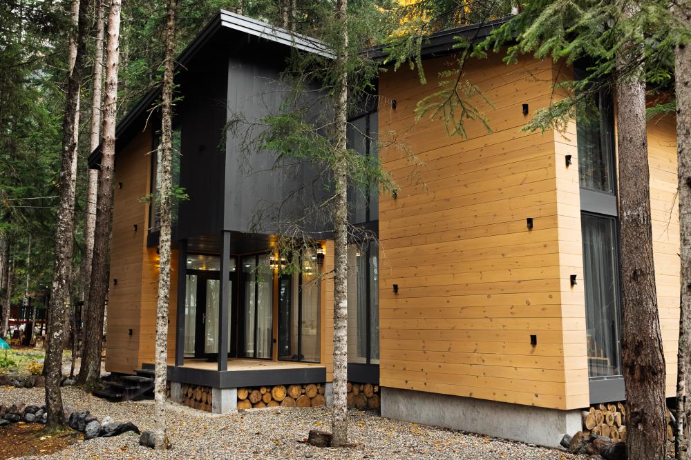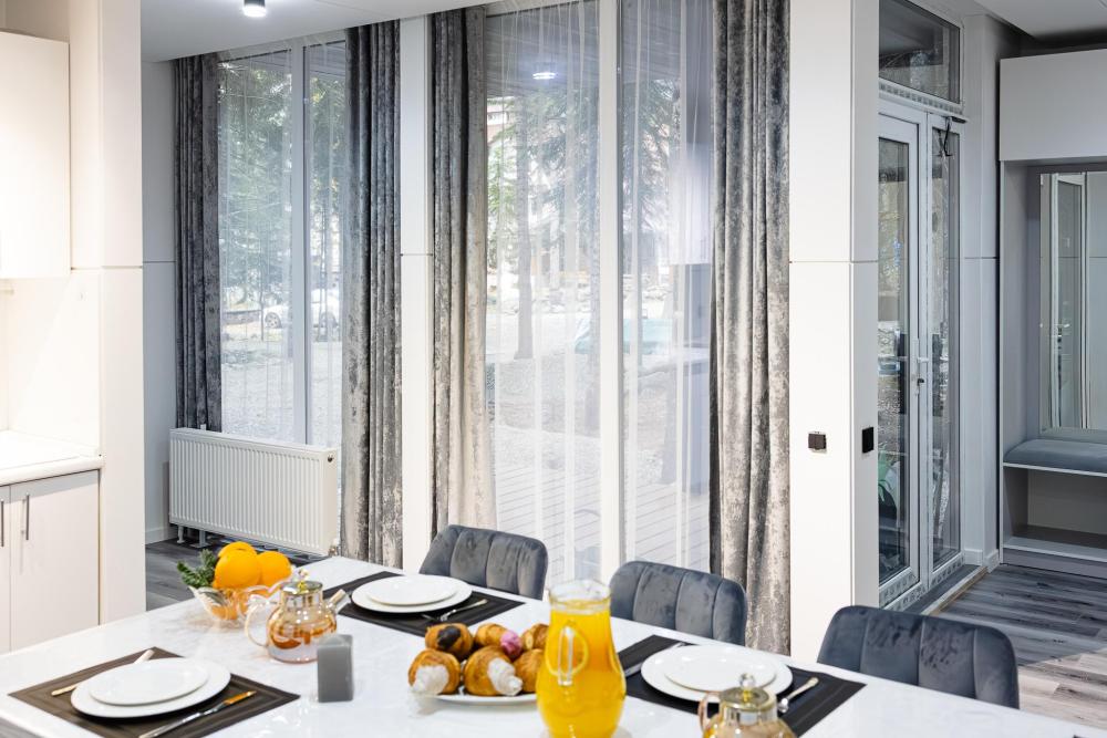 Таунхаус выполнен в современном стиле с панорамными окнами, которые отражают величественную природу, наполняя дом светом и теплом. Внутри есть всё необходимое для комфортного проживания: удобную двуспальную кровать, мини-кухню, собственную ванную комнату, зону отдыха и обеденную зону. Тёплый интерьер с элементами дерева создаёт ощущение домашнего уюта, а продуманная планировка делает пребывание по-настоящему приятным.