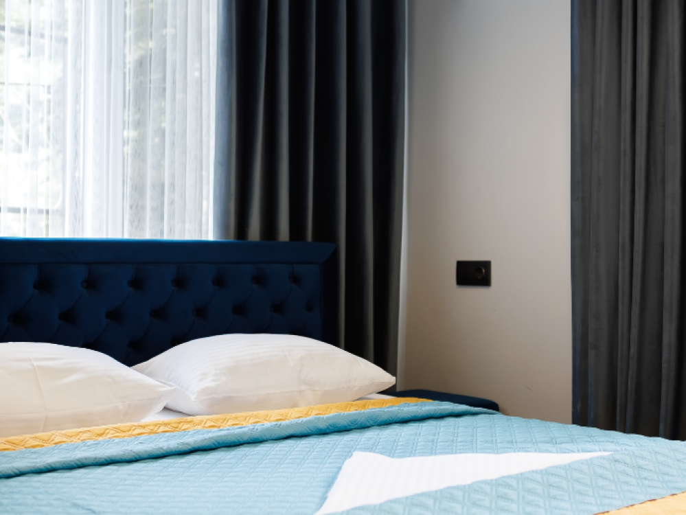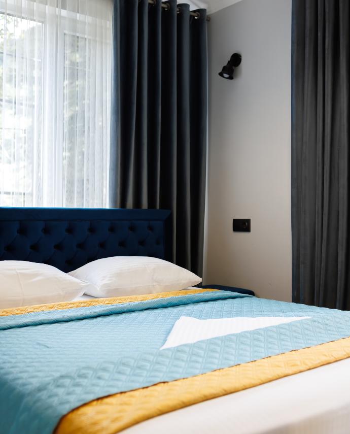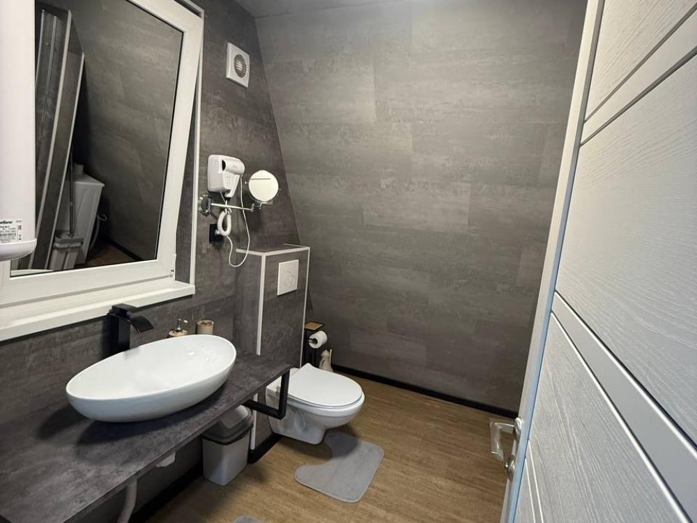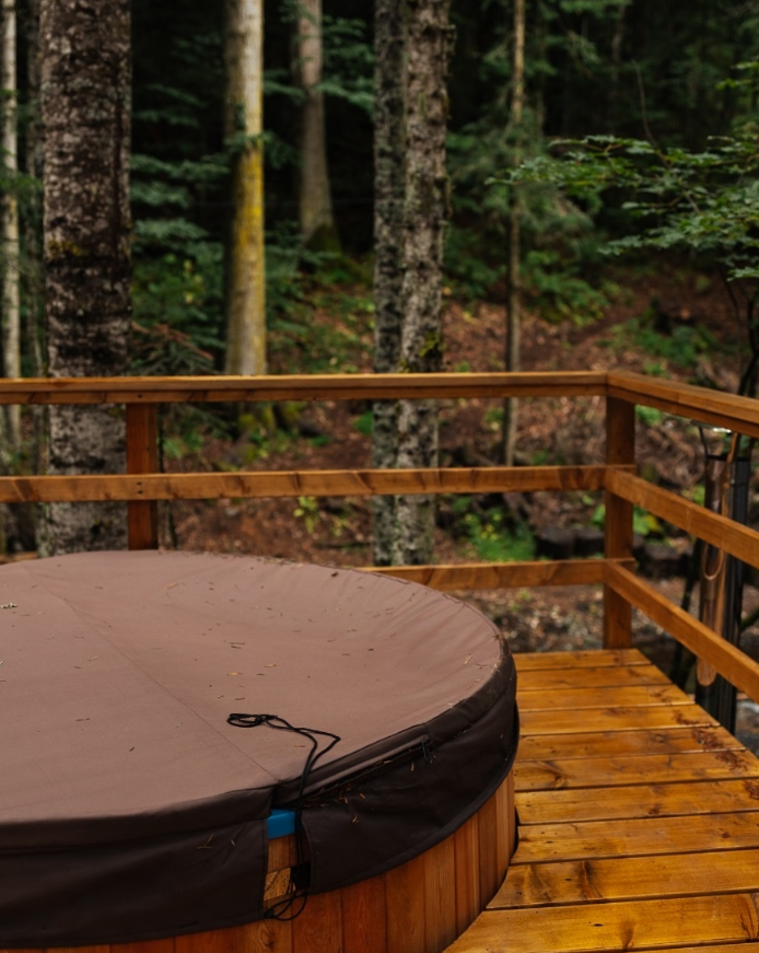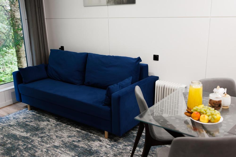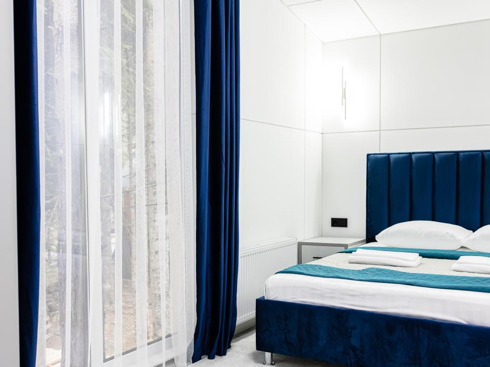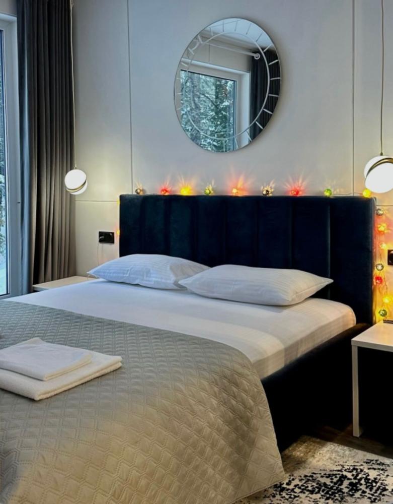 Таунхаус выполнен в современном стиле с панорамными окнами, которые отражают величественную природу, наполняя дом светом и теплом. Внутри есть всё необходимое для комфортного проживания: удобную двуспальную кровать, мини-кухню, собственную ванную комнату, зону отдыха и обеденную зону. Тёплый интерьер с элементами дерева создаёт ощущение домашнего уюта, а продуманная планировка делает пребывание по-настоящему приятным.