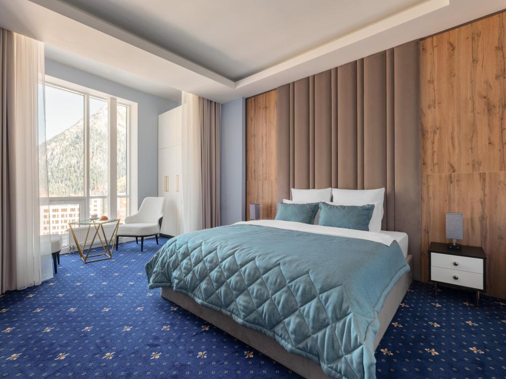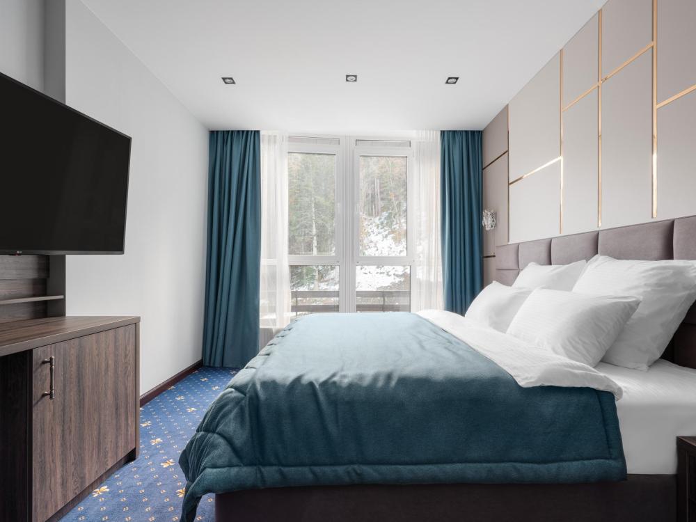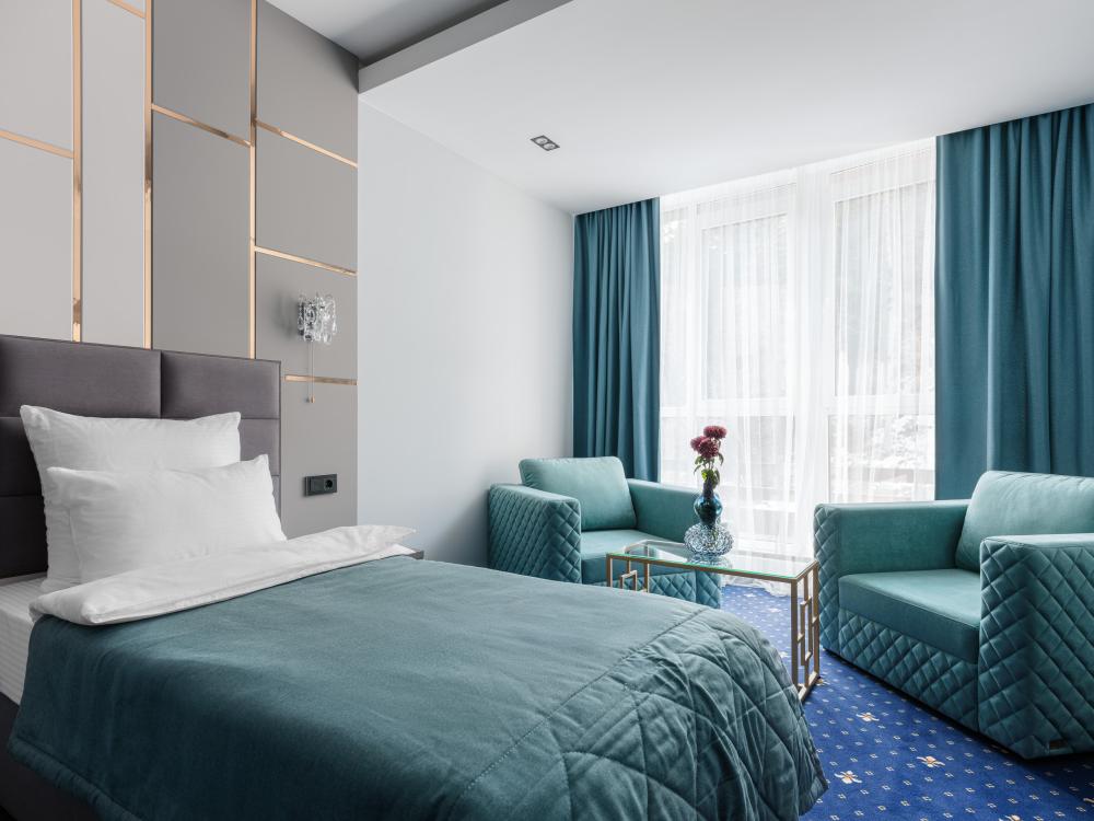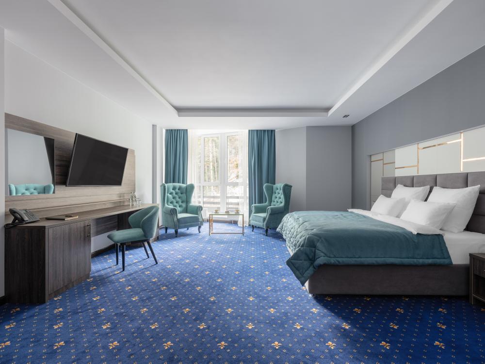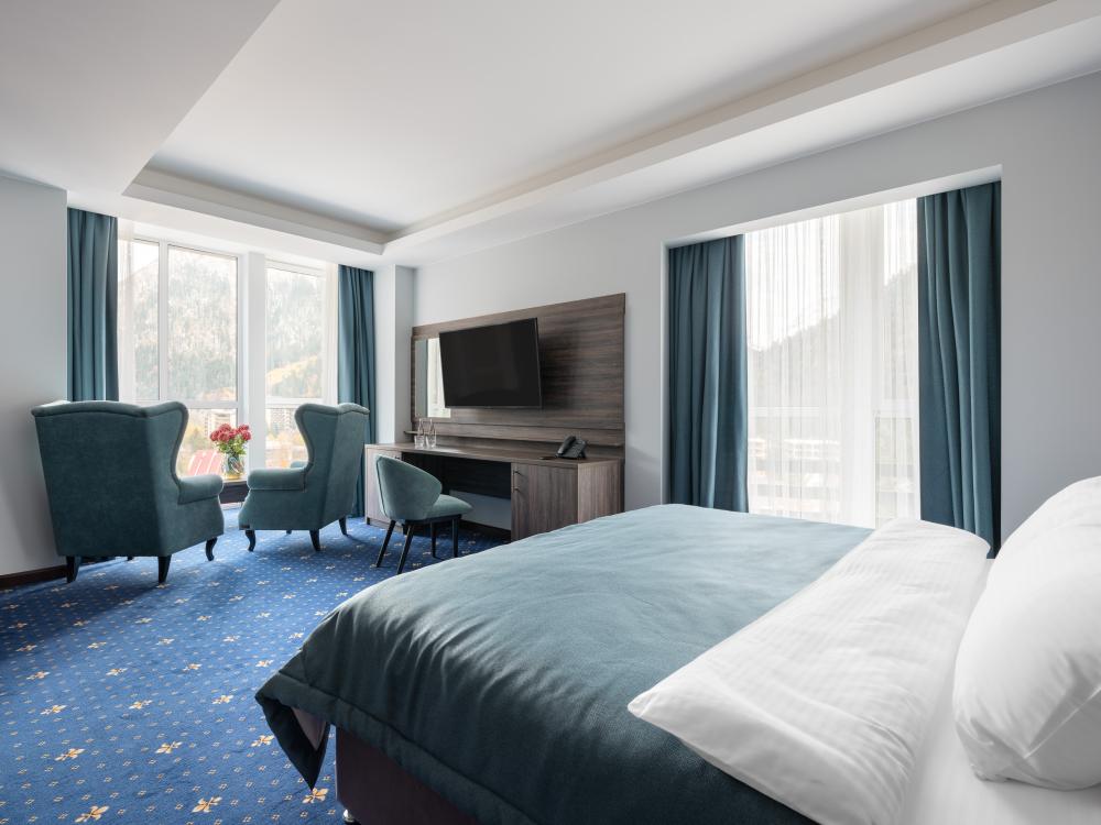 Просторный номер с панорамными окнами , которые заливают его солнечным светом, открывая невероятный вид на горные вершины. В номере двухспальная кровать или две односпальные кровати с ортопедическим матрасом, что гарантирует вам крепкий сон. Мягкие кресла . Полы покрыты ковровым покрытием Изысканная сантехника в современном дизайне добавляет элегантности в атмосферу ванной комнаты. Санузел оборудован ванной, унитазом и биде
