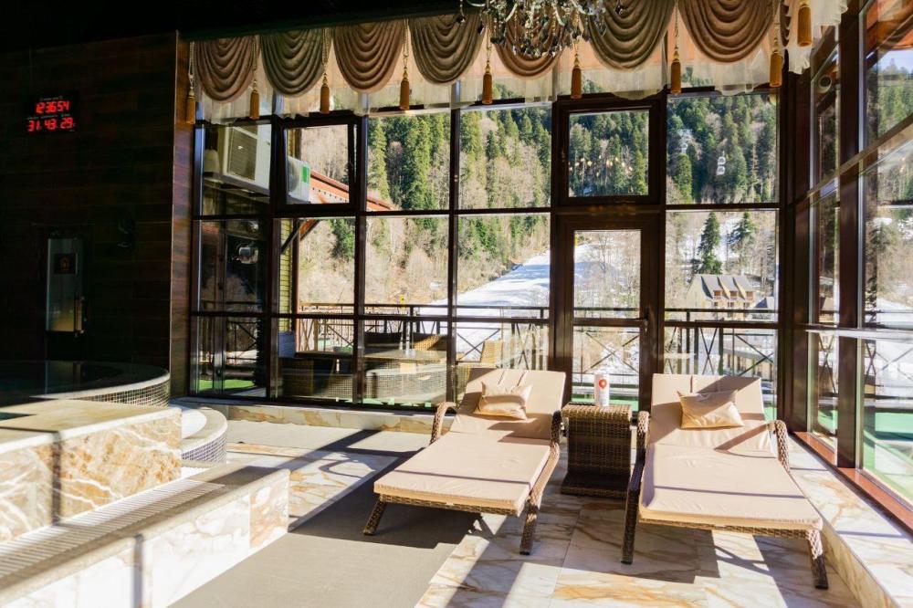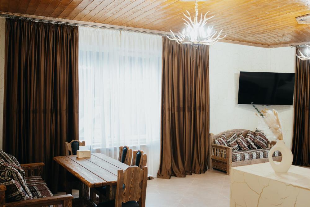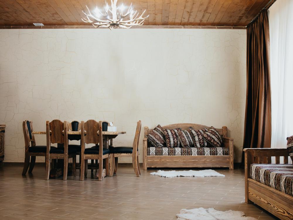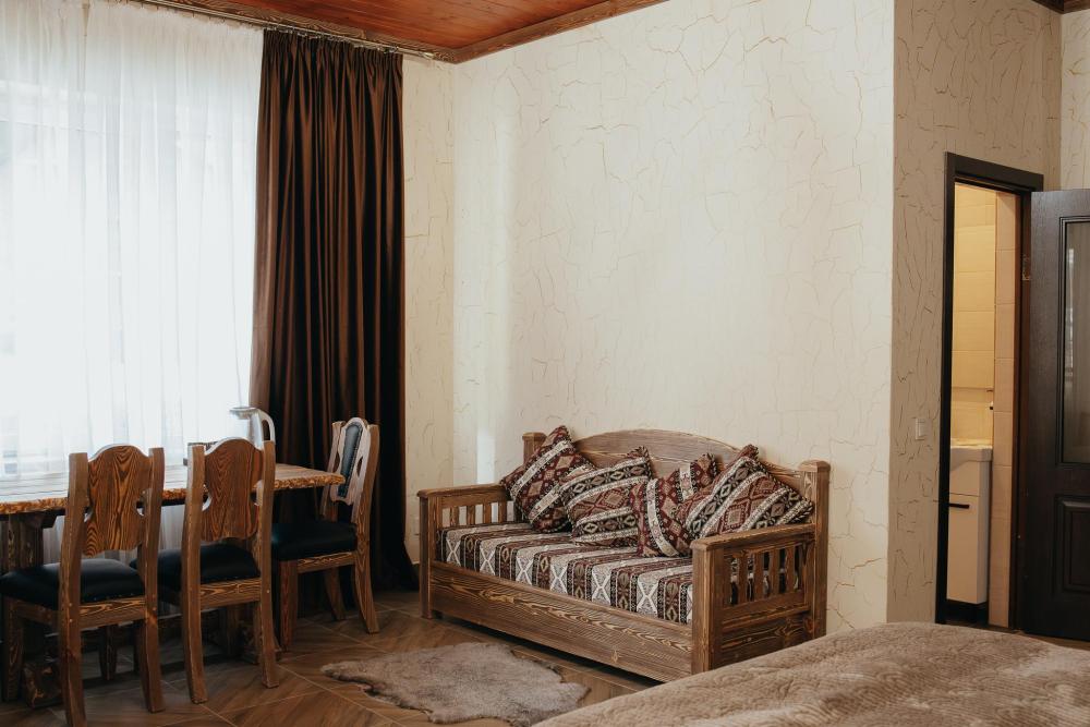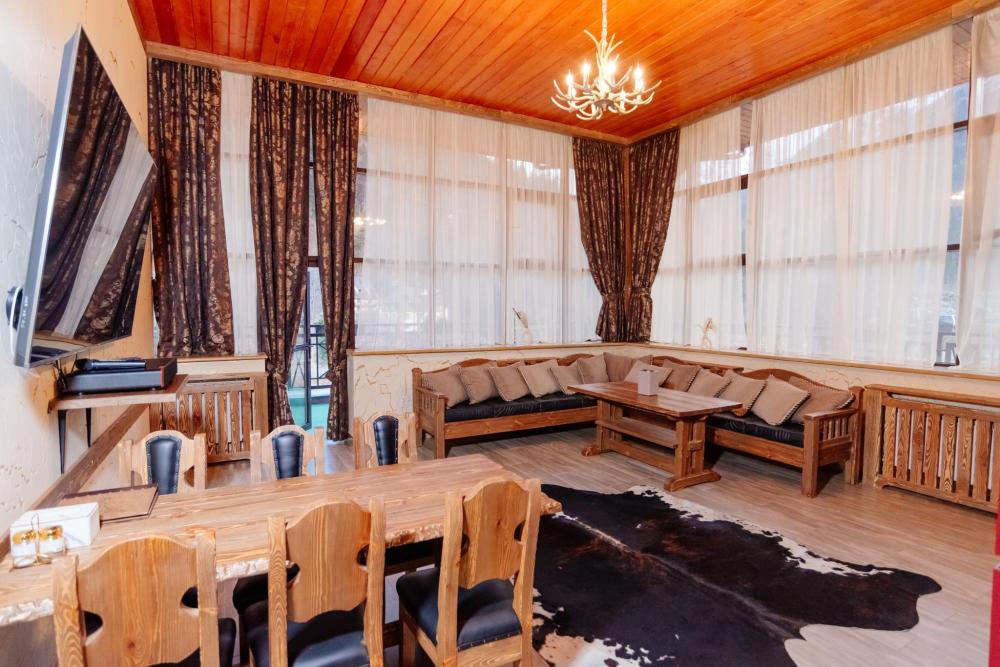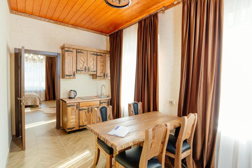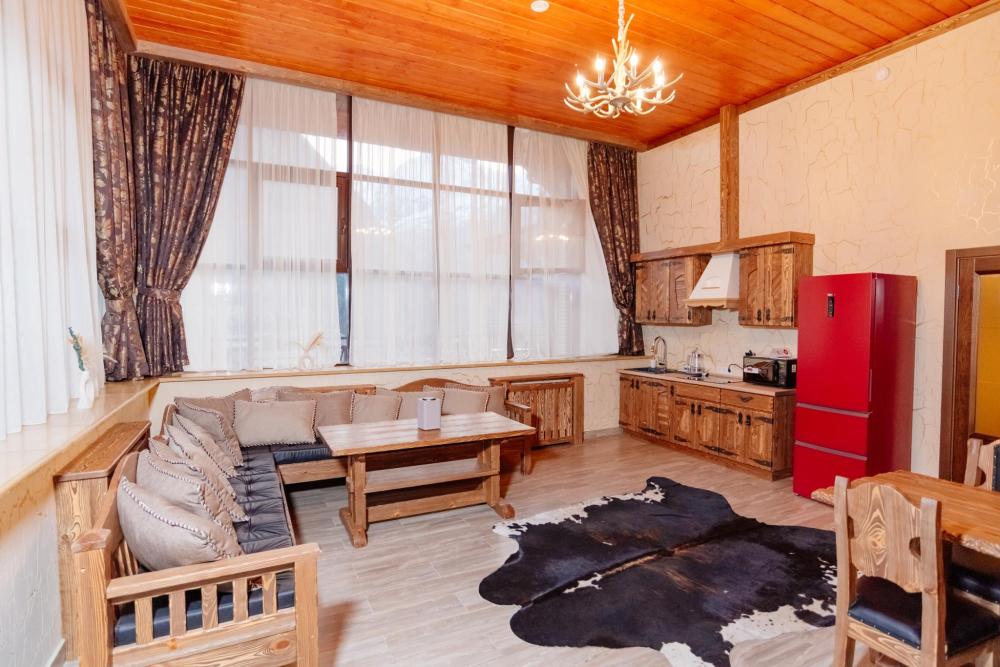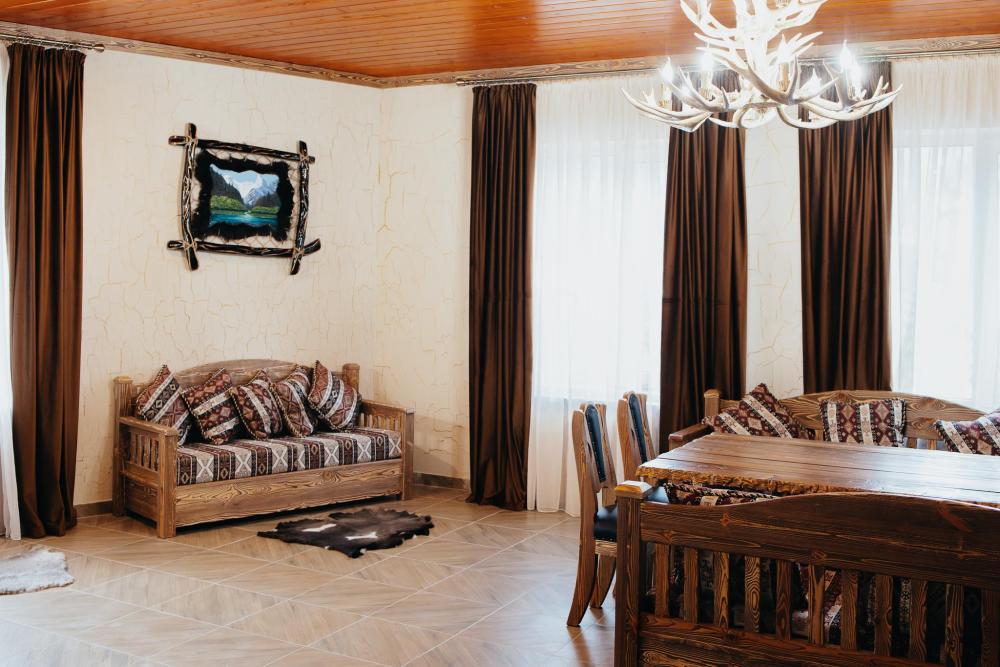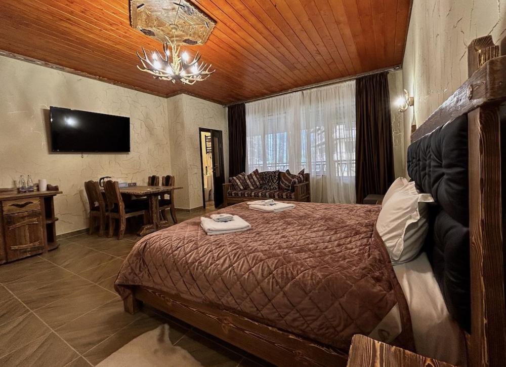 Дизайн выполнен в альпийском стиле. В стоимость проживания включено посещение двух СПА комплексов на протяжении всего отдыха. В номере двухспальная кровать с комфортным ортопедическим матрасом, два двуспальных дивана, кухня и обеденный стол. Номер оснащен плазменной панелью со спутниковыми каналами, караоке, WI-FI, холодильником. Два санузла, в ванной комнате предлагаются: косметические средства, фен.