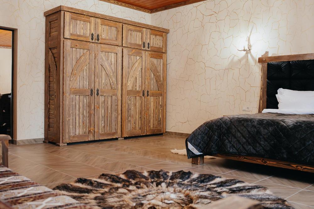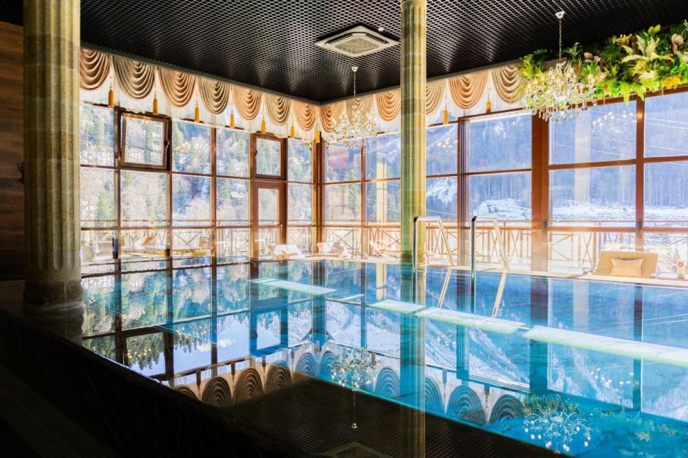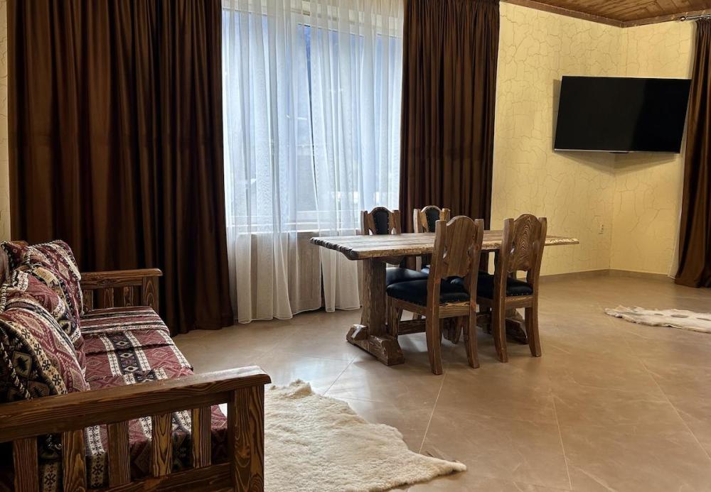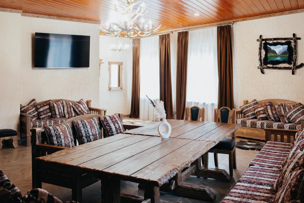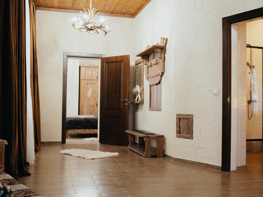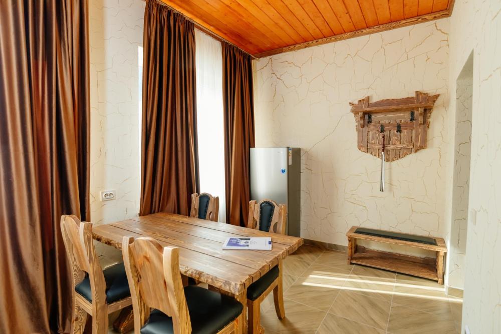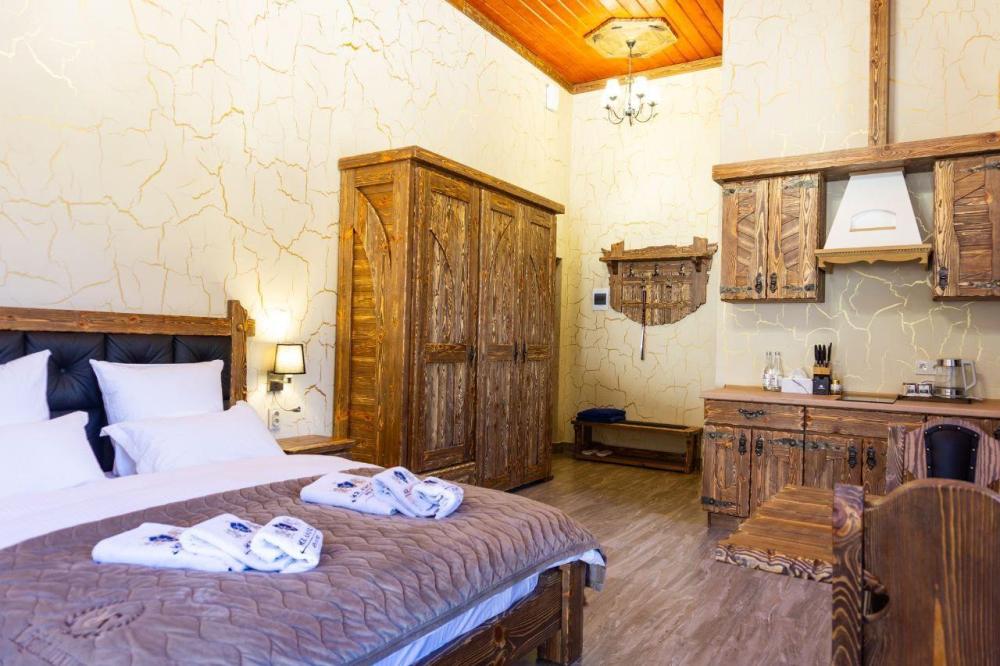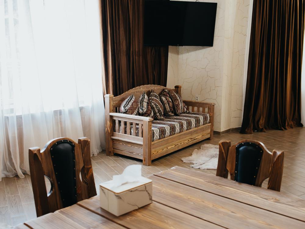 Дизайн выполнен в альпийском стиле. В стоимость проживания включено посещение двух СПА комплексов на протяжении всего отдыха. В номере двухспальная кровать с комфортным ортопедическим матрасом, два двуспальных дивана, кухня и обеденный стол. Номер оснащен плазменной панелью со спутниковыми каналами, караоке, WI-FI, холодильником. Два санузла, в ванной комнате предлагаются: косметические средства, фен.