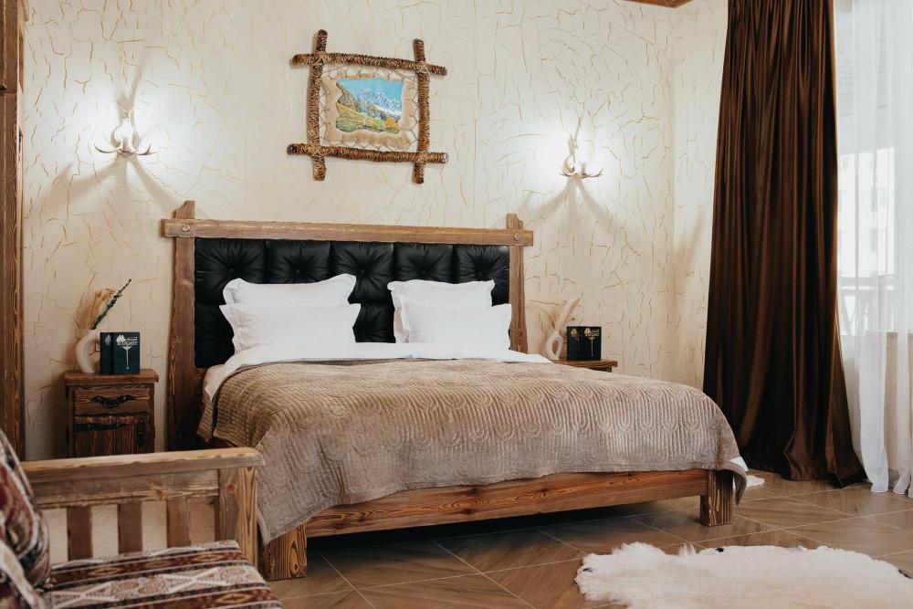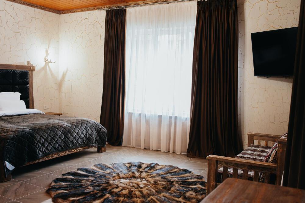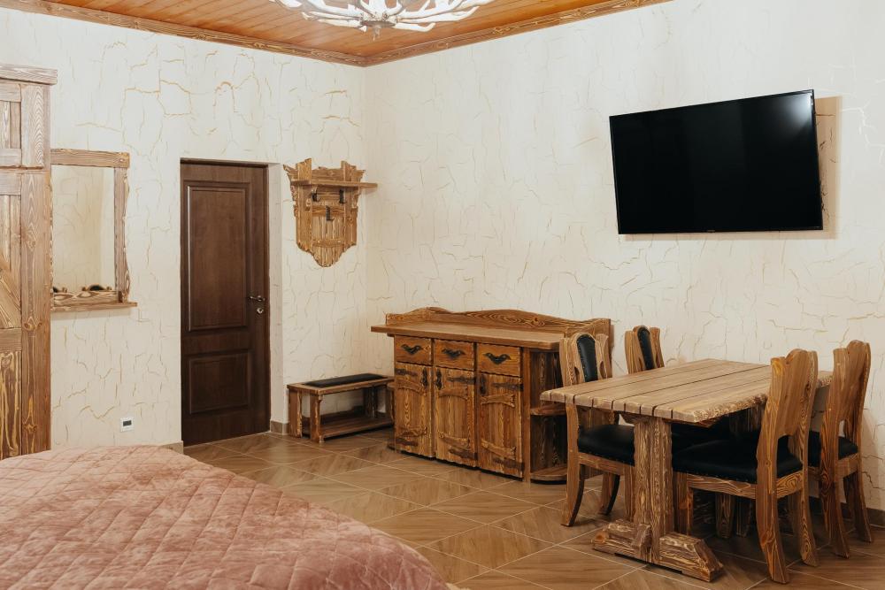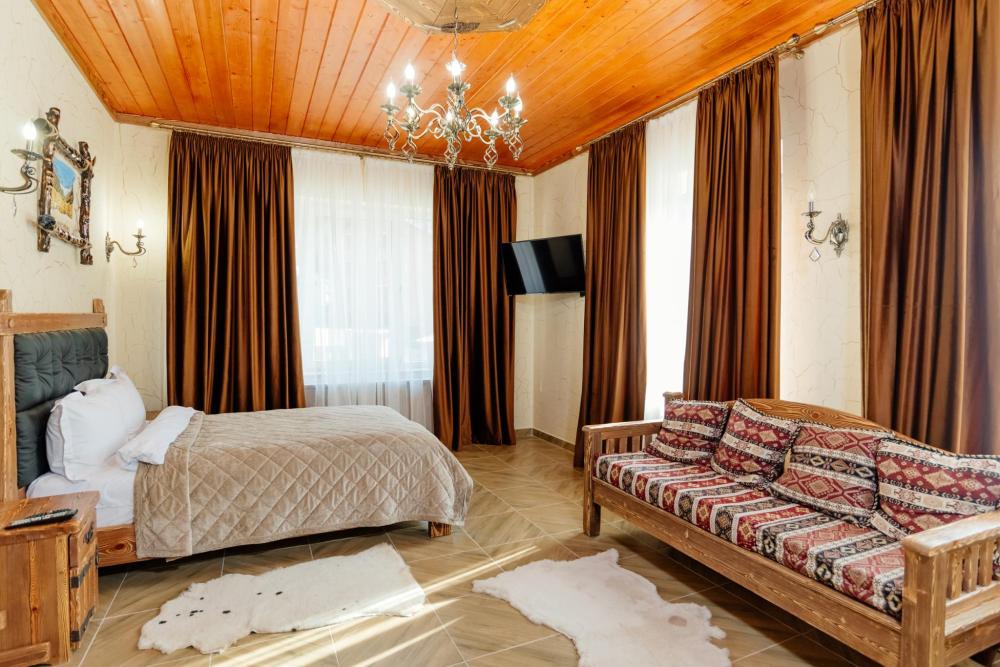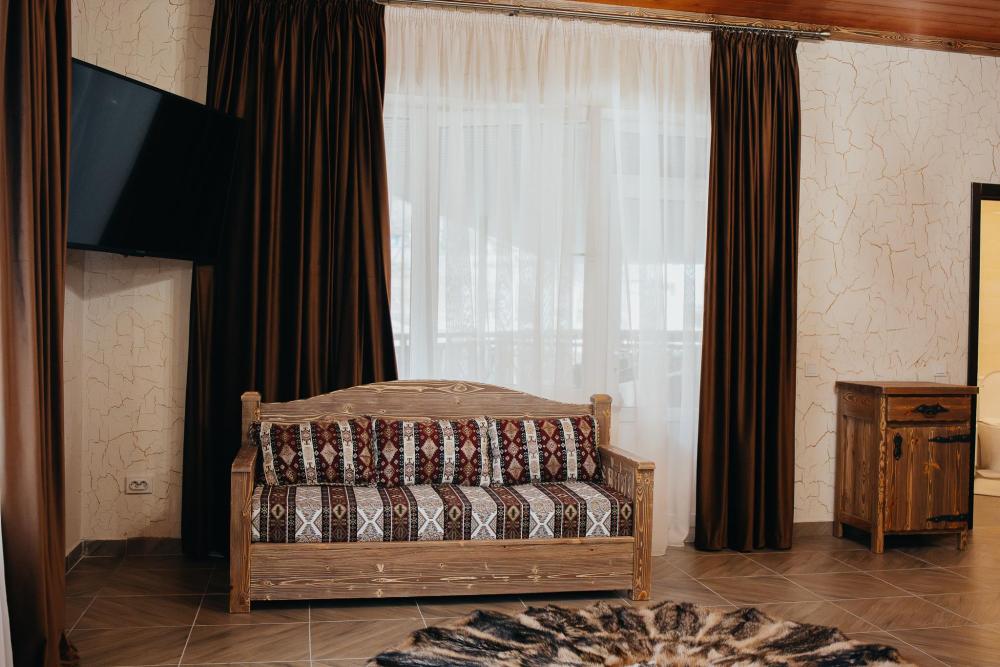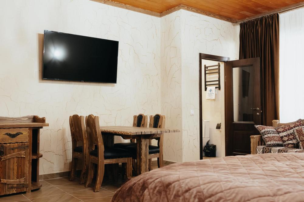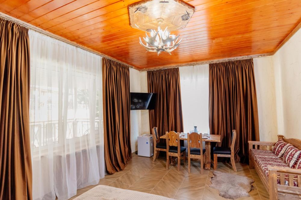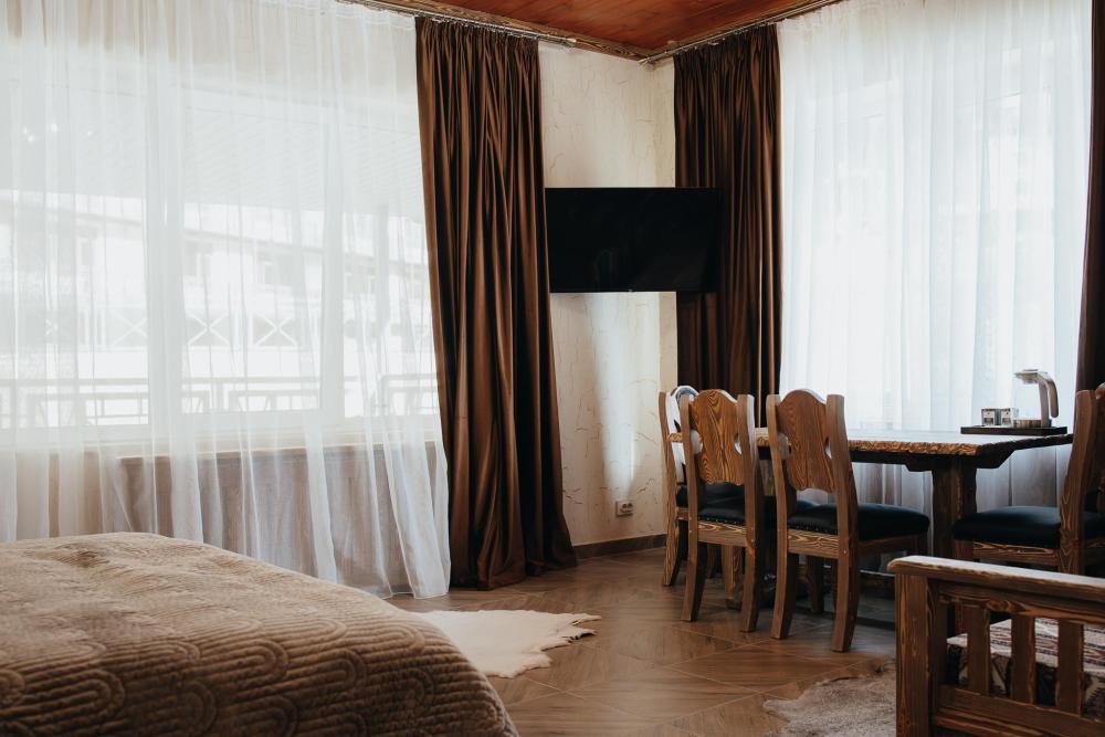 Дизайн выполнен в альпийском стиле. В стоимость проживания включено посещение двух СПА комплексов на протяжении всего отдыха. В номере двухспальная кровать с комфортным ортопедическим матрасом, двуспальный диван, обеденный стол. Номер оснащен плазменной панелью со спутниковыми каналами, WI-FI, мини-холодильником, В ванной комнате предлагаются: косметические средства, фен.