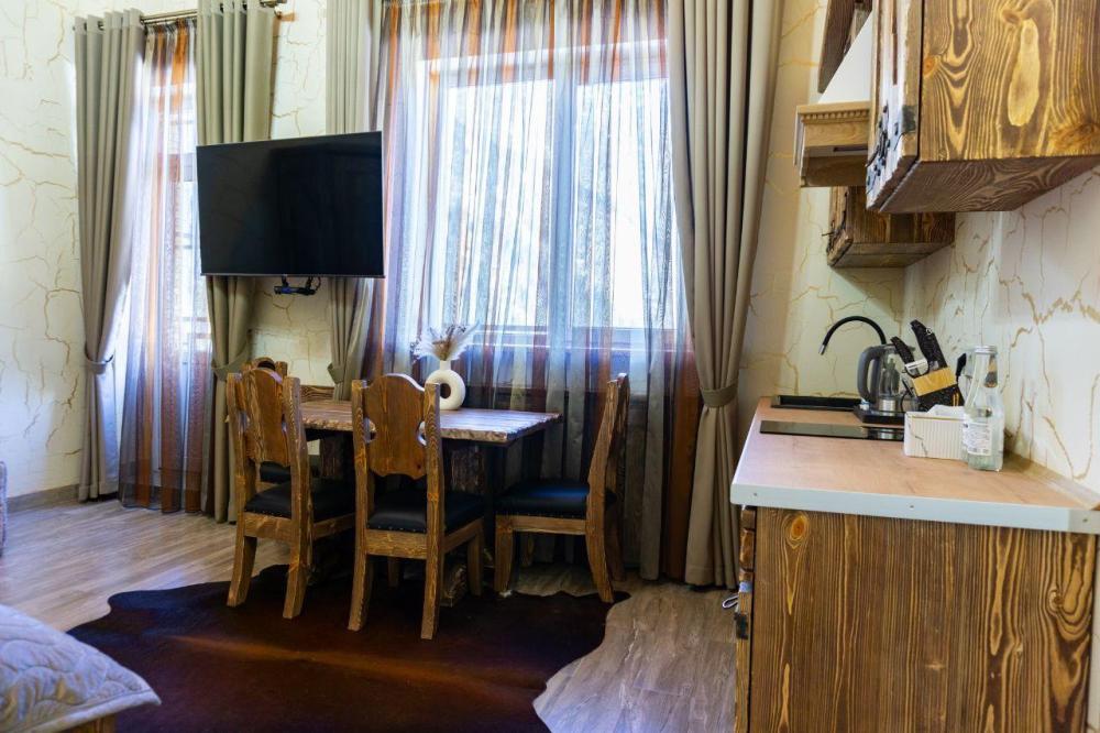Дизайн выполнен в альпийском стиле. В стоимость проживания включено посещение двух СПА комплексов на протяжении всего отдыха. В номере кухня со всем необходимым, двухспальная кровать с комфортным ортопедическим матрасом, двуспальный диван, обеденный стол. Номер оснащен плазменной панелью со спутниковыми каналами, WI-FI, мини-холодильником, В ванной комнате предлагаются: косметические средства, фен.