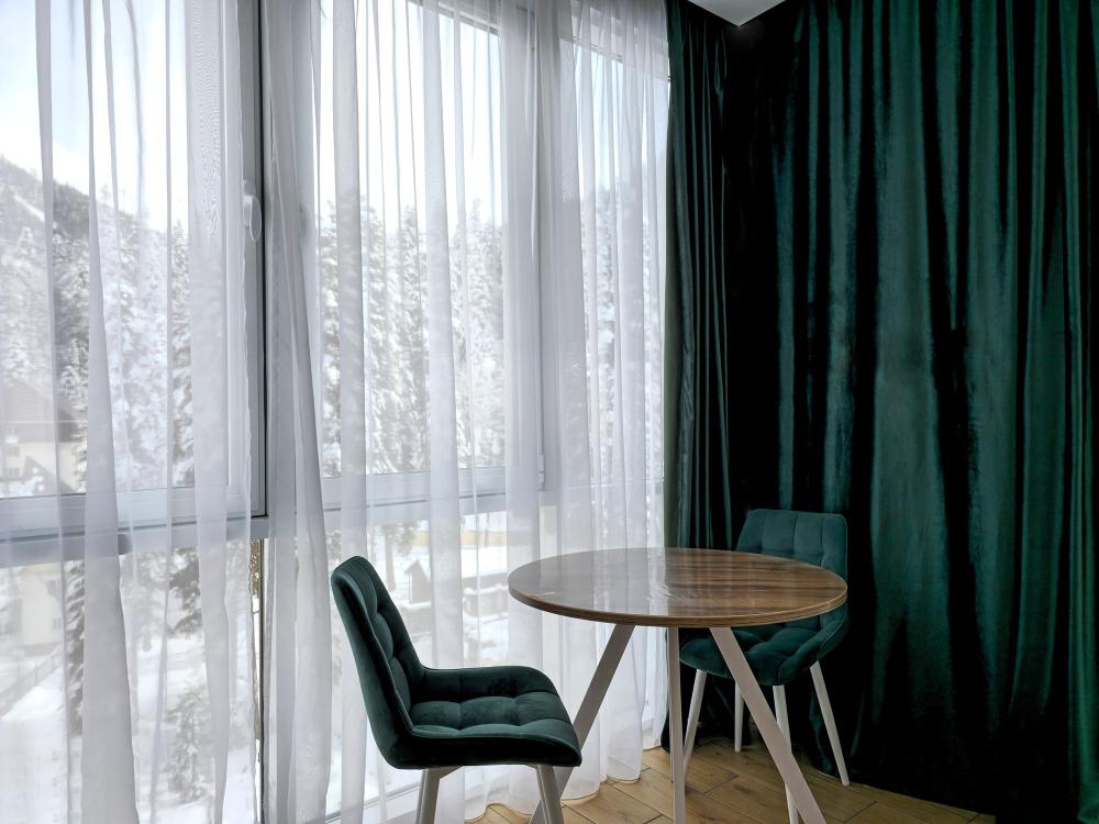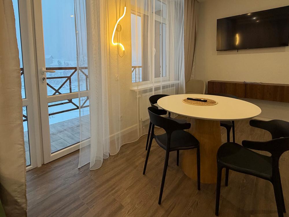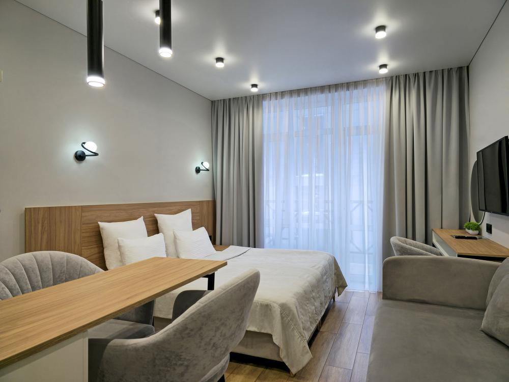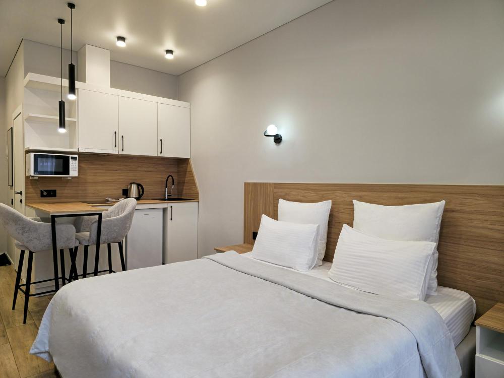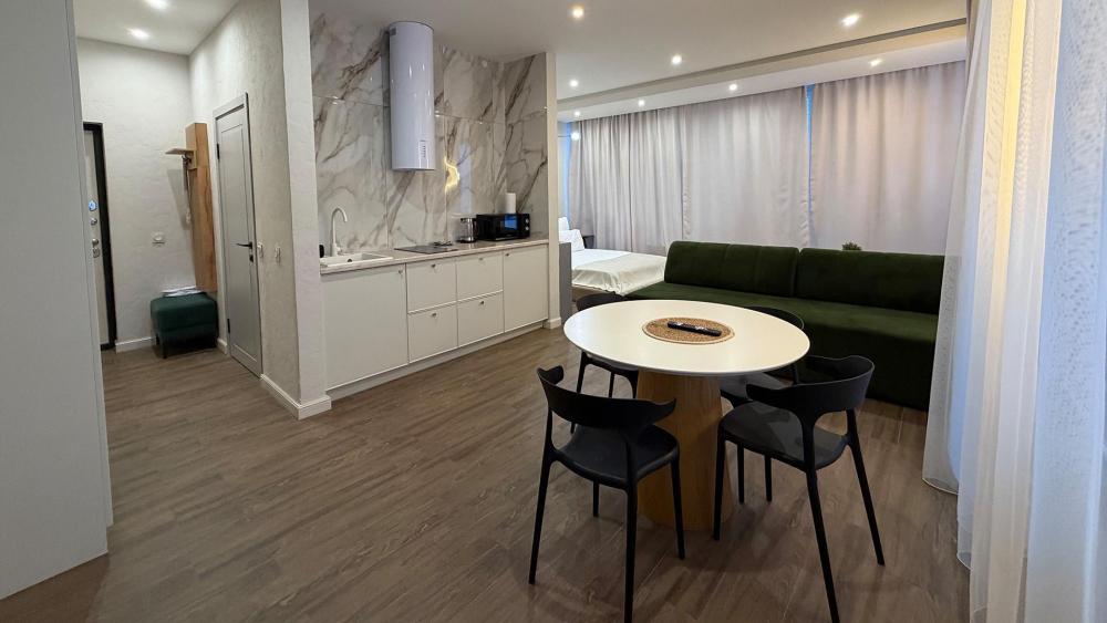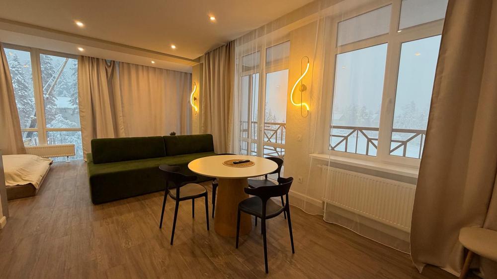 Номера категории «Люкс» с современным дизайном: продуманное объединённое пространство включает спальню, комфортную зону отдыха с диваном и кухонную зону с обеденным столом, где приятно наслаждаться трапезами и общением. Интерьер выполнен в спокойных тонах, создающих атмосферу уюта и тепла. Большие окна обеспечивают естественное освещение и открывают вид на окрестности.