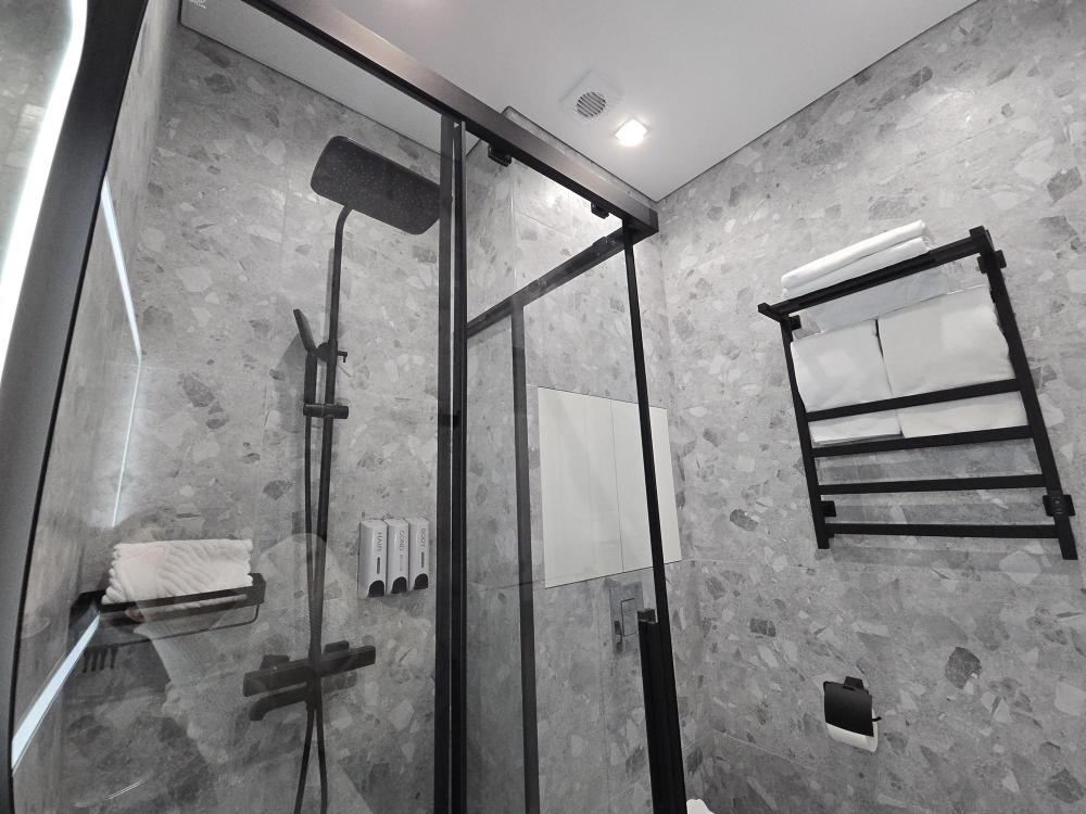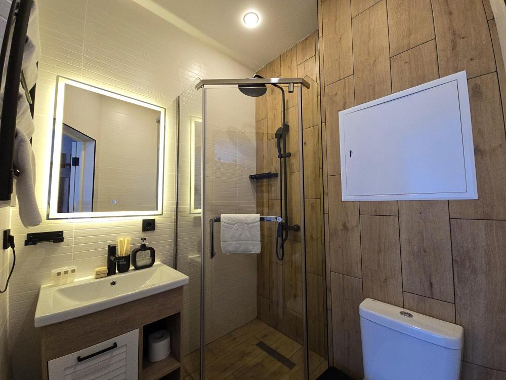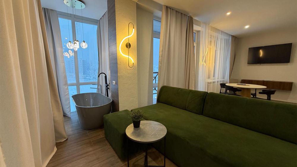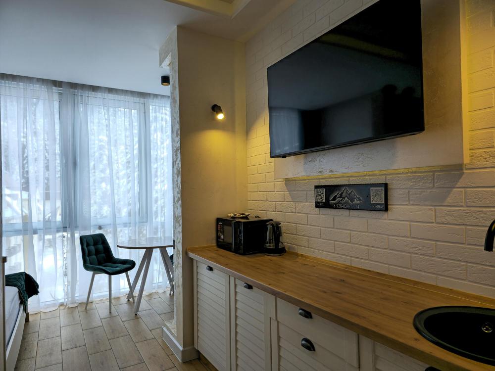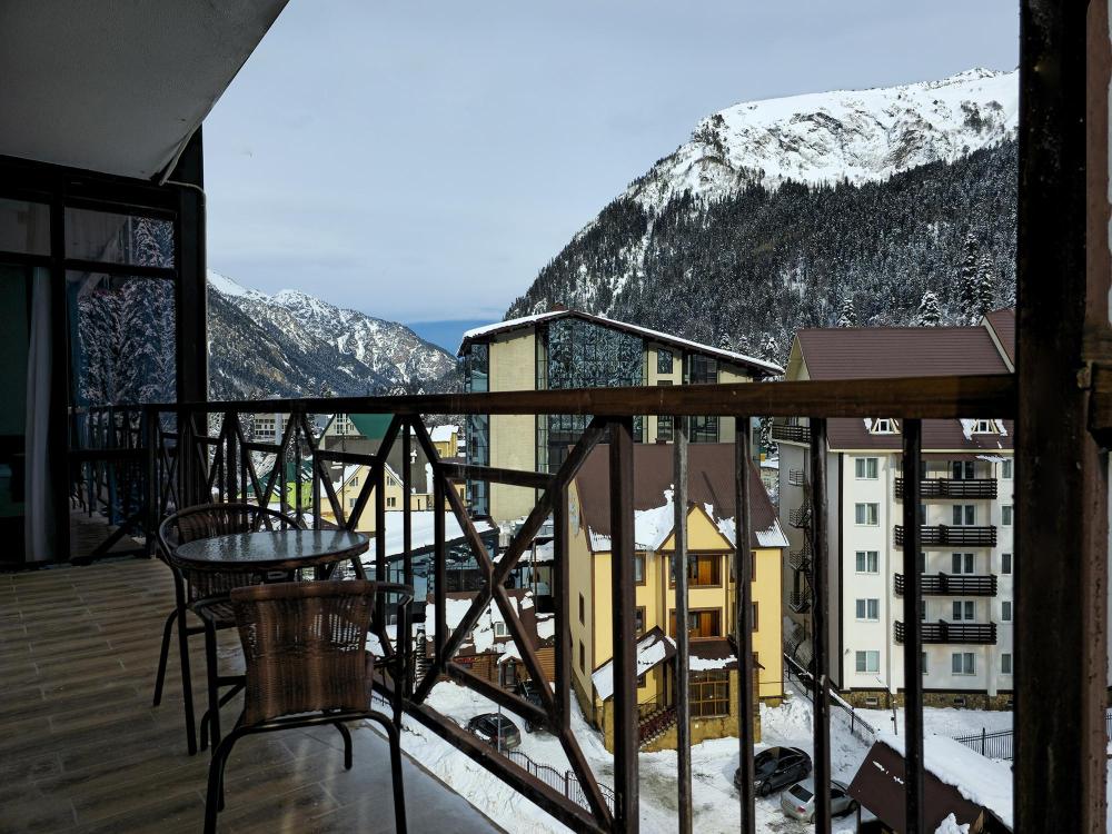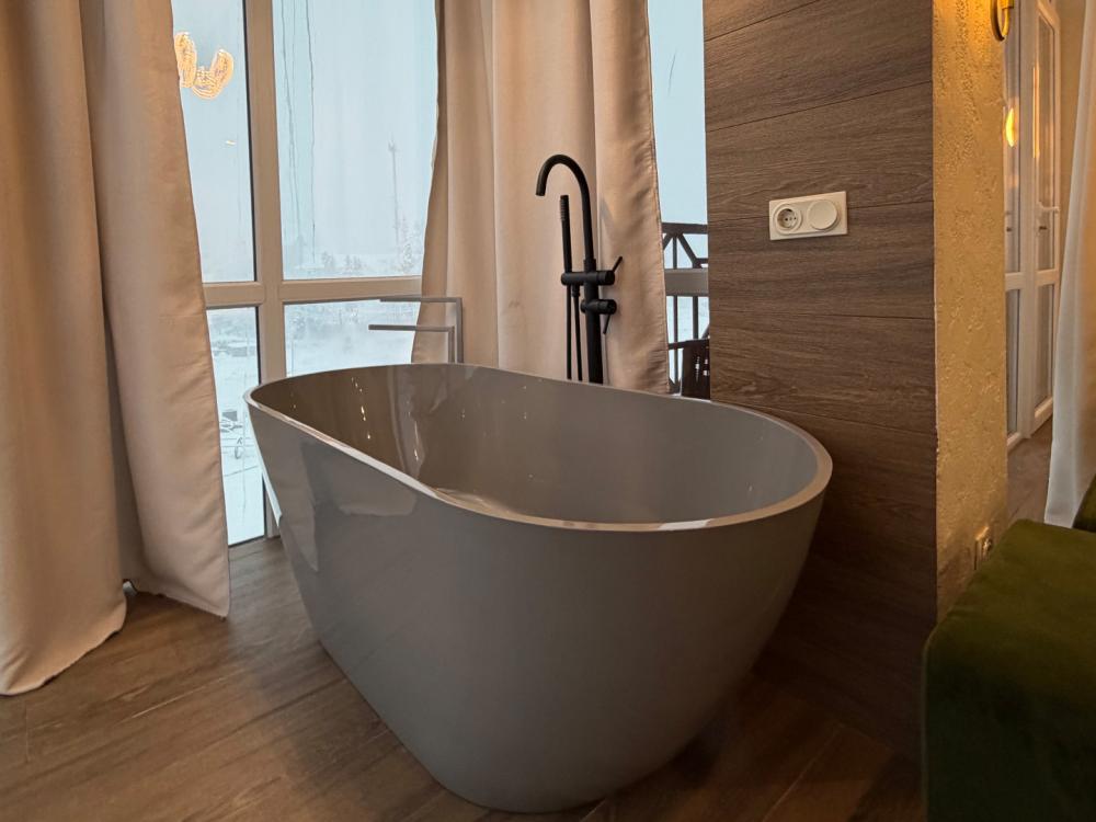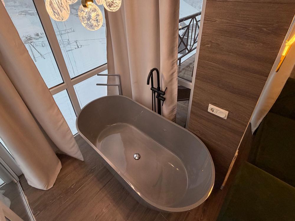 Стильные просторные номера, созданные для отдыха «с картинкой». Главная фишка категории — отдельностоящая ванна у панорамного окна с видом на горы Домбая: можно принимать ванну и любоваться вершинами и огнями курорта. В каждом номере — двуспальная кровать, уютная зона отдыха с диваном и дизайнерским светом, большой ТВ. Есть мини-кухня (варочная поверхность, мойка, микроволновка, кофемашина) и обеденный стол. Дополняет впечатление балкон с прекрасным видом.