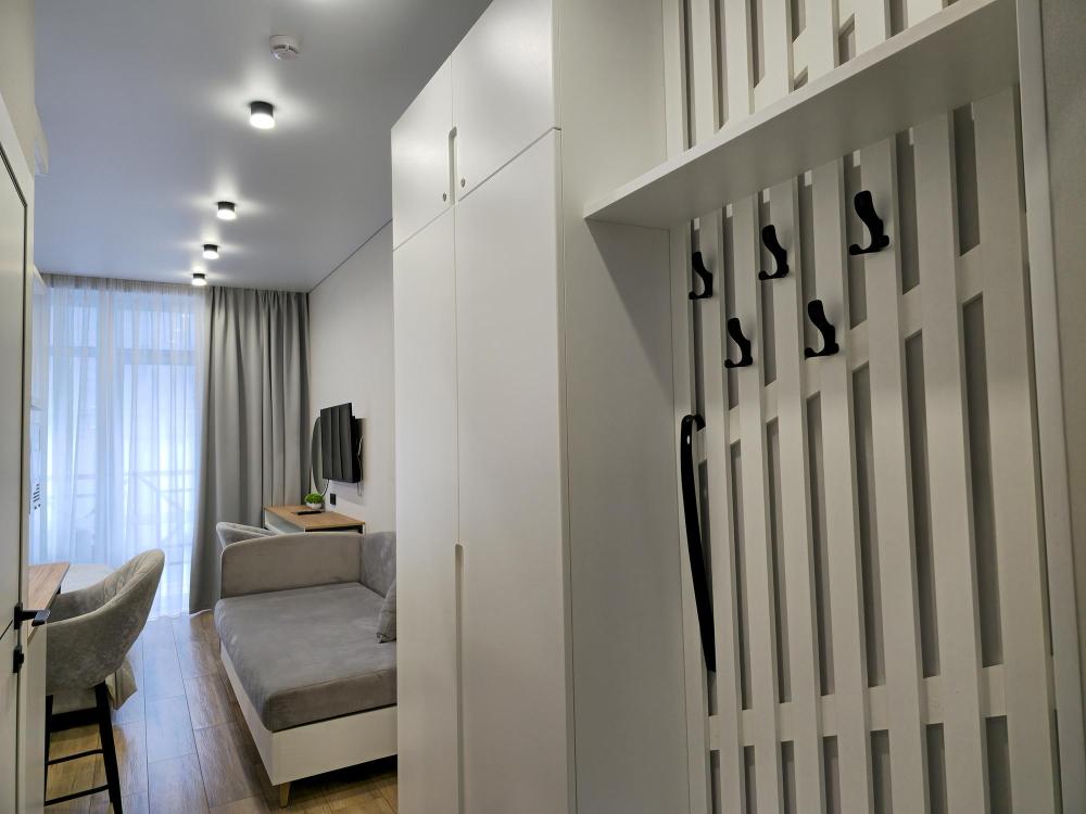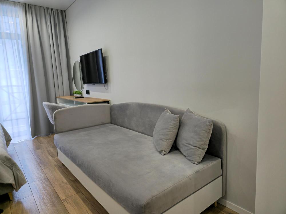 Номера категории «Стандарт комфорт+» — это стильное и уютное пространство в нейтральных тонах. Просторная кровать и удобный диван обеспечивают комфортный отдых, а функциональная кухня позволяет с удобством готовить. С балкона номера открывается живописный вид на горы. Номера категории «Стандарт комфорт» расположены на 4,5,7 этажах.