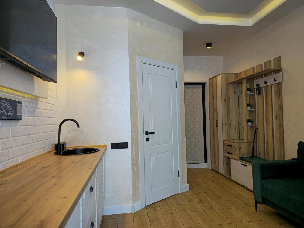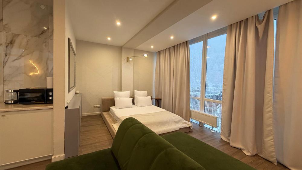 Номера категории «Студия комфорт» — это стильное и функциональное пространство, созданное для комфортного отдыха. В каждом номере предусмотрена просторная комната с удобной кроватью, а также зона отдыха с диваном и креслами. Кухонная зона оборудована всем необходимым для приготовления пищи, а в обеденной зоне можно с комфортом насладиться трапезой. Большие панорамные окна обеспечивают естественное освещение и открывают вид на окрестности.