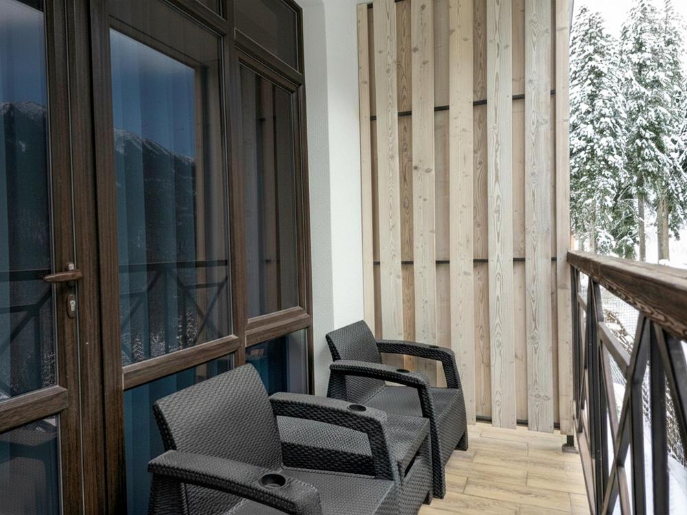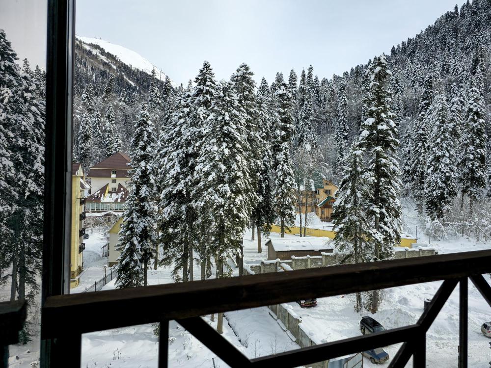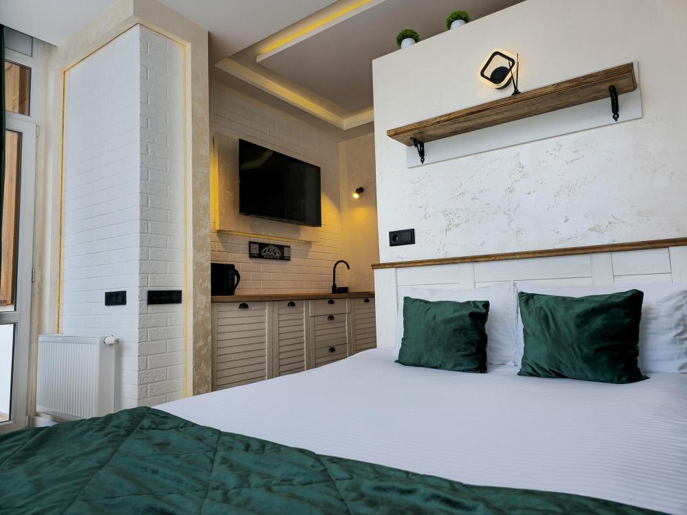 Номер категории «Стандарт комфорт» — это стильное и уютное пространство в нейтральных тонах. Просторная кровать и удобный диван обеспечивают комфортный отдых, а функциональная кухня позволяет с удобством готовить. С балкона номера открывается живописный вид на горы.
