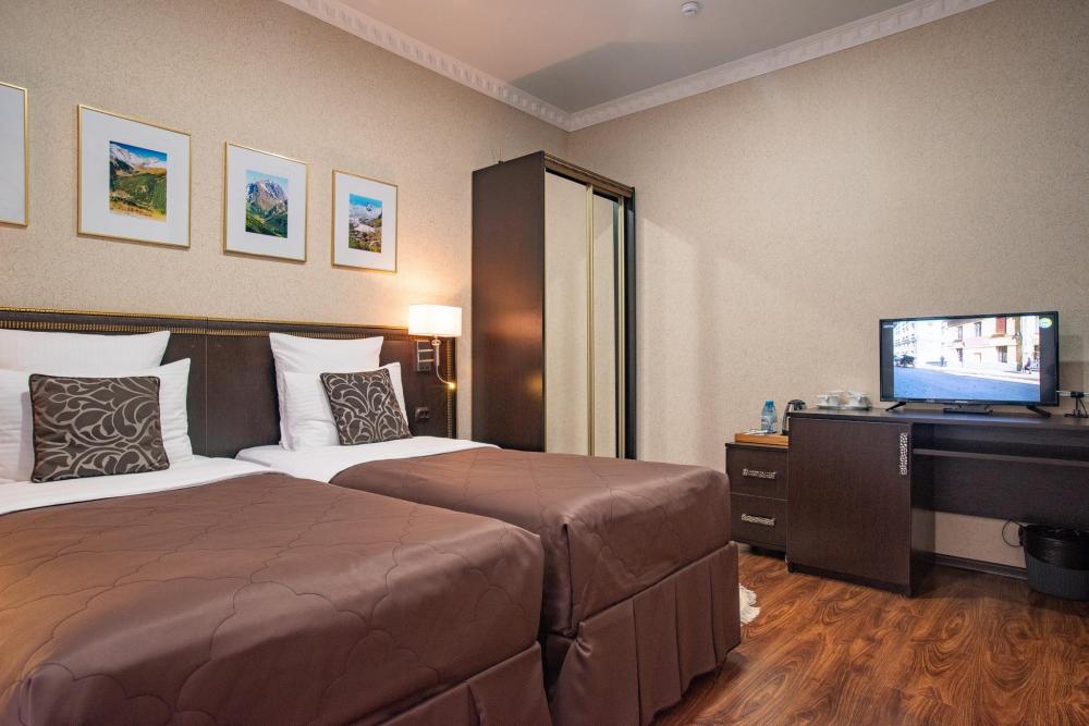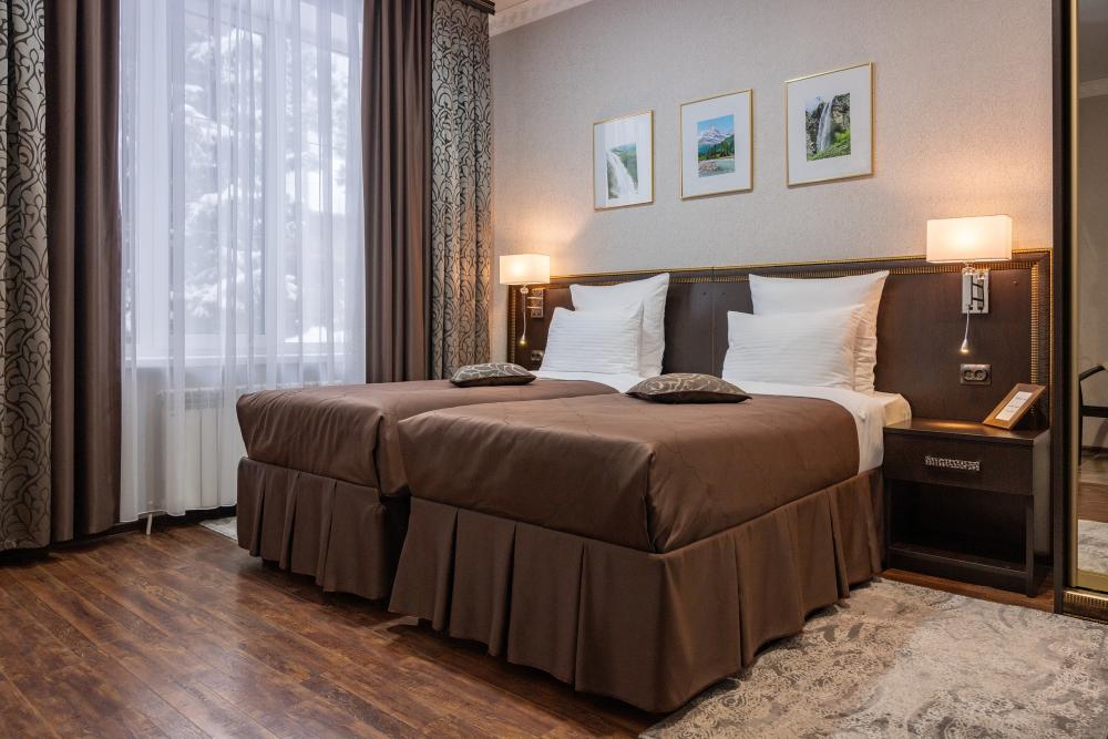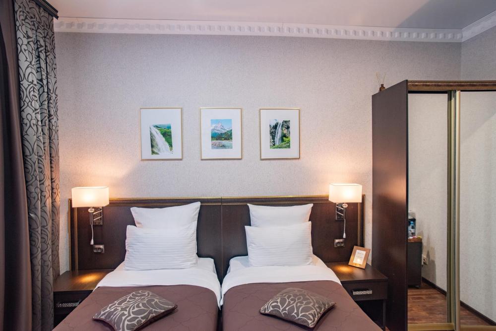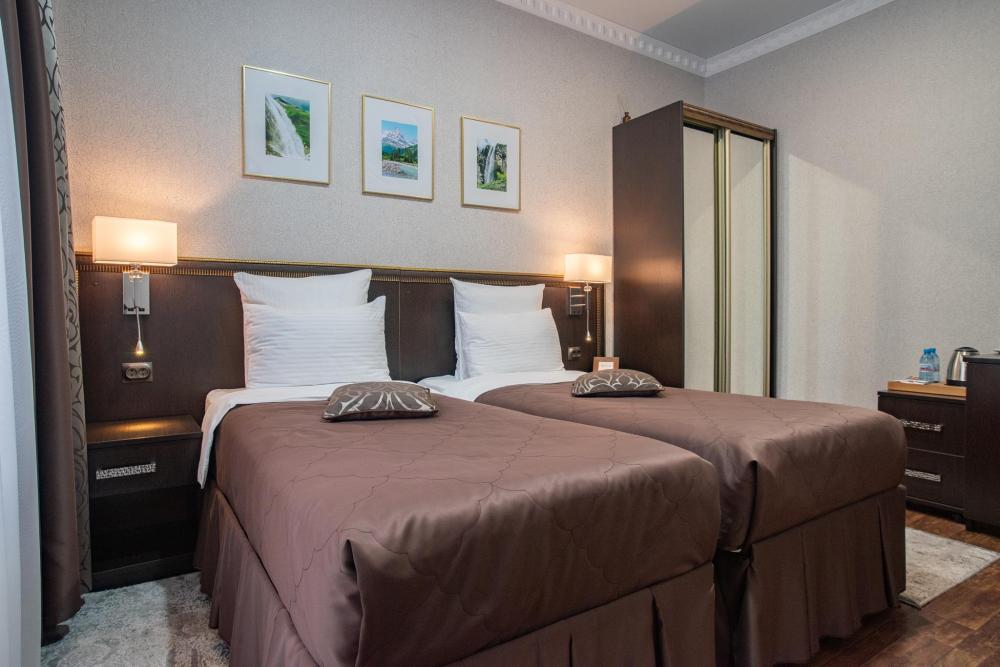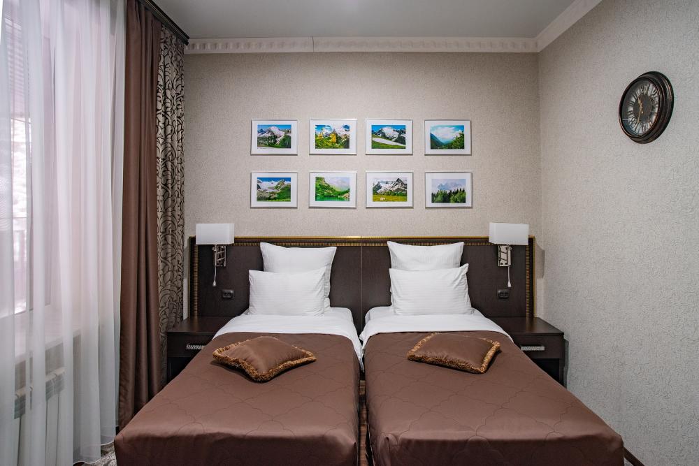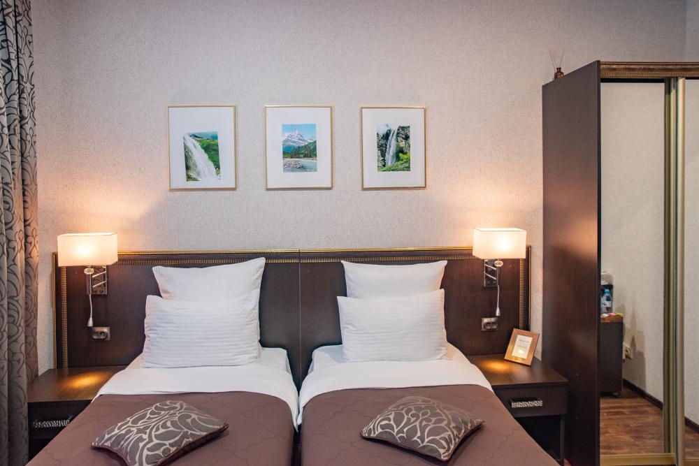 Однокомнатный номер, выполненный в уютном интерьере для 2-местного размещения, расположен в Основном корпусе на 1 этаже. В номере имеется спальная зона с двумя односпальными кроватями с ортопедическим матрацем, прикроватные тумбы, шкаф-купе с зеркалом, рабочий стол и стул, LED телевизор диагональю 32 дюйма, 20 каналов TV, вешалка для верхней одежды, полка для обуви, ванная комната. Отопление - батарея, теплый пол. Вместимость до 2 человек + один ребенок до 6 лет с предоставлением спального места. В стоимость номера входит завтрак, парковка, WiFi.
