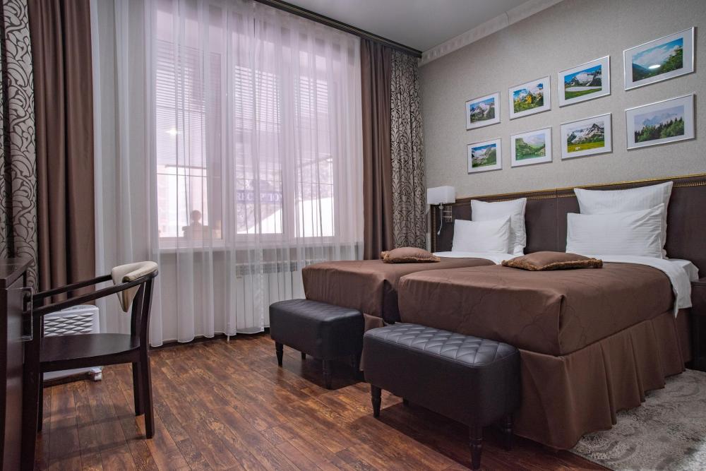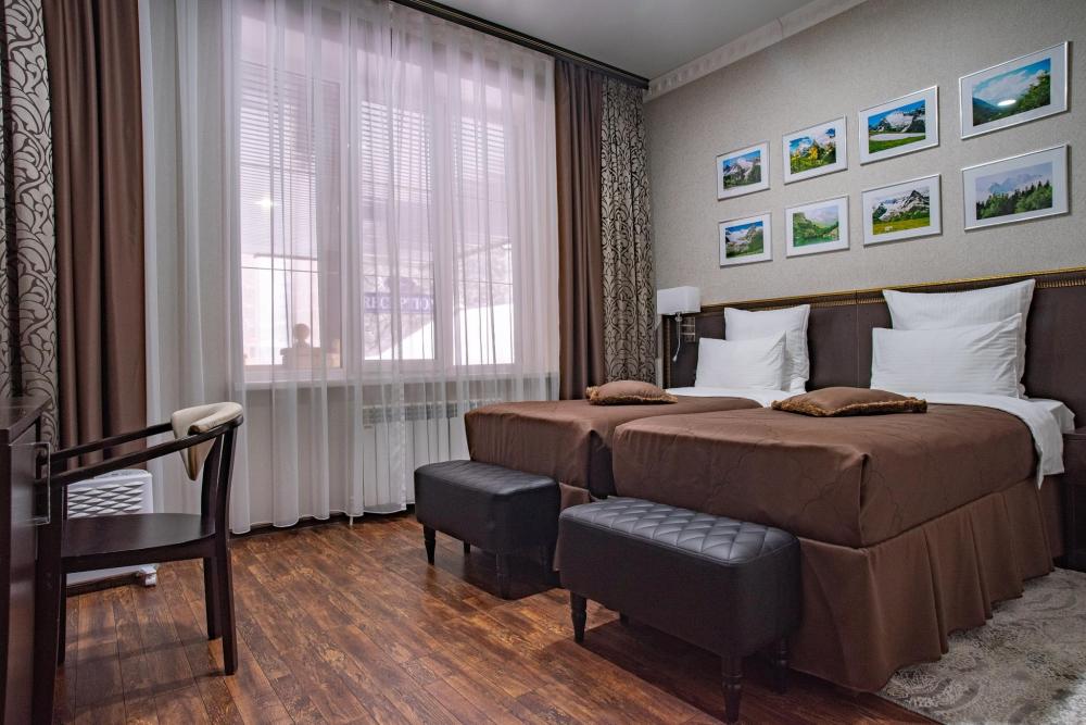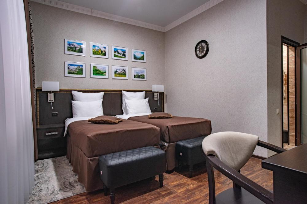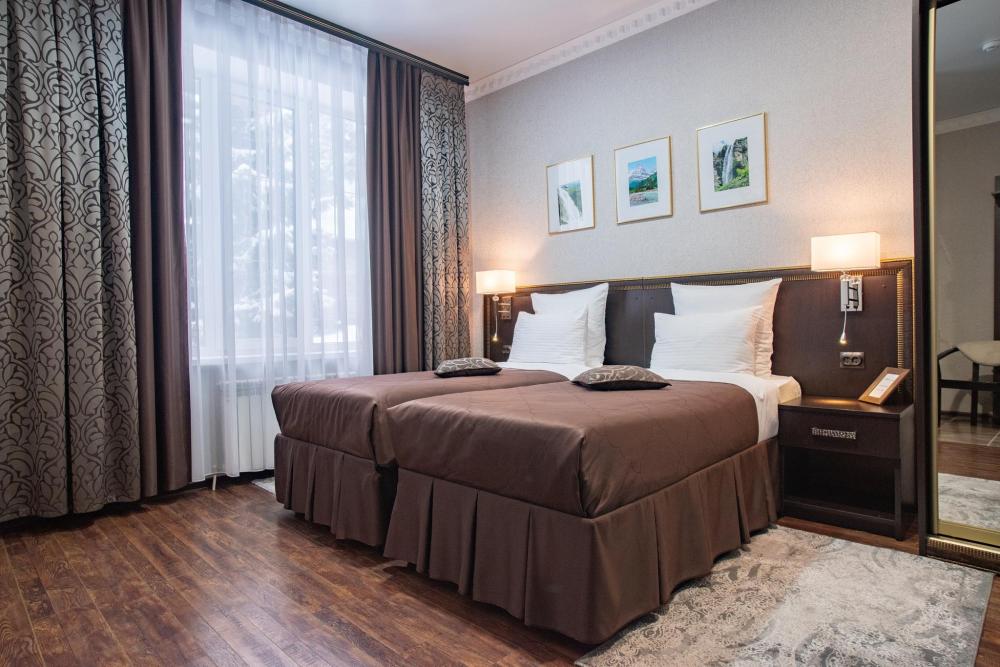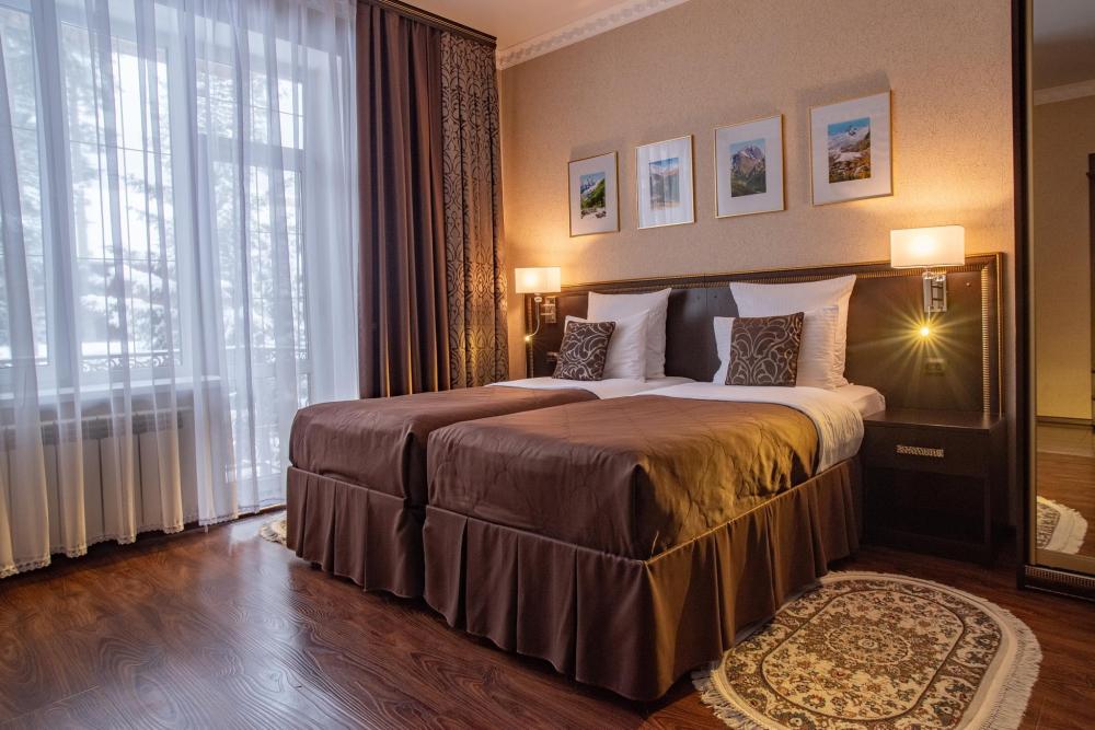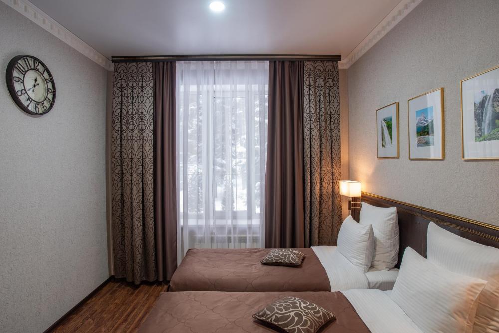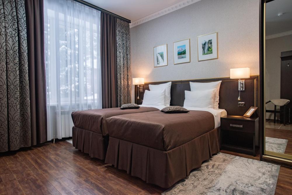 Однокомнатный номер, выполненный в уютном интерьере для 2-местного размещения, расположен в Основном корпусе на 1 этаже. В номере имеется спальная зона с двумя односпальными кроватями с ортопедическим матрацем, прикроватные тумбы, шкаф-купе с зеркалом, рабочий стол и стул, LED телевизор диагональю 32 дюйма, 20 каналов TV, вешалка для верхней одежды, полка для обуви, ванная комната. Отопление - батарея, теплый пол. Вместимость до 2 человек + один ребенок до 6 лет с предоставлением спального места. В стоимость номера входит завтрак, парковка, WiFi.