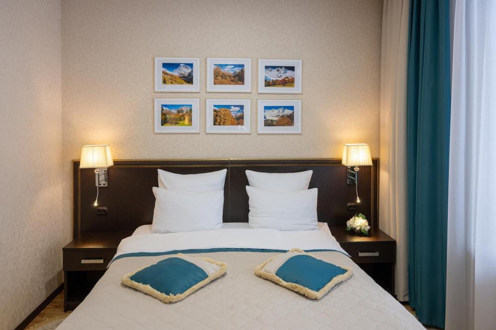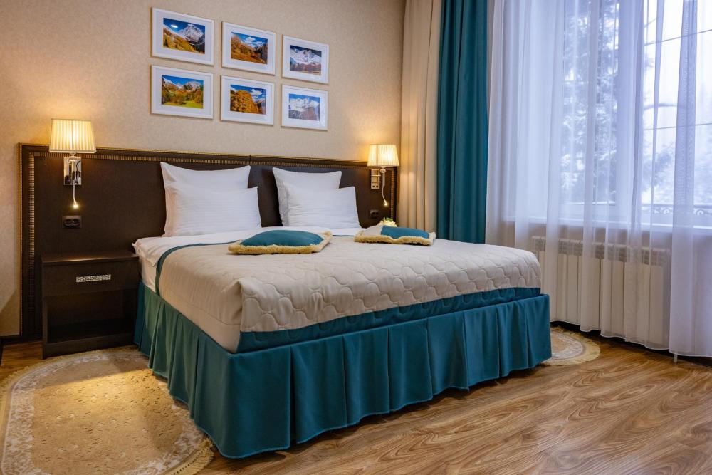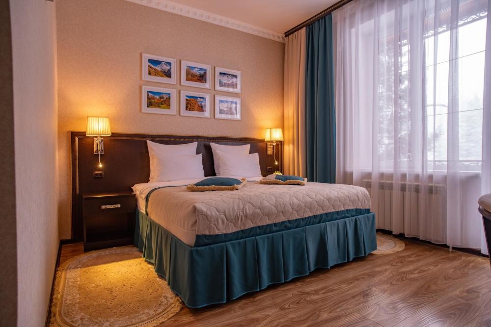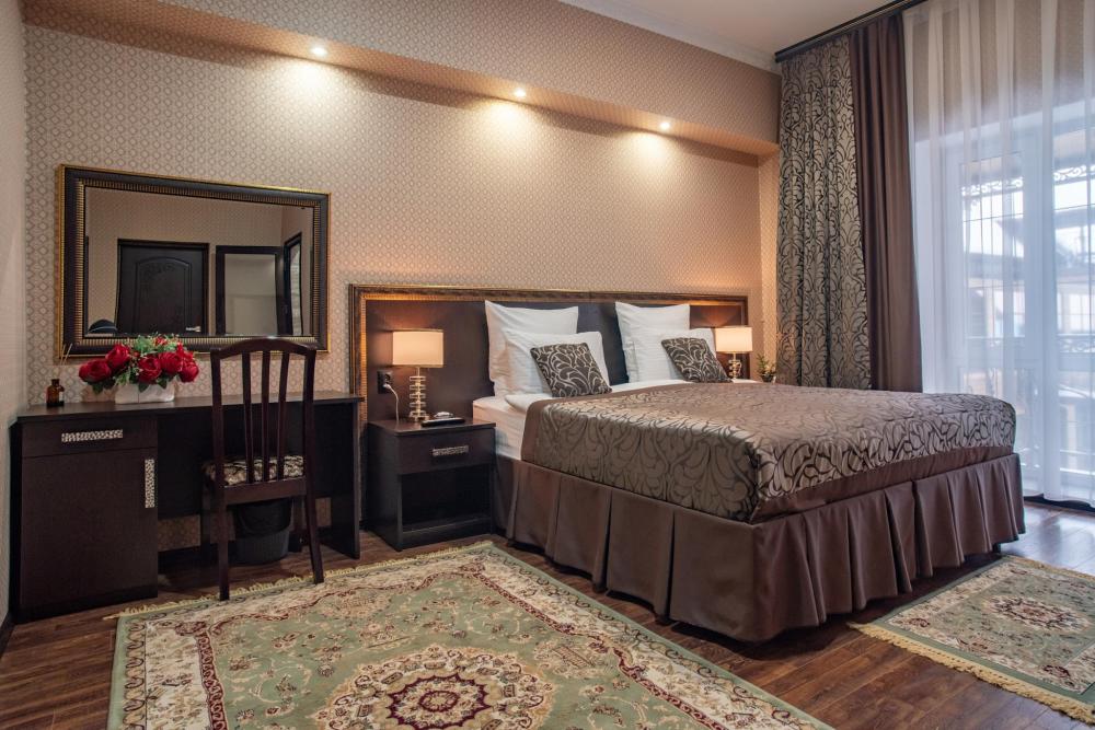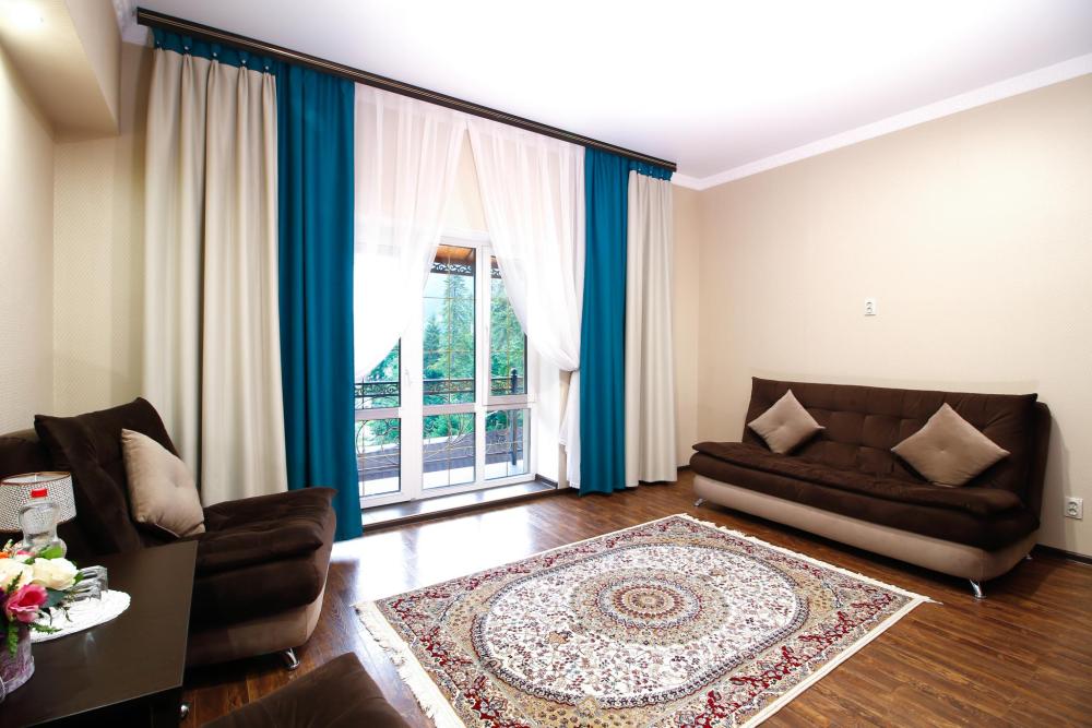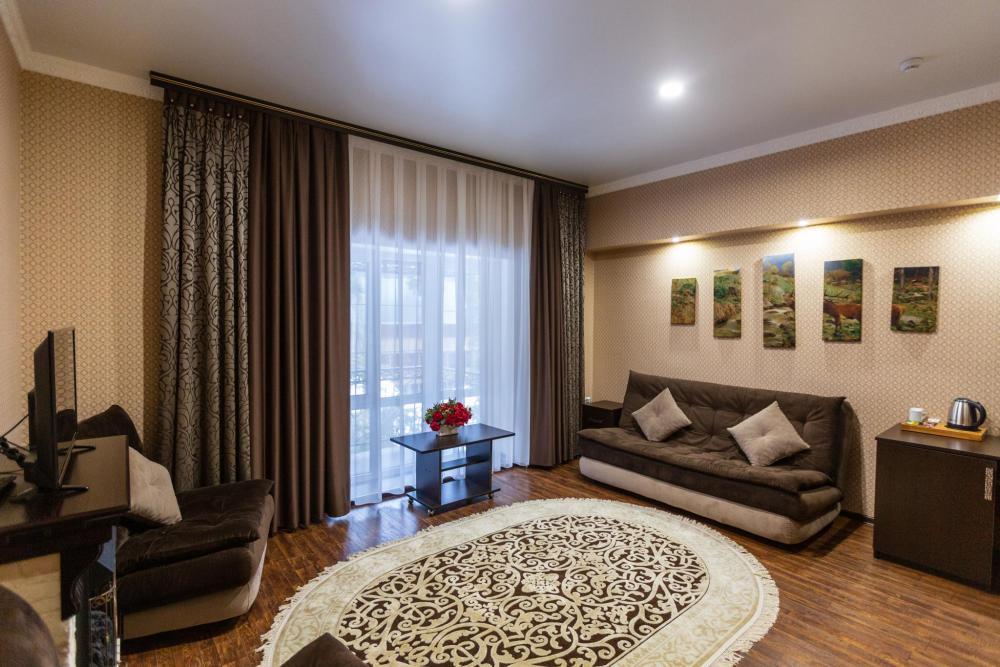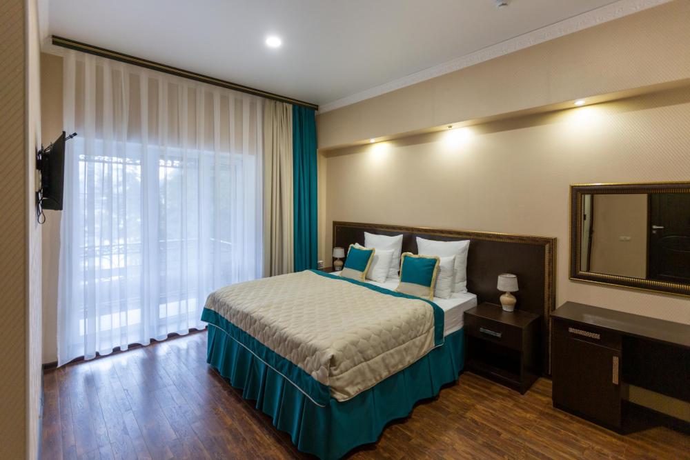 Изысканный, просторный и элегантный номер, выполненный в интерьере для максимально комфортного двухместного размещения. Номер данной категории состоит из двух комнат: спальни и гостиной. В номере имеется спальная зона с удобной двуспальной кроватью, рабочая зона с функциональным рабочим столом, гостиная зона с диваном и двумя креслами, столиком, и ванная комната с расслабляющей ванной. Особенностью в этих номерах является объединенный балкон, позволяющий насладиться красивым видом. Номера данной категории с видом на поселок, канатную дорогу и вершину Мусса-Ачитара или на уютный внутренний двор отеля и вершину Белалакая.