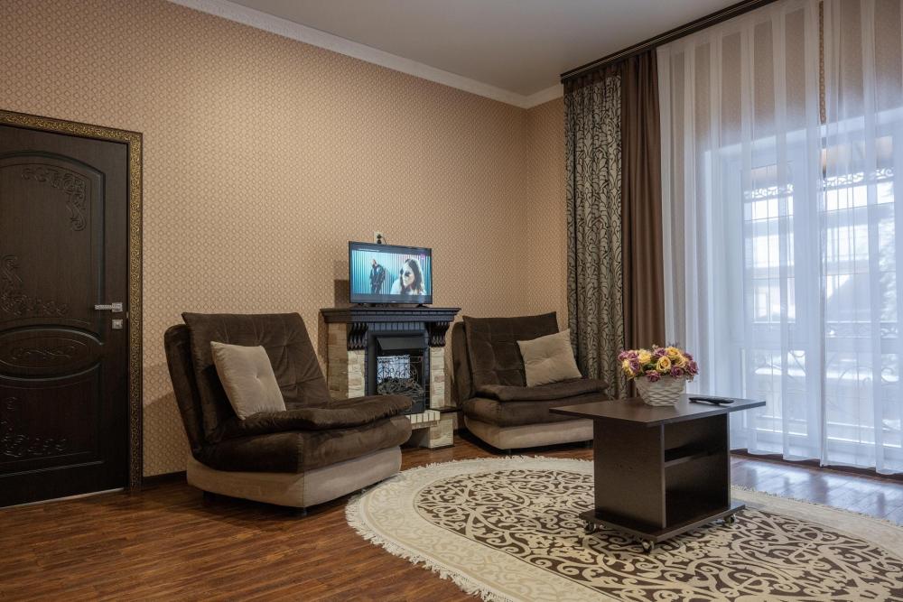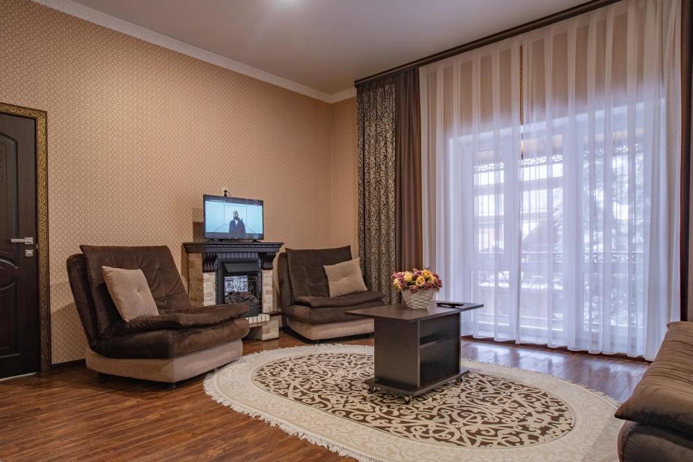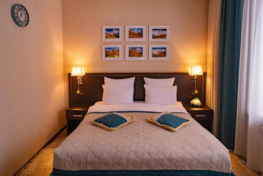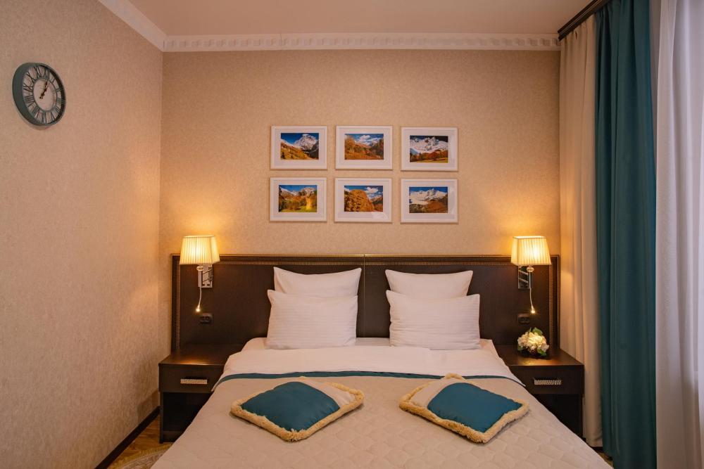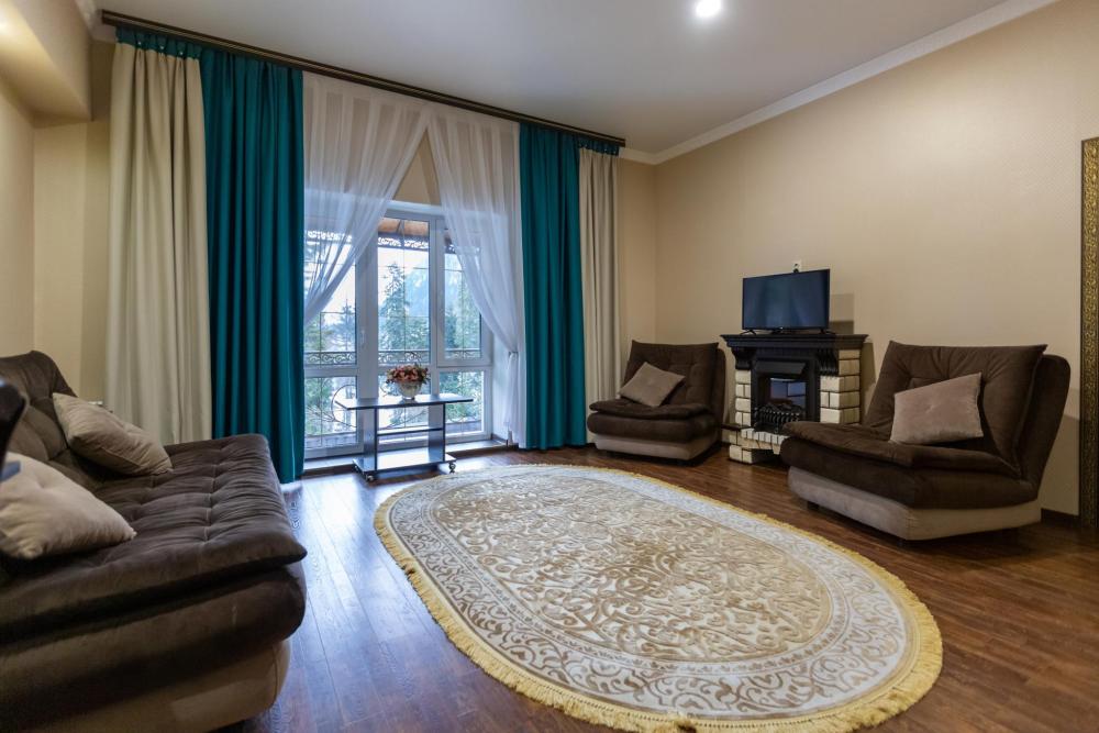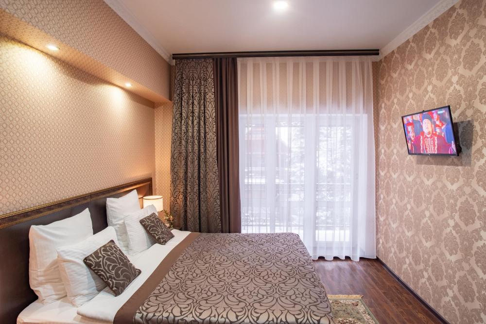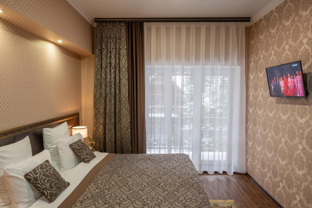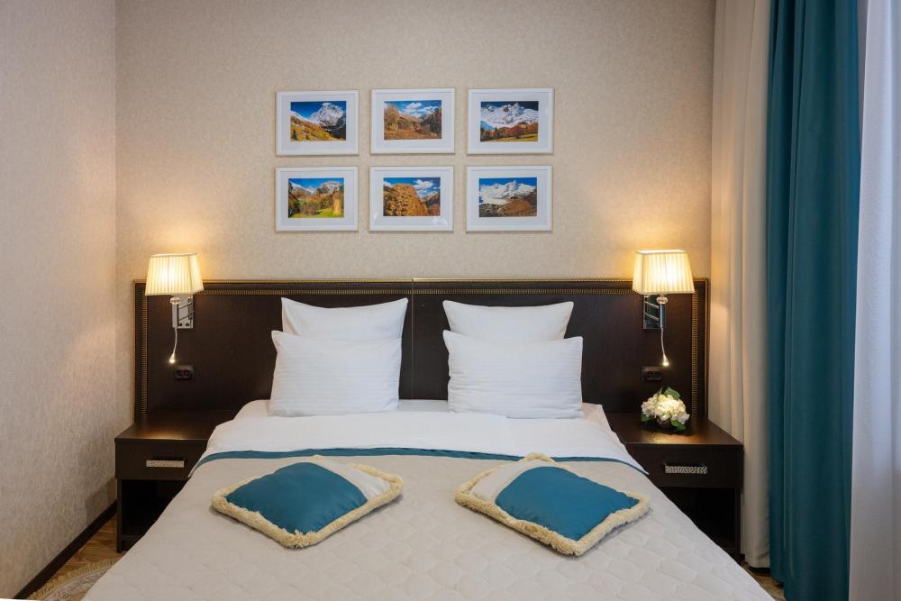 Изысканный, просторный и элегантный номер, выполненный в интерьере для максимально комфортного двухместного размещения. Номер данной категории состоит из двух комнат: спальни и гостиной. В номере имеется спальная зона с удобной двуспальной кроватью, рабочая зона с функциональным рабочим столом, гостиная зона с диваном и двумя креслами, столиком, и ванная комната с расслабляющей ванной. Особенностью в этих номерах является объединенный балкон, позволяющий насладиться красивым видом. Номера данной категории с видом на поселок, канатную дорогу и вершину Мусса-Ачитара или на уютный внутренний двор отеля и вершину Белалакая.