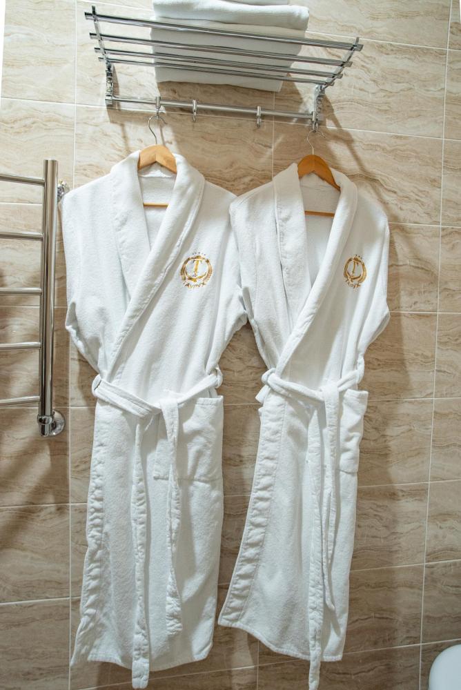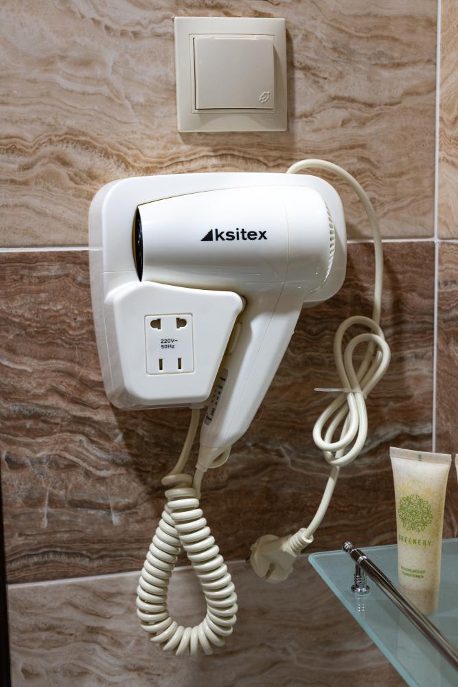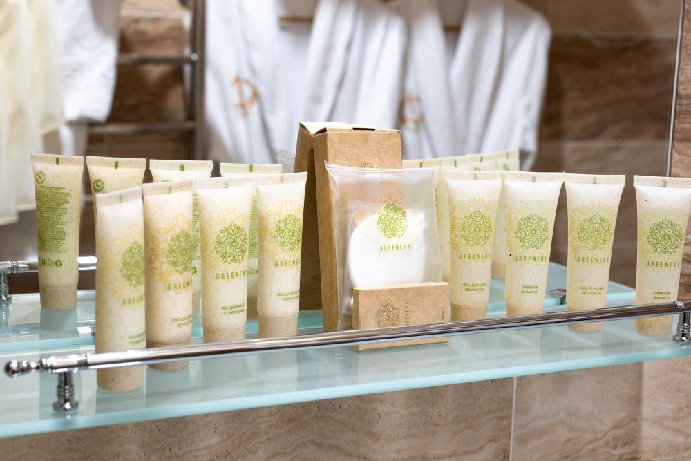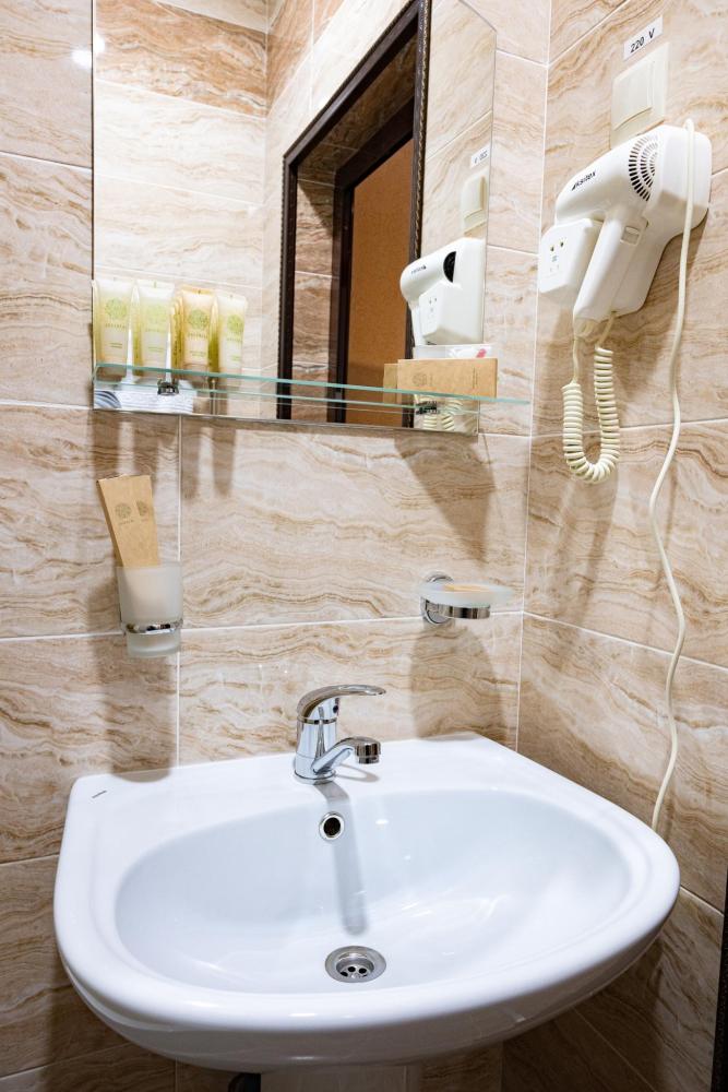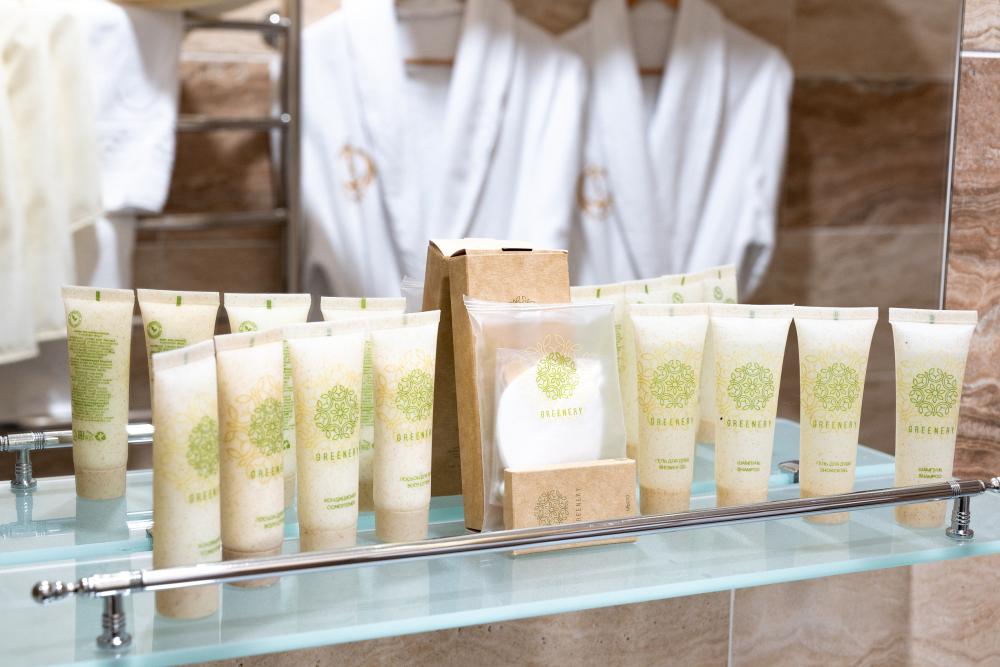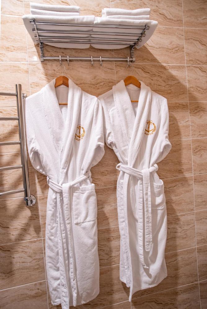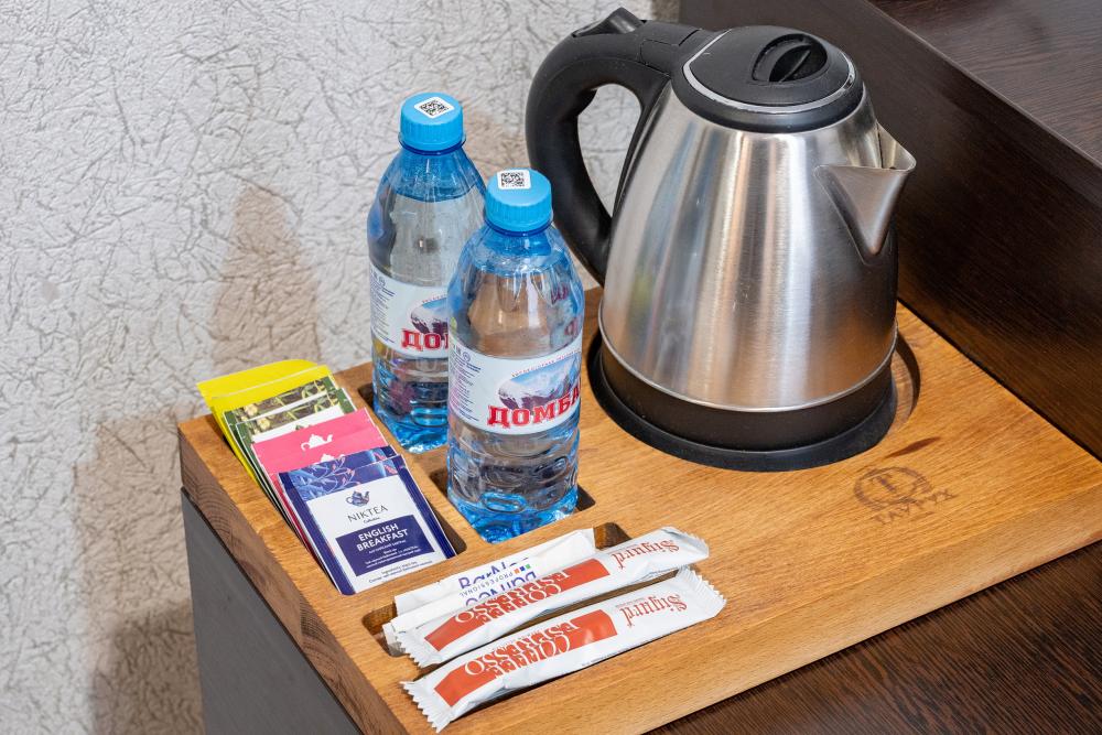 В номере две односпальные кровати. В номерах есть всё необходимое: полотенца, тапочки, косметические средства, стаканы, бутылка воды.