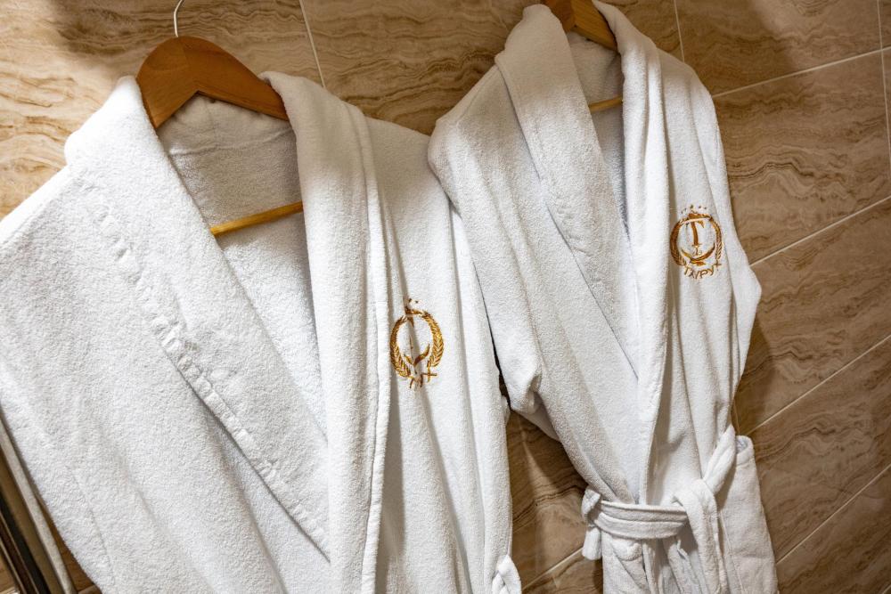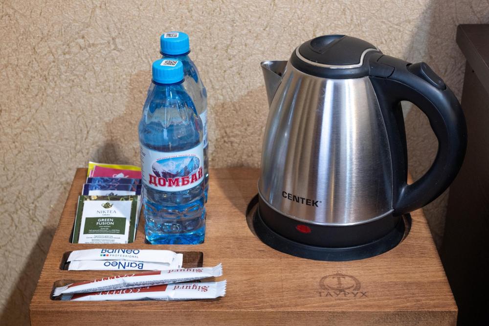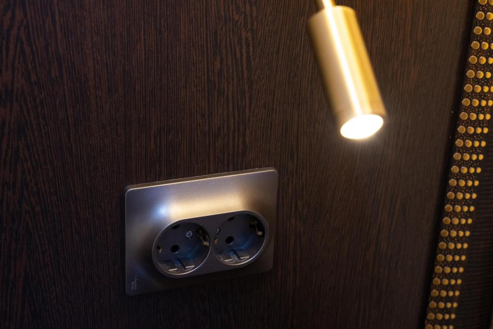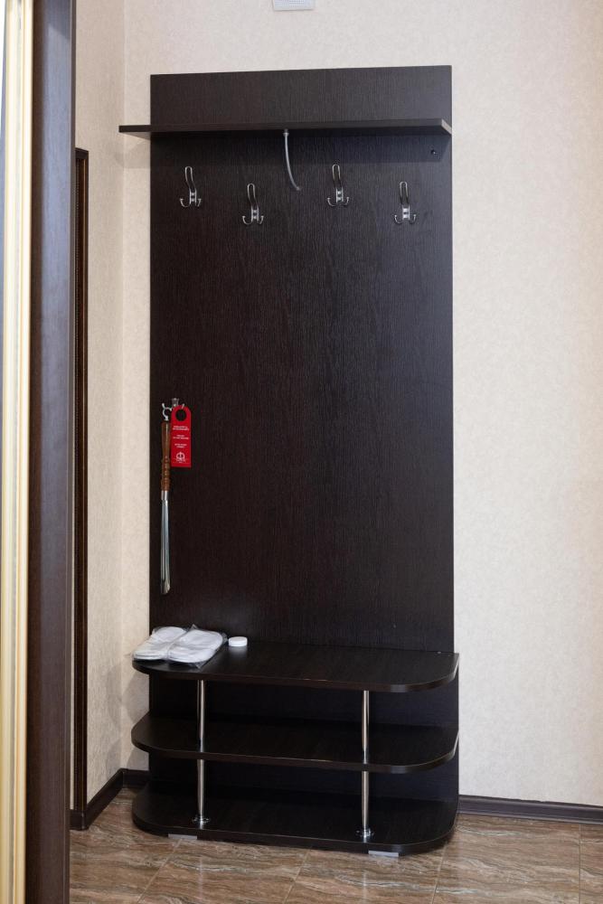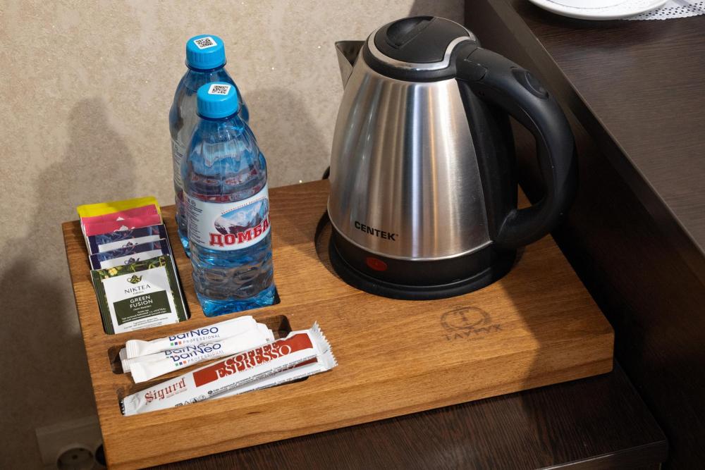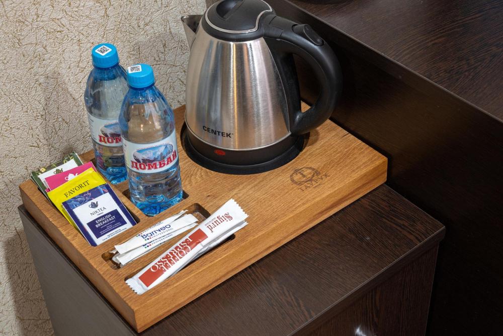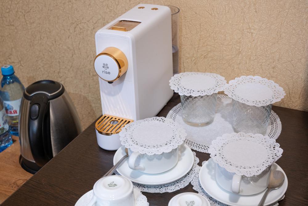 В номере две односпальные кровати. В номерах есть всё необходимое: полотенца, тапочки, косметические средства, стаканы, бутылка воды.