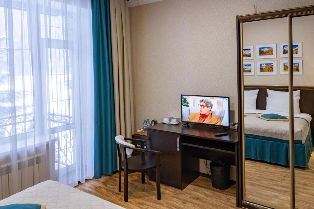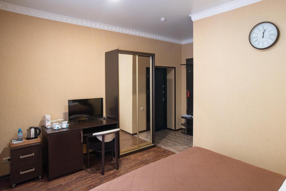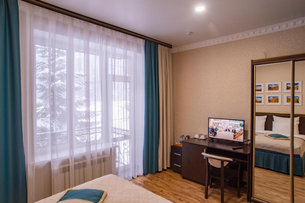 Однокомнатный номер, выполненный в уютном интерьере для 2-местного размещения, находится в Основном корпусе на 1 этаже. В номере имеется спальная зона с удобной двуспальной кровать с ортопедическим матрацем, прикроватные тумбы, шкаф-купе с зеркалом, рабочий стол и стул, LED телевизор диагональю 32 дюйма, 20 каналов TV, вешалка для верхней одежды, полка для обуви, ванная комната. Отопление - батарея, теплый пол. Вместимость до 2 человек + один ребенок до 6 лет с предоставлением спального места. В стоимость номера входит завтрак, парковка, WiFi.