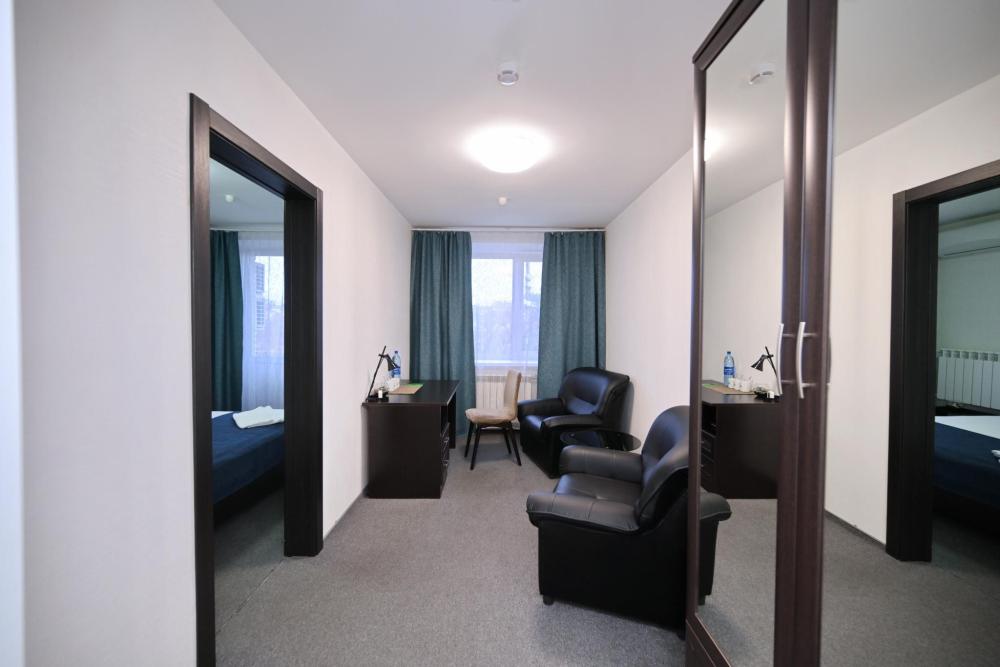 Современный двухкомнатный номер со спальней и гостиной. Номер оснащен широкой кроватью QUEEN SIZE и эргономичной рабочей зоной. В гостиной комфортные креслами-диванами, телевизор с плоским экраном, бесплатный WIFI. В этом номере есть балкон с видом на город. Классический номер для бизнес туристов. За дополнительную оплату можно заказать дополнительное место для родителей с детьми