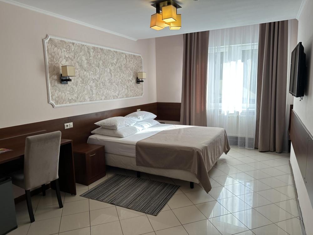 В номере: двуспальная кровать, телевизор, телефон, ванная комната, фен, холодильник, набор одноразовой косметики, бритвенные принадлежности, тапочки, комплект полотенец.