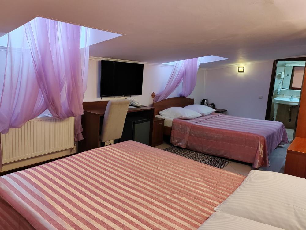 В номере: две раздельные кровати, телевизор, телефон, ванная комната, фен, холодильник, набор одноразовой косметики, бритвенные принадлежности, тапочки, комплект полотенец.